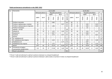 Tabela porównawcza zatrudnienia w roku 2005 i 2012 1) 2) Osoby Etaty Osoby Etaty Ogółem osób 31.05.2012 Niepełnozatrudnieni UMFC WI-P WI-P 0,57 2,35 0,57 4 2,77 10,26 49 33 44 18 53 3 44 1 11 92 18 11 377 44 20 44 15 53 28 4 4 44 3 14 2732) 3 2 10 16 10 1 6 13 1 10 72 1 1 2 6 1 12 2 1 3 29 0,50 0,50 1,0 3,16 0,50 6,74 1,50 0,67 2,02 16,59 1 1 4 1 3 4 14 0,50 0,50 2,12 0,62 1,58 2,16 7,48 47 24 56 2 15 79 1 51 5 10 62 5 31 388 184 120 35 29 16,59 6 3,30 190 WI-P Osoby 14. Profesor zwyczajny Profesor nadzwyczajny z tytułem Profesor nadzwyczajny ze stopniem Profesor wizytujący Adiunkt – dr hab. Adiunkt dr Asystent dr Asystent Docent St. wykładowca dr St. wykładowca bez stopnia Wykładowca dr Wykładowca bez stopnia Razem Pracownik nie będący nauczycielem akademickim Razem zatrudnienie Pełnozatrudnieni UMFC UMFC Etaty 1. 2. 3. 4. 5. 6. 7. 8. 9. 10. 11. 12. 13. 31.05.2005 Niepełnozatrudnieni UMFC WI-P Osoby Pełnozatrudnieni Ogółem osób Stanowisko Etaty Lp. 47 30 35 17 34 2 29 1 6 64 1 8 2741) 1 2 6 1 12 7 5 19 12 65 1 3 3 1 7 3 3 21 0,86 1,96 1,25 0,57 3,74 2,10 1,75 12,23 1 4 1 6 5 17 112 35 27 17,40 10 5,40 561 578 W tym 7 osób zatrudnionych w pełnym wymiarze etatowym na urlopach bezpłatnych W tym 5 osób zatrudnionych w pełnym wymiarze etatowym i jedna osoba w wymiarze ½ etatu na urlopach bezpłatnych 16
