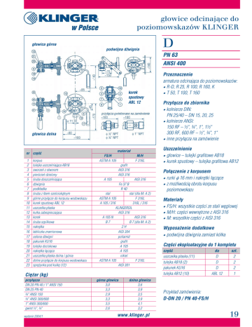 głowice odcinające do poziomowskazów KLINGER głowica górna podwójna dźwignia D PN 63 ANSI 400 kurek spustowy ABL 12 głowica dolna nr część 1 2 3 4 5 6 7 8 9 10 11 12 13 14 15 16 17 18 19 20 21 22 23 korpus tulejka uszczelniająca AB18 sworzeń z otworem pierścień dzielony śruba doszczelniająca dźwignia podkładka śruba z łbem sześciokątnym górne przyłącze do korpusu wodowskazu kurek spustowy ABL 12 uszczelka płaska kulka zabezpieczająca korek śruba szpilkowa nakrętka tabliczka znamionowa osłona dźwigni pakunek KU16 tulejka dociskowa nakrętka łącząca uszczelka płaska dolna i górna dolne przyłącze do korpusu wodowskazu sprężynka pod kulkę (12) materiał FS/H ASTM A 105 M/H F 316L grafit AISI 316 AISI 316 A 105 AISI 316 Fe 37 B R 40 stal stal (dla M: A 2) ASTM A 105 F 316L A 105 / 316 316L / 316 KLINGERSIL AISI 316 A 105 N AISI 316 B7 B 7 (dla M: A 2) 2H AISI 304 poliamid grafit A 105 A 105 nikiel ASTM A 105 F 316L AISI 301 Ciężar (kg) przyłącza DN 20 PN 40 / 1" ANSI 150 DN 25 PN 40 ¾" ANSI 150 ¾" ANSI 300/600 1" ANSI 300/600 gwint ½", ¾" wydanie 2004/1 górna głowica 3,0 3,3 2,9 3,3 3,5 2,6 dolna głowica 3,6 3,9 3,5 3,9 4,1 3,2 www.klinger.pl Przeznaczenie armatura odcinająca do poziomowskazów: • R-D, R 25, R 100, R 160, K • T 50, T 100, T 160 Przyłącza do zbiornika • kołnierze DIN: PN 25/40 – DN 15, 20, 25 • kołnierze ANSI: 150 RF – ½", ¾", 1", 1½" 300 RF, 600 RF – ½", ¾", 1" • inne przyłącza na zamówienie Uszczelnienie • głowice – tulejki grafitowe AB18 • kurek spustowy – tulejka grafitowa AB12 Połączenie z korpusem • rurki φ 16 mm i nakrętki łączące • z możliwością obrotu korpusu poziomowskazu Materiały • FS/H: wszystkie części ze stali węglowej • M/H: części wewnętrzne z AISI 316 • M: wszystkie części z AISI 316 Wyposażenie dodatkowe • podwójna dźwignia zamiast kółka Części eksploatacyjne do 1 kompletu część uszczelka płaska (11) tulejka AB18 (2) pakunek KU16 tulejka AB12 (10) do D D D ABL 12 szt. 2 2 2 1 Przykład zamówienia: D-DN 20 / PN 40-FS/H 19
