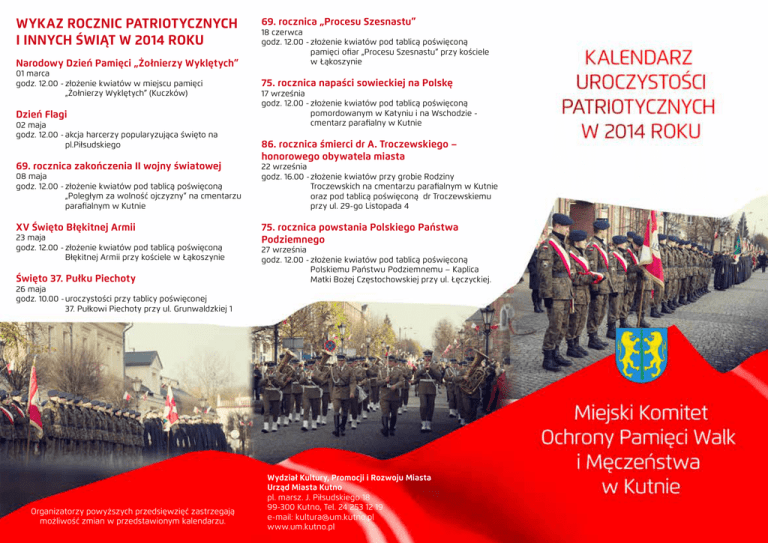 WYKAZ ROCZNIC PATRIOTYCZNYCH I INNYCH ŚWIĄT W 2014 ROKU Narodowy Dzień Pamięci „Żołnierzy Wyklętych” 01 marca godz. 12.00 -złożenie kwiatów w miejscu pamięci „Żołnierzy Wyklętych” (Kuczków) Dzień Flagi 02 maja godz. 12.00 -akcja harcerzy popularyzująca święto na pl.Piłsudskiego 69. rocznica zakończenia II wojny światowej 08 maja godz. 12.00 -złożenie kwiatów pod tablicą poświęconą „Poległym za wolność ojczyzny” na cmentarzu parafialnym w Kutnie XV Święto Błękitnej Armii 23 maja godz. 12.00 -złożenie kwiatów pod tablicą poświęconą Błękitnej Armii przy kościele w Łąkoszynie Święto 37. Pułku Piechoty 26 maja godz. 10.00 -uroczystości przy tablicy poświęconej 37. Pułkowi Piechoty przy ul. Grunwaldzkiej 1 Organizatorzy powyższych przedsięwzięć zastrzegają możliwość zmian w przedstawionym kalendarzu. 69. rocznica „Procesu Szesnastu” 18 czerwca godz. 12.00 -złożenie kwiatów pod tablicą poświęconą pamięci ofiar „Procesu Szesnastu” przy kościele w Łąkoszynie 75. rocznica napaści sowieckiej na Polskę 17 września godz. 12.00 -złożenie kwiatów pod tablicą poświęconą pomordowanym w Katyniu i na Wschodzie cmentarz parafialny w Kutnie 86. rocznica śmierci dr A. Troczewskiego – honorowego obywatela miasta 22 września godz. 16.00 -złożenie kwiatów przy grobie Rodziny Troczewskich na cmentarzu parafialnym w Kutnie oraz pod tablicą poświęconą dr Troczewskiemu przy ul. 29-go Listopada 4 75. rocznica powstania Polskiego Państwa Podziemnego 27 września godz. 12.00 -złożenie kwiatów pod tablicą poświęconą Polskiemu Państwu Podziemnemu – Kaplica Matki Bożej Częstochowskiej przy ul. Łęczyckiej. Wydział Kultury, Promocji i Rozwoju Miasta Urząd Miasta Kutno pl. marsz. J. Piłsudskiego 18 99-300 Kutno, Tel. 24 253 12 19 e-mail: [email protected] www.um.kutno.pl 74. rocznica Zbrodni Katyńskiej DZIEŃ PAMIĘCI OFIAR ZBRODNI KATYŃSKIEJ 13 kwietnia godz. 10.00 - msza św. w Sanktuarium Maryjnym w Głogowcu, uroczystości przy pomniku katyńskim 223. rocznica uchwalenia Konstytucji 3 Maja ŚWIĘTO NARODOWE TRZECIEGO MAJA 03 maja godz. 10.00 - msza św. w kościele św. Wawrzyńca, uroczystość na pl. Wolności 70. rocznica wybuchu Powstania Warszawskiego NARODOWY DZIEŃ PAMIĘCI POWSTANIA WARSZWSKIEGO 01 sierpnia Uroczystość na cmentarzu parafialnym w Kutnie: godz. 16.00 -msza św. w kaplicy, godz. 17.00 -uroczystość przy tablicy poświęconej „Poległym za wolność ojczyzny” 75. rocznica Bitwy nad Bzurą 94. rocznica Bitwy Warszawskiej ŚWIĘTO WOJSKA POLSKIEGO 15 sierpnia godz. 10.00 -msza św. w kościele św. Wawrzyńca, uroczystości na cmentarzu parafialnym w Kutnie 34. rocznica podpisania Porozumień Gdańskich DZIEŃ SOLIDARNOŚCI I WOLNOŚCI 31 sierpnia godz. 11.00 - złożenie kwiatów pod „Ulotką” godz. 12.00 -msza św. w Sanktuarium Maryjnym w Głogowcu 20 września godz. 10.00 -msza święta przy Muzeum Bitwy nad Bzurą w Parku Wiosny Ludów 96. rocznica odzyskania niepodległości przez Polskę NARODOWE ŚWIĘTO NIEPODLEGŁOŚCI 11 listopada godz. 10.00 - msza św. w kościele św. Wawrzyńca, godz. 11.00 -uroczystość na pl. Piłsudskiego 33. rocznica wprowadzenia stanu wojennego 13 grudnia godz. 12.00 -złożenie kwiatów pod „Ulotką” godz. 16.00 -msza św. w Sanktuarium Maryjnym w Głogowcu 75. rocznica wybuchu II Wojny Światowej DZIEŃ WETERANA 01 września godz. 12.00 -uroczystość przy pomniku Bohaterów Walk nad Bzurą w Parku Miejskim im. R. Traugutta GŁÓWNE UROCZYSTOŚCI PATRIOTYCZNE Miejski Komitet Ochrony Pamięci Walk i Męczeństwa w Kutnie został powołany Zarządzeniem Prezydenta Miasta w dniu 20 stycznia 2011 roku. MKOPWiM organizuje uroczystości patriotyczne i rocznicowe oraz koordynuje działalność organizacji kombatanckich i społecznych. Ponadto wspiera inicjatywy upamiętniające wydarzenia historyczne, miejsca oraz ludzi związanych z walką i męczeństwem narodu polskiego oraz sprawuje opiekę nad miejscami pamięci narodowej. W skład komitetu wchodzą przedstawiciele środowisk i organizacji kombatanckich, stowarzyszeń lokalnych, duchowieństwa, harcerstwa oraz instytucji kultury.
