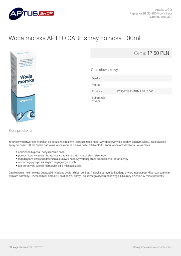 Apteka z Gór Papieska 39, 33-300 Nowy Sącz +48 882 004 443 Woda morska APTEO CARE spray do nosa 100ml Cena: 17,50 PLN Opis słownikowy Dawka - Postać - Producent SYNOPTIS PHARMA SP. Z O.O. Substancja czynna - Opis produktu zotoniczny roztwór soli morskiej do codziennej higieny i oczyszczania nosa. Wyrób sterylny dla osób w każdym wieku. Opakowanie: spray do nosa 100 ml Skład: naturalna woda morska o zawartości 0,9% chlorku sodu, woda oczyszczona. Wskazania: codzienna higiena i oczyszczanie nosa pomocniczo w czasie nieżytu nosa, zapalenia zatok oraz kataru siennego łagodząco w czasie podrażnienia śluzówki nosa wywołanej przez przeziębienie, katar sienny wspomagająco po zabiegach laryngologicznych Dla dorosłych, dzieci i niemowląt od 6 miesiąca życia Dawkowanie: Niemowlęta powyżej 6 miesiąca życia i dzieci do 6 lat: 1 dawka sprayu do każdego otworu nosowego, kilka razy dziennie, w miarę potrzeby. Dzieci od 6 lat dorośli: 1 do 3 dawek sprayu do każdego otworu nosowego, kilka razy dziennie, w miarę potrzeby. Plik wygenerowano: 08-03-2017 Powered by TCPDF (www.tcpdf.org) Oprogramowanie sklepu: AptusShop