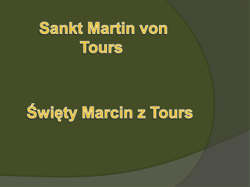 Marcin z Tours żył w latach od 316 do 397r. Urodził się w Sabarii, czyli dzisiejszej Szambathely. W wieku 15 lat został Rzymskim legionistą. 4 lipca 371 roku otrzymał święcenia kapłańskie i sakrę biskupią. Marcin zimą gdy napotkał półnagiego żebraka, oddał mu połowę swojej żołnierskiej opończy. W nocy po tym zdarzeniu w swoim śnie zobaczył Chrystusa odzianego w jego płaszcz, który mówił do aniołów: "Patrzcie, jak mnie Marcin, katechumen, przyodział". "Jak Święty Marcin pomógł żebrakowi" Dzisiaj święty Marcin wjechał do Poznania, Aby wszystkim dzieciom od wczesnego rana, Rozdawać świeżutkie, drożdżowe rogale, Żeby polskie dziadki wzór z niego brać chciały I chlebem z ubogim dzielić się umiały. Dawno, dawno temu - przed wielu wiekami, Na Węgierskiej Ziemi(Panonia) rósł Marcinek mały. Matkę miał on zacną, choć poganką była I dlatego chłopca dobroci uczyła. Zaś ojciec - poganin rzymskim był żołnierzem, Przyszłość chłopca widział w legionach z puklerzem. Na Świętego Marcina, każde dziecko to wie, W każdym poznańskim domu rogale się je. Tradycję tę dawną od ponad już wieku, Wprowadził pewien znany, hojny poznański piekarz. Za wzór biorąc patrona parafii swej, Tak jak dobry Marcin umiał dzielić się. Słodkimi, drożdżowymi podkówkami, Które zwą się marcińskimi rogalami, karmił ubogich całego Poznania. Aby wszyscy pamiętali, że Marcinowy siwy koń zgubił podkowę swą, Gdy legionista ten uchodził z Amiens, Tego samego dnia, kiedy u miejskich już bram, Próbie poddał go sam miłosierny Chrystus Pan! Pora kończyć ten wiersz, bo za długi on już, Marcin - żołnierz, a później Marcin biskup z Tours, Za miłość do Boga i do bliźnich swych, Dziś patrzy na nas z nieba, bo to święty ten, Który razu pewnego u bram Amiens. Oddał płaszcz żebrakowi i wzorem dziś jest. Marcin był bardzo dobry człowiekiem, jest on patronem Francji, Jest również patronem dzieci, hotelarzy, jeźdźców, kawalerii, kapeluszników, kowali, krawców, młynarzy, tkaczy, podróżników, więźniów, właścicieli winnic, żebraków i żołnierzy. Wspomnienie liturgiczne w Kościele katolickim obchodzone jest 11 listopada, prawosławni natomiast wspominają św. Marcina 12/25 października[5], tj. 25 października wg. kalendarza gregoriańskiego. Przepis na "ROGALE ŚWIĘTOMARCIŃSKIE" "ROGALE ŚWIĘTOMARCIŃSKIE„- Das MartinshörnchenRezept Ciasto: 1 kg mąki pszennej 40 g (2 łyżki) cukru 50 g drożdży 250 g (1 szklanka) mleka 6 jaj 125 g (0,5 kostki) masła 1Kilo Mehl 40g(2 Eßlöffel)Zucker 50g Hefe 250g (1 Glass Milch) 6 Eier 125g Butter Masa: 125 g (1,5 szklanki) cukru pudru 200 g migdałów lub orzechów śmietana 125g(1,5 Glass) 200g Mandeln oder Sahne Dlaczego gęsi? Warum Gänse? Marcin nie chciał żadnych zaszczytów, ukrył się więc gdzieś w pobliżu gęsiarni. Nic z tego! Gęsi podniosły gęgający harmider, którym zwróciły uwagę na ukrywającego się. I w ten sposób Marcin został biskupem, a gęsi przeszły do historii. Stały się też głównym... daniem w dzień świętego czyli 11 listopada. . Jaki Marcin taka zima, Jeśli na Marcina sucho, to Gody (Boże Narodzenie) z pluchą, Marcin na białym koniu jedzie, Młoda jak jagoda po świętym Marcinie. (czyli stara), Gdy Marcinowa gęś po wodzie, Boże Narodzenie po lodzie, Na Świętego Marcina najlepsza gęsina, Od Świętego Marcina zima się zaczyna. Dziękujemy za uwagę! Wykonali: Dawid Pawlak oraz Adam Kopeć źródła: www.Google.pl www.Wikipedia.pl encyklopedia słownik polsko-niemiecki