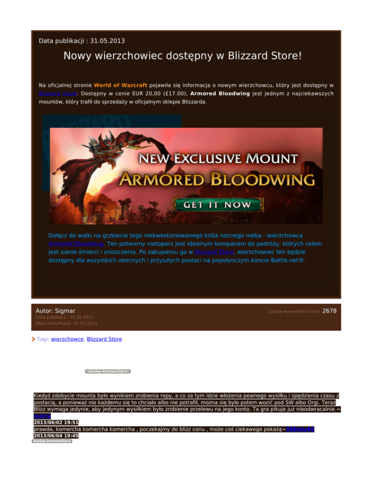 Data publikacji : 31.05.2013 Nowy wierzchowiec dostępny w Blizzard Store! Na oficjalnej stronie World of Warcraft pojawiła się informacja o nowym wierzchowcu, który jest dostępny w Blizzard Store. Dostępny w cenie EUR 20,00 (£17.00), Armored Bloodwing jest jednym z najciekawszych mountów, który trafił do sprzedaży w oficjalnym sklepie Blizzarda. Dołącz do walki na grzbiecie tego niekwestionowanego króla nocnego nieba - wierzchowca Armored Bloodwing. Ten potworny nietoperz jest idealnym kompanem do podróży, których celem jest sianie śmierci i zniszczenia. Po zakupieniu go w Blizzard Store, wierzchowiec ten będzie dostępny dla wszystkich obecnych i przyszłych postaci na pojedynczym koncie Battle.net®. Autor: Sigmar Liczba wyświetleń strony: 2678 Data publikacji : 31.05.2013 Data modyfikacji : 31.05.2013 Tagi: wierzchowce, Blizzard Store Komentarz (2) dodaj komentarz Kiedyś zdobycie mounta było wynikiem zrobienia repy, a co za tym idzie włożenia pewnego wysiłku i spędzienia czasu z postacią, a ponieważ nie każdemu się to chciało albo nie potrafił, można się było potem wozić pod SW albo Orgi. Teraz Blizz wymaga jedynie, aby jedynym wysiłkiem było zrobienie przelewu na jego konto. Ta gra pikuje już nieodwracalnie.~ metra 2013/06/02 19:51 prawda, komercha komercha komercha , poczekajmy do blizz conu , może coś ciekawego pokażą~88Bialy88 2013/06/04 19:45 dodaj komentarz Pozostałe nowości Zapowiedź zmian w klasach - Mnich Legion wkroczył w fazę alfa testów w czasie których dostępna jest póki co jedynie lokacja startowa łowców demonów, a my przyglądamy się temu, jakich zmian doczeka się klasa, która stosunkowo niedawno pojawiła się w World of Warcraft. Oto co na najnowszy dodatek Blizzard przygotował dla mnichów.Data publikacji: 24.11.20150 Zapowiedź zmian w klasach - Wojownik Po krótkiej przerwie wracamy z tłumaczeniami blogów poświęconych zmianom, jakie pojawią się w klasach w nadchodzącym dodatku do World of Warcraft. Oto czego powinni spodziewać się wojownicy z Azeroth w LegionieData publikacji: 23.11.20150 Zapowiedź zmian w klasach - Szaman Kolejna zapowiedzieć, która pojawiła się jakiś czas temu na łamach oficjalnej strony społecznościowej dotyczy szamana. Największe zmiany w przypadku tej klasy dotknęły totemy oraz system zasobów specjalizacji Elemental oraz EnhancementData publikacji: 16.11.20150 11 urodziny World of Warcraft World of Warcraft obchodzi już swoje 11 urodziny. Z tej okazji Blizzard przygotował kilka zabawek, które powinny wszystkim przypomnieć sam początek przygody w świecie Azeroth - w rolach głównych Edwin VanCleef, Hogger, murlok oraz Windfury (w wersji nadmuchiwanej).Data publikacji: 16.11.20150 Zapowiedź zmian w klasach - Rycerz śmierci Kolejna zapowiedź opublikowana na łamach oficjalnej strony społecznościowej World of Warcraft poświęcona jest klasie rycerzy śmierci. Poniżej znajdziecie informacje między innymi o ujednoliceniu wszystkich run oraz nowej umiejętności specjalizacji Blood, która została zainspirowana Lordem Marrowgarem z Icecrown Citadel.Data publikacji: 15.11.20150 Wszystkie nowości