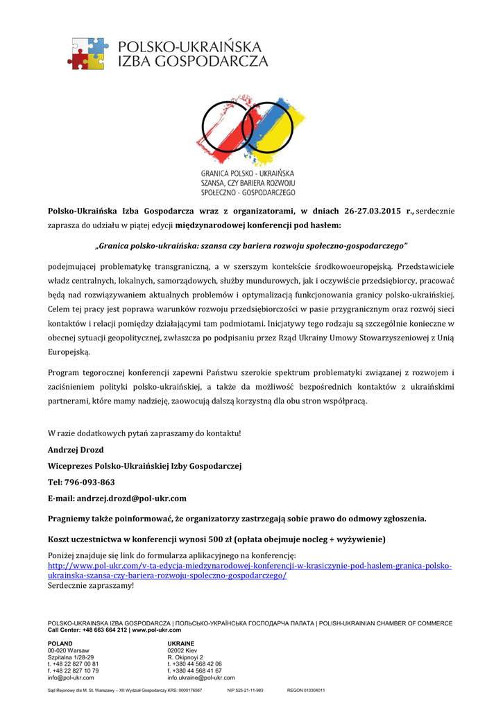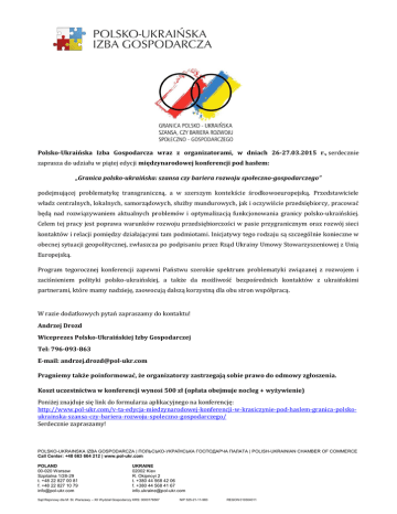 Polsko-Ukraińska Izba Gospodarcza wraz z organizatorami, w dniach 26-27.03.2015 r., serdecznie zaprasza do udziału w piątej edycji międzynarodowej konferencji pod hasłem: „Granica polsko-ukraińska: szansa czy bariera rozwoju społeczno-gospodarczego” podejmującej problematykę transgraniczną, a w szerszym kontekście środkowoeuropejską. Przedstawiciele władz centralnych, lokalnych, samorządowych, służby mundurowych, jak i oczywiście przedsiębiorcy, pracować będą nad rozwiązywaniem aktualnych problemów i optymalizacją funkcjonowania granicy polsko-ukraińskiej. Celem tej pracy jest poprawa warunków rozwoju przedsiębiorczości w pasie przygranicznym oraz rozwój sieci kontaktów i relacji pomiędzy działającymi tam podmiotami. Inicjatywy tego rodzaju są szczególnie konieczne w obecnej sytuacji geopolitycznej, zwłaszcza po podpisaniu przez Rząd Ukrainy Umowy Stowarzyszeniowej z Unią Europejską. Program tegorocznej konferencji zapewni Państwu szerokie spektrum problematyki związanej z rozwojem i zaciśnieniem polityki polsko-ukraińskiej, a także da możliwość bezpośrednich kontaktów z ukraińskimi partnerami, które mamy nadzieję, zaowocują dalszą korzystną dla obu stron współpracą. W razie dodatkowych pytań zapraszamy do kontaktu! Andrzej Drozd Wiceprezes Polsko-Ukraińskiej Izby Gospodarczej Tel: 796-093-863 E-mail: [email protected] Pragniemy także poinformować, że organizatorzy zastrzegają sobie prawo do odmowy zgłoszenia. Koszt uczestnictwa w konferencji wynosi 500 zł (opłata obejmuje nocleg + wyżywienie) Poniżej znajduje się link do formularza aplikacyjnego na konferencję: http://www.pol-ukr.com/v-ta-edycja-miedzynarodowej-konferencji-w-krasiczynie-pod-haslem-granica-polskoukrainska-szansa-czy-bariera-rozwoju-spoleczno-gospodarczego/ Serdecznie zapraszamy! POLSKO-UKRAINSKA IZBA GOSPODARCZA | ПОЛЬСЬКО-УКРАЇНСЬКА ГОСПОДАРЧА ПАЛАТА | POLISH-UKRAINIAN CHAMBER OF COMMERCE Call Center: +48 663 664 212 | www.pol-ukr.com POLAND 00-020 Warsaw Szpitalna 1/28-29 t. +48 22 827 00 81 f. +48 22 827 10 79 [email protected] UKRAINE 02002 Kiev R. Okipnoyi 2 t. +380 44 568 42 06 f. +380 44 568 41 67 [email protected] Sąd Rejonowy dla M. St. Warszawy – XII Wydział Gospodarczy KRS: 0000176567 NIP 525-21-11-983 REGON 010304011