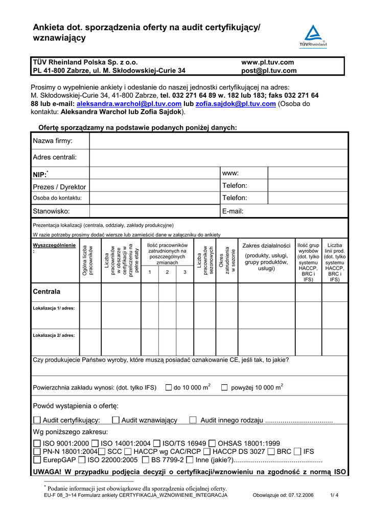 Ankieta dot. sporządzenia oferty na audit certyfikujący/ wznawiający