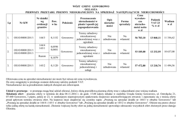 Lp 1. 2. 3. WÓJT GMINY GOWOROWO OGŁASZA PIERWSZY PRZETARG PISEMNY NIEOGRANICZONY NA SPRZEDAŻ NASTĘPUJĄCYCH NIERUCHOMOŚCI Cena Nr działki Przeznaczenie wywoławOpis Podatek wg Pow. nieruchomości w Forma cza Wadium Nr KW Położenie nieruchoVAT 23 ewidencji w ha planie i sposób jej sprzedaży nieruchow zł mości % w zł gruntów zagospodarowania mości netto w zł Tereny zabudowy mieszkaniowej Nie Na OS1O/00081201/1 144/3 0,1152 Goworowo 56 783,10 13 060,11 11 356,62 jednorodzinnej wraz z zabudowana własność ogrodami 144/4 0,0598 Tereny zabudowy 145/1 0,0481 OS1O/00081201/1 mieszkaniowej Nie Na Goworowo 53 185,00 12 232,55 10 637,00 OS1O/00081201/1 jednorodzinnej wraz z zabudowana własność ogrodami Razem 0,1079 Tereny zabudowy mieszkaniowej Nie Na OS1O/00081201/1 145/2 0,1120 Goworowo 57 472,80 13 218,74 11 494,56 jednorodzinnej i zabudowana własność usługi Oferowana cena na sprzedaż nieruchomości nie może być niższa niż cena wywoławcza. Do ceny osiągniętej w przetargu zostanie doliczony należny podatek VAT. Nieruchomości nie są przedmiotem żadnych obciążeń ani zobowiązań. Udział w przetargu – w przetargu mogą brać udział oferenci, którzy złożą prawidłową pisemną ofertę wraz z załącznikami oraz wniosą wadium. Składanie ofert – pisemne oferty w terminie do dnia 04.11.2016 r. do godz. 15.00 należy składać w siedzibie Urzędu Gminy Goworowo, ul. Ostrołęcka 21, 07-440 Goworowo, I piętro, pokój nr 23, w zamkniętym nieprzejrzystym opakowaniu (kopercie) uniemożliwiającym otwarcie i zapoznanie się z treścią oferty przed upływem terminu otwarcia ofert. Na kopercie musi znajdować się czytelny napis: „Przetarg na sprzedaż działki nr 144/3 w obrębie Goworowo” lub „Przetarg na sprzedaż działki nr 144/4 i 145/1 w obrębie Goworowo” lub „Przetarg na sprzedaż działki nr 145/2 w obrębie Goworowo”. Oferent ma prawo złożyć tylko jedną ofertę na każdą nieruchomość. Złożenie większej liczby ofert na jedną nieruchomość spowoduje odrzucenie wszystkich ofert złożonych przez danego Oferenta. 1 Pisemna oferta winna zawierać: - imię, nazwisko i adres oferenta albo nazwę lub firmę oraz siedzibę, jeżeli oferentem jest osoba prawna lub inny podmiot, - datę sporządzenia oferty, - oświadczenie, że oferent zapoznał się z warunkami przetargu i przyjmuje je bez zastrzeżeń, - oferowaną cenę i sposób jej zapłaty, - kopię dowodu wpłaty wadium, - w przypadku uczestnictwa w przetargu osoby prawnej – aktualny wypis z właściwego dla danego podmiotu rejestru. W przypadku reprezentowania osoby prawnej przez pełnomocnika oprócz aktualnego wypisu przedłożenie pełnomocnictwa upoważniającego do działania na każdym etapie postępowania przetargowego , - w przypadku uczestnictwa w przetargu pełnomocnika osoby fizycznej – pełnomocnictwo upoważniające do działania na każdym etapie postępowania przetargowego, - ofertę należy podpisać. Termin i miejsce wniesienia wadium – warunkiem przystąpienia do przetargu jest wpłacenie wadium najpóźniej do dnia 04.11.2016 r. na konto Urzędu Gminy Goworowo Nr 17 8915 0003 0000 0912 2000 0030 z dopiskiem „Wadium – przetarg na sprzedaż działki nr 144/3 w obrębie Goworowo” lub „Wadium – przetarg na sprzedaż działki nr 144/4 i 145/1 w obrębie Goworowo” lub „Wadium – przetarg na sprzedaż działki nr 145/2 w obrębie Goworowo”. Za datę wniesienia wadium uważa się wpływ wymaganej kwoty na ww. rachunek. Przetarg (część jawna) odbędzie się w obecności oferentów w dniu 08.11.2016 r. w siedzibie Urzędu Gminy Goworowo przy ul. Ostrołęckiej 21, I piętro, sala nr 16.: na działkę nr 144/3 o godzinie 10.15, na działki nr 144/4 i 145/1 o godzinie 10.30, na działkę nr 145/2 o godzinie 10.45. Przetarg jest ważny bez względu na liczbę uczestników, jeżeli wpłynie co najmniej jedna oferta spełniająca warunki określone w ogłoszeniu o przetargu. Wadium wpłacone przez oferenta, który wygra przetarg, zostanie zaliczone na poczet ceny nabycia ustalonej w przetargu, pozostałym uczestnikom zwraca się niezwłocznie po zamknięciu przetargu, nie później niż przed upływem 3 dni roboczych od dnia zamknięcia przetargu. Wadium nie ulega zwrotowi uczestnikowi, który przetarg wygrał i uchyla się od zawarcia umowy sprzedaży. Zgodnie z art. 41 ust. 2 ustawy z dnia 21 sierpnia 1997 r. o gospodarce nieruchomościami (t.j. Dz. U. z 2015 r. poz. 1774 z późn. zm.) jeżeli osoba ustalona jako nabywca nieruchomości nie przystąpi bez usprawiedliwienia do zawarcia umowy w miejscu i w terminie podanych w zawiadomieniu organizator przetargu może odstąpić od zawarcia umowy, a wpłacone wadium nie podlega zwrotowi. Wójtowi Gminy Goworowo przysługuje prawo zamknięcia przetargu bez wybrania którejkolwiek z ofert. Przewodniczący komisji przetargowej zawiadomi na piśmie uczestników przetargu o jego wyniku w terminie 3 dni od dnia zamknięcia przetargu. Wpłata ceny wynikającej z wygranego przetargu musi zostać dokonana jednorazowo przed zawarciem umowy sprzedaży nieruchomości na wskazane oferentowi konto. 2 Informacje dodatkowe: 1. Okazanie granic nieruchomości nastąpi na zlecenie i koszt nabywcy. 2. Opłaty notarialne i sądowe związane z zawarciem umowy w formie aktu notarialnego oraz dokonaniem wpisów do księgi wieczystej w całości ponosi nabywca nieruchomości. 3. Ceny nieruchomości zostały podwyższone o 10% ich wartości na podstawie § 7 ust. 5 pkt 1 uchwały Nr XII/76/08 Rady Gminy Goworowo z dnia 27 lutego 2008 roku w sprawie określenia zasad nabywania, zbywania i obciążania nieruchomości oraz ich wydzierżawienia lub wynajmowania na czas oznaczony dłuższy niż 3 lata lub na czas nieoznaczony ( Dz. U. Województwa Mazowieckiego Nr 90, poz. 3243). Ogłoszenie o przetargu wywiesza się na tablicy ogłoszeń Urzędu Gminy Goworowo w budynku przy ul. Ostrołęckiej 21 oraz umieszcza się na stroni