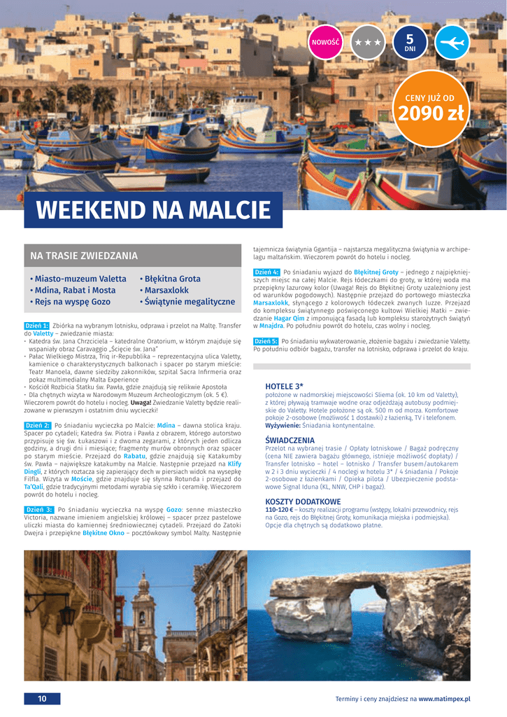 NOWOŚĆ 5 DNI CENY JUŻ OD 2090 zł WEEKEND NA MALCIE tajemnicza świątynia Ggantija – najstarsza megalityczna świątynia w archipelagu maltańskim. Wieczorem powrót do hotelu i nocleg. NA TRASIE ZWIEDZANIA •Miasto-muzeum Valetta •Mdina, Rabat i Mosta •Rejs na wyspę Gozo •Błękitna Grota •Marsaxlokk •Świątynie megalityczne Dzień 1: Zbiórka na wybranym lotnisku, odprawa i przelot na Maltę. Transfer do Valetty – zwiedzanie miasta: • Katedra św. Jana Chrzciciela – katedralne Oratorium, w którym znajduje się wspaniały obraz Caravaggio „Ścięcie św. Jana” • Pałac Wielkiego Mistrza, Triq ir-Repubblika – reprezentacyjna ulica Valetty, kamienice o charakterystycznych balkonach i spacer po starym mieście: Teatr Manoela, dawne siedziby zakonników, szpital Sacra Infirmeria oraz pokaz multimedialny Malta Experience • Kościół Rozbicia Statku św. Pawła, gdzie znajdują się relikwie Apostoła • Dla chętnych wizyta w Narodowym Muzeum Archeologicznym (ok. 5 €). Wieczorem powrót do hotelu i nocleg. Uwaga! Zwiedzanie Valetty będzie realizowane w pierwszym i ostatnim dniu wycieczki! Dzień 2: Po śniadaniu wycieczka po Malcie: Mdina – dawna stolica kraju. Spacer po cytadeli; Katedra św. Piotra i Pawła z obrazem, którego autorstwo przypisuje się św. Łukaszowi i z dwoma zegarami, z których jeden odlicza godziny, a drugi dni i miesiące; fragmenty murów obronnych oraz spacer po starym mieście. Przejazd do Rabatu, gdzie znajdują się Katakumby św. Pawła – największe katakumby na Malcie. Następnie przejazd na Klify Dingli, z których roztacza się zapierający dech w piersiach widok na wysepkę Filfla. Wizyta w Moście, gdzie znajduje się słynna Rotunda i przejazd do Ta’Qali, gdzie tradycyjnymi metodami wyrabia się szkło i ceramikę. Wieczorem powrót do hotelu i nocleg. Dzień 3: Po śniadaniu wycieczka na wyspę Gozo: senne miasteczko Victoria, nazwane imieniem angielskiej królowej – spacer przez pastelowe uliczki miasta do kamiennej średniowiecznej cytadeli. Przejazd do Zatoki Dwejra i przepiękne Błękitne Okno – pocztówkowy symbol Malty. Następnie 10 Dzień 4: Po śniadaniu wyjazd do Błękitnej Groty – jednego z najpiękniejszych miejsc na całej Malcie. Rejs łódeczkami do groty, w której woda ma przepiękny lazurowy kolor (Uwaga! Rejs do Błękitnej Groty uzależniony jest od warunków pogodowych). Następnie przejazd do portowego miasteczka Marsaxlokk, słynącego z kolorowych łódeczek zwanych luzze. Przejazd do kompleksu świątynnego poświęconego kultowi Wielkiej Matki – zwiedzanie Hagar Qim z imponującą fasadą lub kompleksu starożytnych świątyń w Mnajdra. Po południu powrót do hotelu, czas wolny i nocleg. Dzień 5: Po śniadaniu wykwaterowanie, złożenie bagażu i zwiedzanie Valetty. Po południu odbiór bagażu, transfer na lotnisko, odprawa i przelot do kraju. HOTELE 3* położone w nadmorskiej miejscowości Sliema (ok. 10 km od Valetty), z której pływają tramwaje wodne oraz odjeżdżają autobusy podmiejskie do Valetty. Hotele położone są ok. 500 m od morza. Komfortowe pokoje 2-osobowe (możliwość 1 dostawki) z łazienką, TV i telefonem. Wyżywienie: Śniadania kontynentalne. ŚWIADCZENIA Przelot na wybranej trasie / Opłaty lotniskowe / Bagaż podręczny (cena NIE zawiera bagażu głównego, istnieje możliwość dopłaty) / Transfer lotnisko – hotel – lotnisko / Transfer busem/autokarem w 2 i 3 dniu wycieczki / 4 noclegi w hotelu 3* / 4 śniadania / Pokoje 2-osobowe z łazienkami / Opieka pilota / Ubezpieczenie podstawowe Signal Iduna (KL, NNW, CHP i bagaż). KOSZTY DODATKOWE 110-120 € – koszty realizacji programu (wstępy, lokalni przewodnicy, rejs na Gozo, rejs do Błękitnej Groty, komunikacja miejska i podmiejska). Opcje dla chętnych są dodatkowo płatne. Terminy i ceny znajdziesz na www.matimpex.pl
