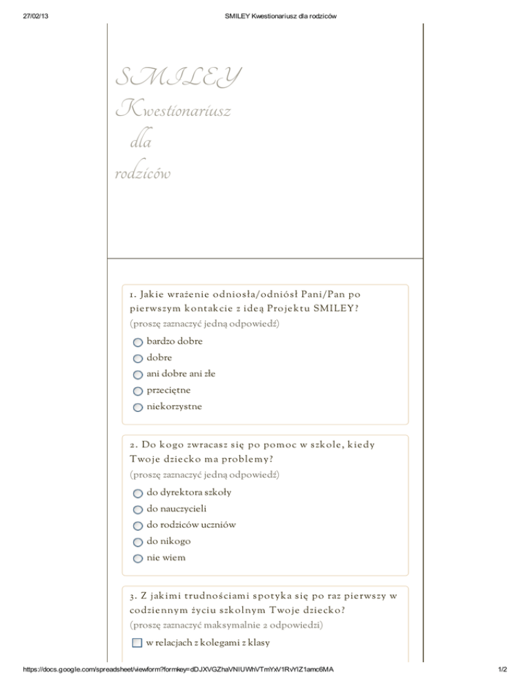 27/02/13 SMILEY Kwestionariusz dla rodziców SMILEY Kwestionariusz dla rodziców 1. Jak ie wraże nie o dnio s ła/o dnió s ł Pani/Pan po pie rws zym k o ntak cie z ide ą Pro je k tu SM I LEY? (proszę zaznaczyć jedną odpowiedź) bardzo dobre dobre ani dobre ani złe przeciętne niekorzystne 2 . Do k o go zwracas z s ię po po m o c w s zk o le , k ie dy Two je dzie ck o m a pro b le m y? (proszę zaznaczyć jedną odpowiedź) do dyrektora szkoły do nauczycieli do rodziców uczniów do nikogo nie wiem 3 . Z jak im i trudno ś ciam i s po tyk a s ię po raz pie rws zy w co dzie nnym życiu s zk o lnym Two je dzie ck o ? (proszę zaznaczyć maksymalnie 2 odpowiedzi) w relacjach z kolegami z klasy https://docs.google.com/spreadsheet/viewform?formkey=dDJXVGZhaVNlUWhVTmYxV1RvYlZ1amc6MA 1/2 27/02/13 SMILEY Kwestionariusz dla rodziców w relacjach z nauczycielami z trudnościami w nauce z dyskryminacją rasową z dyskryminacją religijną nie wiem 4. Czy Two je dzie ck o m ó wi Ci o co dzie nnych wydarze niach m ających m ie js ce w s zk o le ? tak, gdyż jest to ważne tak, jednak nie czuję się kompetentna/y w tym temacie tak, jednak muszę przekonywać je aby mi coś powiedziało nie, gdyż nie jest to ważne nie wiem 5. Do jak ich ce ló w Two je dzie ck o wyk o rzys tuje k o m pute r? (proszę zaznaczyć maksymalnie 2 odpowiedzi) do odrabiania lekcji dla rozrywki w celu komunikacji z kolegami z klasy w celu znalezienia informacji w celu poznania nowych przyjaciół nie wiem 6. Czy Two je dzie ck o chę tnie ucze s tniczy w działaniach s po łe cznych o rganizo wanych prze z s zk o łę ? tak, gdyż jest to ważne tak, lecz bez entuzjazmu tak, lecz muszę przekonywać je do zaangażowania się nie, nie angażuje się, gdyż nie jest to ważne nie wiem Submit Powered by Google Docs Report Abuse - Terms of Service - Additional Terms https://docs.google.com/spreadsheet/viewform?formkey=dDJXVGZhaVNlUWhVTmYxV1RvYlZ1amc6MA 2/2