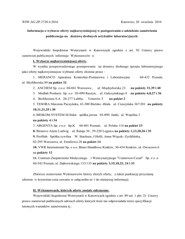 Katowice, 20 września 2016 WIW.AG.ZP.2720.4.2016 Informacja o wyborze oferty najkorzystniejszej w postępowaniu o udzielenie zamówienia publicznego na dostawę drobnych artykułów laboratoryjnych. Wojewódzki Inspektorat Weterynarii w Katowicach zgodnie z art. 92 Ustawy prawo zamówień publicznych informuje Wykonawców o: I. Wyborze najkorzystniejszej oferty. W wyniku przeprowadzonego postepowania na dostawy drobnego sprzętu laboratoryjnego jako oferty najkorzystniejsze wybrano oferty złożone przez : 60-432 Poznań, 1. MERANCO Aparatura Kontrolno-Pomiarowa i Laboratoryjna ul. Myśliborska 89 na pakiet 32 2. ANCHEM Sp. z.o.o 04-041 Warszawa , ul. Międzyborska 23 3. Medlab Products Sp. z.o 05-090 Raszyn, ul. Gałczyńskiego 8 4. BioMaxima S.A 20-277 Lublin, Vetterów 5 na pakiety 31,39 i 40 na pakiety 6,8,27 i 36 na pakiet 2 5. TESORA Marzena Paczyńska, 43-300 Bielsko -Biała ul. Cieszyńska 367/201 na pakiety 10,11,21,25 i 30 6. BIOKOM SYSTEM M.Sidor spółka jawna 05-090 Janki, ul. Wspólna 3 na pakiety 4 i 34 7. ARGENTA Sp. z o.o Sp.K 60-401 Poznań, ul. Polska 114 na pakiet 23 8. Bionovo Aneta Ludwig ul. Rataja 30 , 59-220 Legnica na pakiety 1,13,20,26 i 35 9. Profilab Spółka cywilna W. Stachura, J.Holli, Anna Wiącek- Zychlińska, 02-295 Warszawa, ul. Emaliowa 28 na pakiet 14 10. VWR International Sp. z o.o. Biuro Handlowe Kraków, 30-434 Kraków, ul. Owocowa 6 na pakiety 12 11. Centrum Zaopatrzenia Medycznego i Weterynaryjnego "Centrowet-Cezal" Sp. z o .o 60-543 Poznań, ul. Dąbrowskiego 133/135 na pakiety 3,15,18,22, 24 i 33 Zbiorcze zestawienie Wykonawców którzy złożyli oferty, a także punktację przyznaną ofertom w kryterium cena zawarto w załączniku nr 1 do niniejszej informacji. II. Wykonawcach, których oferty zostały odrzucone: Wojewódzki Inspektorat Weterynarii w Katowicach zgodnie z art. 89 ust. 1 pkt. 2) Ustawy prawo zamówień publicznych odrzucił oferty których treść nie odpowiadała treści specyfikacji istotnych warunków zamówienia tj.: 1. ofertę firmy TESORA Marzena Paczyńska, 43-300 Bielsko -Biała ul. Cieszyńska 367/201 złożoną na pakiet 22 – Zamawiający w Opisie przedmiotu zamówienia wyspecyfikował: Worki do Stomachera poj. 400 ml z siatką na całej powierzchni worka, dzielone asymetrycznie. Wykonawca zaoferował worki do stomachera bez siatki. 2. ofertę firmy ARGENTA Sp. z o.o Sp.K 60-401 Poznań, ul. Polska 114 złożoną na pakiet 7 – Zamawiający w opisie przedmiotu zamówienia w poz. 1 i 2 wyspecyfikował : Końcówki jednorazowe pasujące do pipet automatycznych Finntip, o długości nie mniejszej niż 10,5cm o pojemności 1ml, Wykonawca zaoferował końcówki o długości 7,8 cm 3. ofertę firmy Bionovo Aneta Ludwig ul. Rataja 30 , 59-220 Legnica złożoną na pakiet 5 Zamawiający w opisie przedmiotu zamówienia w poz.4 wyspecyfikował: Kolby Erlenmayera z szeroką szyjką z zakrętką, z PP, autoklawowalne w121 °C o poj.500 ml. , Wykonawca zaoferował kolby szklane. 4. ofertę firmy VWR International Sp. z o.o. Biuro Handlowe Kraków, 30-434 Kraków złożoną na: - pakiet 5 – w pozycji zamówienia w poz.4 wyspecyfikował: Kolby Erlenmayera z szeroką szyjką z zakrętką, z PP, autoklawowalne w121 °C o poj.500 ml., Wykonawca zaoferował kolby, dla których rekomendowana temperatura czyszczenia nie powinna przekraczać 60°C . - pakiet 22 Zamawiający w Opisie przedmiotu zamówienia wyspecyfikował: Worki do Stomachera poj. 400 ml z siatką na całej powierzchni worka, dzielone asymetrycznie. Wykonawca, w odpowiedzi na wezwanie Zamawiającego do wyjaśnień treści złożonej oferty, poinformował, że informujemy że nie może jednoznacznie potwierdzić wymaganego parametru. III. Unieważnieniu postępowania: Wojewódzki Inspektorat Weterynarii w Katowicach zgodnie z art. 93 ust. 1 pkt. 1) Ustawy prawo zamówień publicznych unieważnił postępowanie dla pakietów: 5,7, 9,16,17,19,28,29,37,38 i 41 ponieważ nie złożono żadnej oferty niepodlegającej odrzuceniu. Załącznik nr 1. Ocena i porównanie złożonych ofert ( punktacja)