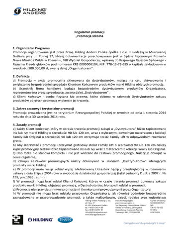 Regulamin promocji „Promocja szkolna 1. Organizator Programu Promocja organizowana jest przez firmę Hilding Anders Polska Spółka z o.o. z siedzibą w Murowanej Goślinie przy ul. Polnej 17, której dokumentacja przechowywana jest w Sądzie Rejonowym Poznań– Nowe Miasto i Wilda w Poznaniu, VIII Wydział Gospodarczy, wpisaną do Krajowego Rejestru Sądowego Rejestru Przedsiębiorców pod numerem KRS 0000006104, NIP: 778-13-73-655 o kapitale zakładowym w wysokości 500.000,00 zł, zwaną dalej „Organizatorem”. 2. Definicje a) Promocja – akcja promocyjna skierowana do dystrybutorów, mająca na celu aktywowanie i zwiększenie bezpośredniej sprzedaży Klientom Końcowym produktów marki Hilding objętych promocją. b) Uczestnik firma handlowa będąca bezpośrednim dystrybutorem produktów Organizatora, reprezentowana przez sprzedawcę, zwana dalej „Dystrybutorem”. c) Klient Końcowy - osoba fizyczna lub prawna, która dokona w salonach Dystrybutorów zakupu produktów objętych promocją w okresie jej trwania. 3. Zakres czasowy i terytorialny promocji Promocja prowadzona jest na terytorium Rzeczypospolitej Polskiej w terminie od dnia 1 sierpnia 2014 roku do dnia 30 września 2014 roku. 4. Zasady promocji a) każdy Klient Końcowy, który w okresie trwania promocji zakupi u „Dystrybutora” łóżko tapicerowane Iris lub Ivy marki Hilding o szerokości 90 lub 120 cm, wraz z wybranym, dowolnym materacem z kolekcji Family lub Original o szerokości 90 lub 120 cm otrzymuje stelaż Family Lift w odpowiednim rozmiarze gratis. b) Aby skorzystać z promocji i otrzymać gratisowy stelaż Family Lift o szerokości 90 lub 120 cm należy kupić promocyjny zestaw łóżko tapicerowane Iris lub Ivy wraz z materacem z kolekcji Family lub Original. c) Dno łóżka nie stanowi kompletu i nie jest wliczane do zestawu promocyjnego. Należy je dokupić w cenie regularnej. d) Zakupu zestawów promocyjnych należy dokonywać w salonach „Dystrybutorów” oferujących produkty marki Hilding. e) W promocji może wziąć udział wyżej zdefiniowany Uczestnik będący przedsiębiorcą w rozumieniu ustawy z dnia 2 lipca 2004 roku o swobodzie działalności gospodarczej (tekst jednolity Dz.U. z 2007 r. Nr 155, poz.1095 ze zm.). f) W promocji mogą brać udział Klienci Końcowi, którzy w czasie trwania promocji dokonają zakupu produktu marki Hilding, objętego promocją, u Dystrybutorów, biorących udział w promocji. g) Promocja nie łączy się z innymi promocjami i konkursami prowadzonymi przez Organizatora. h) W promocji nie mogą brać udziału pracownicy Organizatora, jak również podmioty bezpośrednio zaangażowane w przeprowadzenie promocji, a także małżonkowie, dzieci, rodzice oraz rodzeństwo wyżej wskazanych osób. 5. Reklamacje a) Wszelkie reklamacje i zastrzeżenia dotyczące przebiegu i organizacji Promocji mogą być składane w formie pisemnej na adres e-mail: [email protected] w ciągu 14 dni od zakończenia Promocji. b) Złożone reklamacje będą rozpatrywane przez Organizatora niezwłocznie, jednakże nie później niż w terminie 10 dni roboczych od daty otrzymania reklamacji. Przy rozpoznawaniu reklamacji Organizator opiera się na treści niniejszego Regulaminu oraz na przepisach polskiego prawa, w szczególności Kodeksu Cywilnego. Decyzje Organizatora w przedmiocie reklamacji są ostateczne i wiążące. Po wyczerpaniu postępowania reklamacyjnego Uczestnikowi przysługuje prawo do dochodzenia nieuwzględnionych roszczeń w sądzie powszechnym właściwym ze względu na siedzibę Organizatora. c) Wszelkie pytania dotyczące Promocji należy kierować na adres e-mail: [email protected] 6. Postanowienia końcowe a) Treść niniejszego Regulaminu dostępna jest w siedzibie Organizatora, w salonach Dystrybutorów oraz na stronie www.hilding.pl. b) Organizator zastrzega sobie prawo do zmian bądź uzupełnienia warunków niniejszego regulaminu, w tym w szczególności do zmiany terminów prowadzenia Promocji, a także przedłużenia, skrócenia, bądź przerwania Promocji w każdym czasie. Wszelkie zmiany dotyczące Promocji, jak również nowa treść Regulaminu dostępne będę w siedzibie Organizatora oraz na stronie www.hilding.pl. c) Zasady przeprowadzania Promocji określa niniejszy Regulamin. W sprawach nie objętych postanowieniami niniejszego regulaminu stosuje się właściwe przepisy prawa polskiego. d) Udział w Promocji jest dobrowolny. e) Klient biorący udział w Promocji akceptuje warunki niniejszego regulaminu.