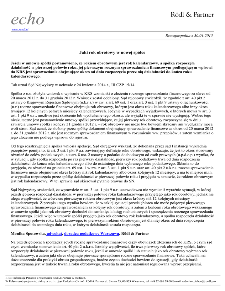 echo www.roedl.pl Rzeczpospolita z 30.01.2015 Jaki rok obrotowy w nowej spółce Jeżeli w umowie spółki postanowiono, że rokiem obrotowym jest rok kalendarzowy, a spółka rozpoczęła działalność w pierwszej połowie roku, jej pierwszym rocznym sprawozdaniem finansowym podlegającym wpisowi do KRS jest sprawozdanie obejmujące okres od dnia rozpoczęcia przez nią działalności do końca roku kalendarzowego. Tak uznał Sąd Najwyższy w uchwale z 24 kwietnia 2014 r., III CZP 15/14. Spółka z o.o. złożyła wniosek o wpisanie w KRS wzmianki o złożeniu rocznego sprawozdania finansowego za okres od 20 marca 2012 r. do 31 grudnia 2012 r. Wniosek został oddalony. Sąd rejonowy stwierdził, że zgodnie z art. 40 pkt 2 ustawy o Krajowym Rejestrze Sądowym (u.k.r.s.) w zw. z art. 69 ust. 1 oraz art. 3 ust. 1 pkt 9 ustawy o rachunkowości (u.r.) roczne sprawozdanie finansowe obejmuje rok obrotowy, którym jest okres roku kalendarzowego albo inny okres trwający 12 kolejnych pełnych miesięcy kalendarzowych. Jedynie w wypadkach wyjątkowych, o których mowa w art. 3 ust. 1 pkt 9 u.r., możliwe jest skrócenie lub wydłużenie tego okresu, ale wyjątki te w sprawie nie występują. Wobec tego nieskuteczne jest postanowienie umowy spółki przewidujące, że jej pierwszy rok obrotowy rozpoczyna się w dniu zawarcia umowy spółki i kończy 31 grudnia 2012 r. – rok obrotowy nie może być bowiem skracany ani wydłużany mocą woli stron. Sąd uznał, że złożony przez spółkę dokument obejmujący sprawozdanie finansowe za okres od 20 marca 2012 r. do 31 grudnia 2012 r. nie jest rocznym sprawozdaniem finansowym w rozumieniu ww. przepisów, a zatem wzmianka o jego złożeniu nie podlega wpisowi do rejestru. Od tego rozstrzygnięcia spółka wniosła apelację. Sąd okręgowy wskazał, że dokonana przez sąd I instancji wykładnia przepisów pomija to, iż art. 3 ust.1 pkt 9 u.r. zawierający definicję roku obrotowego, wskazuje, że jest to okres stosowany również do celów podatkowych, a z art. 8 ust. 2 ustawy o podatku dochodowym od osób prawnych (u.p.d.o.p.) wynika, że w sytuacji, gdy spółka rozpoczęła po raz pierwszy działalność, pierwszy rok podatkowy trwa od dnia rozpoczęcia działalności do końca roku kalendarzowego albo do ostatniego dnia wybranego roku podatkowego. Skłania to do przyjęcia, że również na gruncie art. 69 ust. 1 w zw. z art. 3 ust. 1 pkt 9 u.r. oraz art. 40 pkt 2 u.k.r.s. roczne sprawozdanie finansowe może obejmować okres krótszy niż rok kalendarzowy albo okres kolejnych 12 miesięcy, a ma to miejsce m.in. w wypadku rozpoczęcia przez spółkę działalności w pierwszej połowie roku i przyjęcia w umowie, że rokiem obrotowym jest rok kalendarzowy. W tej sprawie sąd skierował pytanie prawne do SN. Sąd Najwyższy stwierdził, że wprawdzie w art. 3 ust. 1 pkt 9 u.r. ustawodawca nie wymienił wyraźnie sytuacji, w której przedsiębiorca rozpoczął działalność w pierwszej połowie roku kalendarzowego przyjętego jako rok obrotowy, jednak nie ulega wątpliwości, że wówczas pierwszym rokiem obrotowym jest okres krótszy niż 12 kolejnych miesięcy kalendarzowych. Z przepisu tego wynika bowiem, że w takiej sytuacji przedsiębiorca nie może połączyć pierwszego sprawozdania finansowego ze sprawozdaniem za kolejny rok obrotowy, a zatem z końcem roku obrotowego wskazanego w umowie spółki jako rok obrotowy dochodzi do zamknięcia ksiąg rachunkowych i sporządzenia rocznego sprawozdania finansowego. Jeżeli więc w umowie spółki przyjęto jako rok obrotowy rok kalendarzowy, a spółka rozpoczęła działalność w pierwszej połowie roku kalendarzowego, to pierwszym rokiem obrotowym jest dla niej okres od dnia rozpoczęcia działalności do ostatniego dnia roku, w którym działalność została rozpoczęta. Monika Spotowska, adwokat, doradca podatkowy Warszawa, Rödl & Partner Na przedsiębiorcach sporządzających roczne sprawozdanie finansowe ciąży obowiązek złożenia ich do KRS, o czym sąd czyni wzmiankę stosownie do art. 40 pkt 2 u.k.r.s. Istniały wątpliwości, ile trwa pierwszy rok obrotowy spółek, które rozpoczęły działalność w pierwszej połowie roku, jeżeli w umowie spółki lub statucie jako rok obrotowy wybrano rok kalendarzowy, a zatem jaki okres obejmuje pierwsze sporządzane roczne sprawozdanie finansowe. Taka uchwała ma duże znaczenie dla praktyki obrotu gospodarczego, bardzo często dochodzi bowiem do sytuacji, gdy działalność rozpoczynana jest w trakcie trwania roku obrotowego, kwestia ta nie jest natomiast regulowana wprost przepisami. echo informuje Państwa o wizerunku Rödl & Partner w mediach. W Polsce osobą odpowiedzialną za echo jest Radosław Cichoń Rödl & Partner ul. Sienna 73, 00-833 Warszawa, tel. +48 22 696 28 00 E-mail: [email protected] Z regulacji art. 3 ust. 1 pkt 9 u.r. wynika, że rok obrotowy powinien się pokrywać z rokiem podatkowym oraz że zasadą jest 12-miesięczny rok obrotowy. Od zasady 12-miesięcznego roku obrotowego przewidziano wyjątki: dłuższy niż 12 miesięcy rok obrotowy, jeżeli nastąpiła zmiana roku obrotowego określonego w umowie lub statucie, a także gdy działalność została rozpoczęta w drugiej połowie przyjętego jako rok obrotowy roku kalendarzowego i wybrano możliwość połączenia okresu sprawozdawczego z kolejnym rokiem obrotowym, oraz krótszy niż 12 miesięcy rok obrotowy, jeżeli działalność została rozpoczęta w drugiej połowie roku kalendarzowego przyjętego jako rok obrotowy i nie połączono okresu sprawozdawczego z kolejnym rokiem obrotowym. W art. 3 ust. 1 pkt 9 u.r. nie przewidziano jednak, co się dzieje, gdy działalność zostanie rozpoczęta w pierwszej połowie roku kalendarzowego przyjętego jako rok obrotowy. Taką regulację zawiera natomiast ustawa o podatku dochodowym od osób prawnych. Z art. 8 ust. 1 ust. 2 u.p.d.o.p. wynika wprost, że w przypadku podjęcia po raz pierwszy działalności pierws