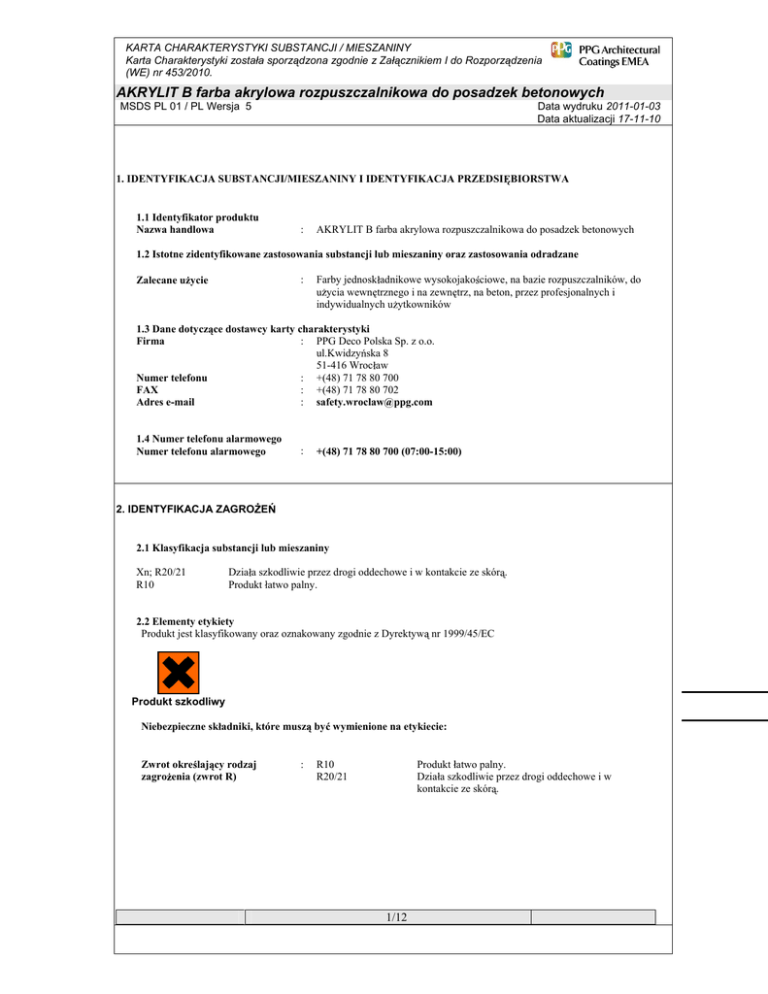 KARTA CHARAKTERYSTYKI SUBSTANCJI / MIESZANINY Karta Charakterystyki zosta a sporz dzona zgodnie z Za cznikiem I do Rozporz dzenia (WE) nr 453/2010. AKRYLIT B farba akrylowa rozpuszczalnikowa do posadzek betonowych MSDS PL 01 / PL Wersja 5 Data wydruku 2011-01-03 Data aktualizacji 17-11-10 1. IDENTYFIKACJA SUBSTANCJI/MIESZANINY I IDENTYFIKACJA PRZEDSI BIORSTWA 1.1 Identyfikator produktu Nazwa handlowa : AKRYLIT B farba akrylowa rozpuszczalnikowa do posadzek betonowych 1.2 Istotne zidentyfikowane zastosowania substancji lub mieszaniny oraz zastosowania odradzane : Zalecane u ycie Farby jednosk adnikowe wysokojako ciowe, na bazie rozpuszczalników, do u ycia wewn trznego i na zewn trz, na beton, przez profesjonalnych i indywidualnych u ytkowników 1.3 Dane dotycz ce dostawcy karty charakterystyki : PPG Deco Polska Sp. z o.o. Firma ul.Kwidzy ska 8 51-416 Wroc aw : +(48) 71 78 80 700 Numer telefonu : +(48) 71 78 80 702 FAX : [email protected] Adres e-mail 1.4 Numer telefonu alarmowego Numer telefonu alarmowego : +(48) 71 78 80 700 (07:00-15:00) 2. IDENTYFIKACJA ZAGRO E 2.1 Klasyfikacja substancji lub mieszaniny Xn; R20/21 R10 Dzia a szkodliwie przez drogi oddechowe i w kontakcie ze skór . Produkt atwo palny. 2.2 Elementy etykiety Produkt jest klasyfikowany oraz oznakowany zgodnie z Dyrektyw nr 1999/45/EC Produkt szkodliwy Niebezpieczne sk adniki, które musz by wymienione na etykiecie: Zwrot okre laj cy rodzaj zagro enia (zwrot R) : R10 R20/21 Produkt atwo palny. Dzia a szkodliwie przez drogi oddechowe i w kontakcie ze skór . 1/12 KARTA CHARAKTERYSTYKI SUBSTANCJI / MIESZANINY Karta Charakterystyki zosta a sporz dzona zgodnie z Za cznikiem I do Rozporz dzenia (WE) nr 453/2010. AKRYLIT B farba akrylowa rozpuszczalnikowa do posadzek betonowych MSDS PL 01 / PL Wersja 5 Data wydruku 2011-01-03 Data aktualizacji 17-11-10 : Zwroty bezpiecznego post powania - S S2 S23 S36/37 Chroni przed dzie mi. Nie wdycha rozpylonej cieczy Nosi odpowiedni odzie ochronn i odpowiednie r kawice ochronne. W przypadku niedostatecznej wentylacji stosowa odpowiednie indywidualne rodki ochrony dróg oddechowych. W razie po kni cia niezw ocznie zasi gnij porady lekarza - poka opakowanie lub etykiet . S38 S46 2.3 Inne zagro enia Brak dost pnej informacji. 3. SK AD I INFORMACJA O SK ADNIKACH 3.2 Mieszaniny Sk adniki Nr EC Nr CAS Uwaga DSD Klasyfikacja 64742-82-1 Nota H, R10 Nota P N; R51/53 Xn; R65 R66, R67 CLP Klasyfikacja St enie R10 Xn; R20/21 Xi; R38 Flam. Liq.3; H226 4; H332 4; H312 Skin Irrit.2; H315 >=12.50 - <20.00% Benzyna ci ka hydroodsiarczona (ropa naftowa); Niskowrz ca frakcja naftowa obrabiana wodorem ksylen 265-185-4 215-535-7 1330-20-7 etylobenzen 202-849-4 100-41-4 F; R11 Xn; R20 Flam. Liq.2; H225 4; H332 >=2.50 - <10.00% Benzyna ci ka obrabiana wodorem 265-150-3 64742-48-9 Nota H, R10 Nota P Xn; R65 R66 1B; H350 Muta.1B; H340 Asp. Tox.1; H304 >=10.00 - <20.00% Nota C >=1.00 - <2.50% * Lista Kandydacka Substancji o Du ym Znaczeniu dla Autoryzacji Producent wyrobu deklaruje, e dla zwrotów R niewymienionych w punkcie 3 ca kowita zawarto substancji nie przekracza warto ci granicznych.Wed ug deklaracji producentów surowców ca kowita zawarto benzenu < 0,1%. Klasyfikacja z uwzgl dnieniem NOTY H i NOTY P. Je eli pojawia si wiele substancji o jednakowych identyfikatorach, to jednak ró ni si one w asno ciami niebezpiecze stwa np. punkt zap onu. 4. PIERWSZA POMOC 4.1 Opis rodków pierwszej pomocy : Porady ogólne Kontakt z oczami : W przypadku utrzymuj cych si objawów lub jakichkolwiek w tpliwo ci zasi gn porady medycznej. Nigdy nie podawa niczego doustnie osobie nieprzytomnej. Przep ukiwa otwarte oczy obficie czyst , wie wod przynajmniej przez 10 minut. Usun szk a kontaktowe. Zasi gn porady medycznej. 2/12 KARTA CHARAKTERYSTYKI SUBSTANCJI / MIESZANINY Karta Charakterystyki zosta a sporz dzona zgodnie z Za cznikiem I do Rozporz dzenia (WE) nr 453/2010. AKRYLIT B farba akrylowa rozpuszczalnikowa do posadzek betonowych MSDS PL 01 / PL Wersja 5 Data wydruku 2011-01-03 Data aktualizacji 17-11-10 Kontakt przez skór : Wdychanie : Po kni cie : Oparzenia : Natychmiast zdj ska one ubranie. Przemy skór wod z myd em. NIE STOSOWA rozpuszczalników lub rozcie czalników. Wynie na wie e powietrze. Zapewni poszkodowanemu ciep o i spokój. W przypadku nieregularnego lub zatrzymanego oddechu zastosowa sztuczne oddychanie. Osobie nieprzytomnej zapewni pozycj bezpieczn - "boczn ustalon " i zasi gn porady medycznej. W razie przypadkowego po kni cia niezw ocznie zapewni opiek medyczn . Pozostawi w spokoju. NIE prowokowa wymiotów. W przypadku gdy zabrudzenia na ubraniu zapal si , sp uka du ilo ci wody. ci gn / usun lu n odzie . Nie usuwa odzie y, która jest stopiona ze skór .Uzyska pomoc lekarsk . 4.2 Najwa niejsze ostre i opó nione objawy oraz skutki nara enia W przypadku awarii lub je eli le si poczujesz, niezw ocznie zasi gnij porady lekarza - je eli to mo liwe, poka etykiet Przedstawi lekarzowi do czon Kart Charakterystyki produktu. 4.3 Wskazanie natychmiastowej opieki lekarskiej i potrzebnego specjalnego traktowania Nieprzytomnej osobie nigdy nie podawa nic doustnie. Leczy objawowo 5. POST POWANIE W PRZYPADKU PO ARU 5.1 rodki ga nicze Odpowiednie rodki ga nicze rodki ga nicze, które nie mog by u yte ze wzgl dów bezpiecze stwa : : Stosowa zraszanie wod , piany alkoholoodporne, proszki ga nicze lub dwutlenek w gla. Ch odzi zbiorniki i ich otoczenie poprzez zraszanie wod . NIE STOSOWA strumieni wodnych. 5.2 Szczególne zagro enia zwi zane z substancj lub mieszanin : Poniewa produkt zawiera organiczne, palne sk adniki, w czasie po aru Specjalne zagro enia podczas tworzy si b dzie czarny, g sty dym zawieraj cy niebezpieczne produkty zwalczania po aru spalania (patrz pkt 10). Nara enie na dzia anie produktów rozk adu mo e zagra a zdrowiu. Ch odzi zamkni te zbiorniki nara one na ogie poprzez zraszanie wod . Nie dopu ci do przedostania si wody z gaszenia po aru do sieci wodnej lub kanalizacji. 5.3 Informacje dla stra y po arnej