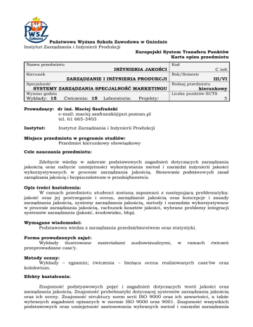 Państwowa Wyższa Szkoła Zawodowa w Gnieźnie Instytut Zarządzania i Inżynierii Produkcji Europejski System Transferu Punktów Karta opisu przedmiotu Nazwa przedmiotu Kod INŻYNIERIA JAKOŚCI Kierunek C io6 Rok/Semestr ZARZĄDZANIE I INŻYNIERIA PRODUKCJI Specjalność III/VI Rodzaj przedmiotu SYSTEMY ZARZĄDZANIA SPECJALNOŚĆ MARKETINGU Wymiar godzin Wykłady: 15 kierunkowy Liczba punktów ECTS Ćwiczenia: 15 Laboratoria: Projekty: 5 Prowadzący: dr inż. Maciej Szafrański e-mail: [email protected] tel. 61 665-3403 Instytut: Instytut Zarządzania i Inżynierii Produkcji Miejsce przedmiotu w programie studiów: Przedmiot kierunkowy obowiązkowy Cele nauczania przedmiotu: Zdobycie wiedzy w zakresie podstawowych zagadnień dotyczących zarządzania jakością oraz nabycie umiejętności wykorzystania metod i narzędzi inżynierii jakości wykorzystywanych w procesie zarządzania jakością. Stosowanie podstawowych zasad zarządzania jakością i bezpieczeństwem w przedsiębiorstwie. Opis treści kształcenia: W ramach przedmiotu studenci zostaną zapoznani z następującą problematyką: jakość oraz jej postrzeganie i ocena, zarządzanie jakością oraz koncepcje i zasady zarządzania jakością, systemy zarządzania jakością, metody i narzędzia wykorzystywane w procesie zarządzania jakością, rachunek kosztów jakości, wybrane problemy integracji systemów zarządzania (jakość, środowisko, bhp). Wymagane wiadomości: Podstawowa wiedza z zarządzania przedsiębiorstwem oraz statystyki. Forma prowadzonych zajęć: Wykłady ilustrowane przeprowadzane case’y. materiałami audiowizualnymi, w ramach ćwiczeń Metody oceny: Wykłady – egzamin; ćwiczenia – bieżąca ocena realizowanych case’ów oraz kolokwium. Efekty kształcenia: Znajomość podstyawowych pojęć i zagadnień dotyczących teorii jakości oraz zarządzania jakością. Znajomość probelmatyki dotyczącej systemów zarządzania jakością oraz ich oceny. Znajomość struktury norm serii ISO 9000 oraz ich zawartości, a także wybranych zagadnień opisanych w normie ISO 9000 oraz 9001. Znajomość wszystkich podstawowych oraz umiejętność zastosowania wybranych metod i narzędzi zarządzania jakością. Umiejętność mapowania prostych procesów. Znajomość elementów ekonomiki jakości oraz umiejętność odniesienia rachunku kosztów jakości do systemu rachunkowości przedsiębiorstwa. Znajomość podstawowej problematyki dotyczącej zintegrowanych systemów zarządzania jakością. Literatura podstawowa: 1. Hamrol A., Mantura Wł.: Zarządzanie jakością. Teoria i praktyka. WN PWN, Warszawa-Poznań 2000 (i kolejne wydania). 2. Hamrol A.: Zarządzanie jakością z przykładami. WN PWN, Warszawa 2005. 3. Normy ISO 9000:2006, ISO 9001:2009, ISO 9004:2010 Literatura uzupełniająca: 1. Obłój K.: Mikroszkółka zarządzania. PWE Warszawa 1997, cz. IV. 2. Szafrański M.: Skuteczność działań w systemach zarządzania jakością. Wyd. PP, Poznań 2006.