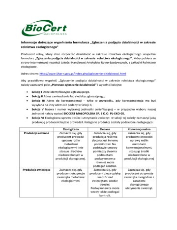 Informacje dotyczące wypełniania formularza „Zgłoszenia podjęcia działalności w zakresie rolnictwa ekologicznego” Producent rolny, który chce rozpocząć działalność w zakresie rolnictwa ekologicznego uzupełnia formularz „Zgłoszenia podjęcia działalności w zakresie rolnictwa ekologicznego”, który pobiera ze strony internetowej Inspekcji Jakości Handlowej Artykułów Rolno-Spożywczych, z zakładki Rolnictwo ekologiczne. Adres strony: http://www.ijhar-s.gov.pl/index.php/zgloszenie-dzialalnosci.html Aby prawidłowo wypełnić „Zgłoszenie podjęcia działalności w zakresie rolnictwa ekologicznego” należy zaznaczyć pole „Pierwsze zgłoszenie działalności” i wypełnić kolejno: Sekcję I Dane identyfikacyjne zgłaszającego, Sekcję II Adres zamieszkania lub siedziby zgłaszającego, Sekcję III Adres do korespondencji – tylko w przypadku, gdy korespondencja ma być wysyłana na inny adres niż podany w Sekcji II, Sekcja V Nazwa i numer wybranej jednostki certyfikującej – w przypadku wyboru naszej jednostki należy wpisać BIOCERT MAŁOPOLSKA SP. Z O.O. PL-EKO-05, Sekcja VI Ekologiczna uprawa roślin i utrzymanie zwierząt: w sekcji tej należy zaznaczyć jaką produkcję producent będzie prowadził. Kategorie produkcji zostały podzielone następująco: Produkcja roślinna Produkcja zwierzęca Ekologiczna Zaznacza się, gdy producent prowadzi uprawę roślin metodami ekologicznymi i nie stosuje środków niedozwolonych w produkcji ekologicznej. Zaznacza się, gdy producent utrzymuje zwierzęta metodami ekologicznymi Zlecana Zaznacza się, gdy produkcja roślinna zlecana jest innemu podmiotowi. Na podstawie umowy pomiędzy dwoma podmiotami podwykonawca również może podlegać kontroli. Zaznacza się, gdy producent zleca opiekę i nadzór nad zwierzętami osobie trzeciej. Podwykonawca może wtedy także podlegać kontroli. Konwencjonalna Zaznacza się, gdy producent prowadzi uprawę roślin metodami konwencjonalnymi, stosując środki niedozwolone w produkcji ekologicznej Zaznacza się, gdy producent utrzymuje zwierzęta niezgodnie z zasadami ekologicznego utrzymania zwierząt. Produkcja wegetatywnego materiału rozmnożeniowego i/lub nasion do celów uprawy Zaznacza się, gdy producent prowadzi produkcję materiału siewnego i rozmnożeniowego i znajduje się pod nadzorem PIORiN. Zaznacza się, gdy produkcję materiału siewnego i rozmnożeniowego producent zleca podmiotom trzecim. Zaznacza się, gdy producent prowadzi produkcję materiału siewnego i rozmnożeniowego metodami konwencjonalnymi W dalszej kolejności producent wypełnia datę wypełnienia zgłoszenia oraz (koniecznie!) podpisuje się w polu obok. Musi być to własnoręczny, oryginalny podpis producenta. Niepodpisane „Zgłoszenie podjęcia działalności w zakresie rolnictwa ekologicznego” nie może zostać zarejestrowane, a tym samym producent nie może zostać objęty systemem kontroli i nadzoru. W przypadku podpisania dokumentów przez pełnomocnika bardzo proszę przejść do zakładki Ustanawianie pełnomocnika. Do „Zgłoszenia podjęcia działalności w zakresie rolnictwa ekologicznego” dołączone są dwa załączniki. Załącznik 1 dotyczy obiektów znajdujących się w gospodarstwie. W kolumnie Rodzaj obiektu producent może wpisać np. stodoła, obora, stajnia, owczarnia, kurnik, chlewnia, budynek gospodarczy, budynek inwentarski, magazyn, szklarnia i in. W dalszej kolejności należy wpisać dane dotyczące lokalizacji obiektów: województwo, powiat, gminę oraz dokładny adres pod jakim zlokalizowany jest obiekt. Bardzo ważne jest zaznaczenie, czy obiekt będzie wykorzystywany ekologicznie czy konwencjonalnie. Załącznik 1 i 2 jest weryfikowany przez pracownika jednostki certyfikującej i ważne jest, by wykorzystanie obiektów było spójne z zaznaczonymi kategoriami produkcji. Przykładowo, jeżeli producent zaznaczy produkcję zwierzęcą ekologiczną, zaś budynki inwentarskie będą, zgodnie z Załącznikiem 1, wykorzystywane konwencjonalnie jednostka certyfikująca będzie musiała wezwać producenta do złożenia odpowiednich wyjaśnień. Podobnie w przypadku wykorzystania działek rolnych. W Załączniku 2 producent wyszczególnia wszystkie działki wchodzące w skład gospodarstwa rolnego, zarówno te, na których uprawa prowadzona jest metodami ekologicznymi, jak i konwencjonalnymi. W przypadku, gdy na jednej działce ewidencyjnej prowadzona jest w części produkcja metodami ekologicznymi, a w części konwencjonalnymi, należy w wyraźny sposób rozdzielić powierzchnię na wykorzystywaną ekologicznie i konwencjonalnie. Zwrócić należy jednak uwagę, by nie powtarzały się te same gatunki roślin w części ekologicznej i konwencjonalnej gospodarstwa. Wydanie I z dnia 23.04.2015r.