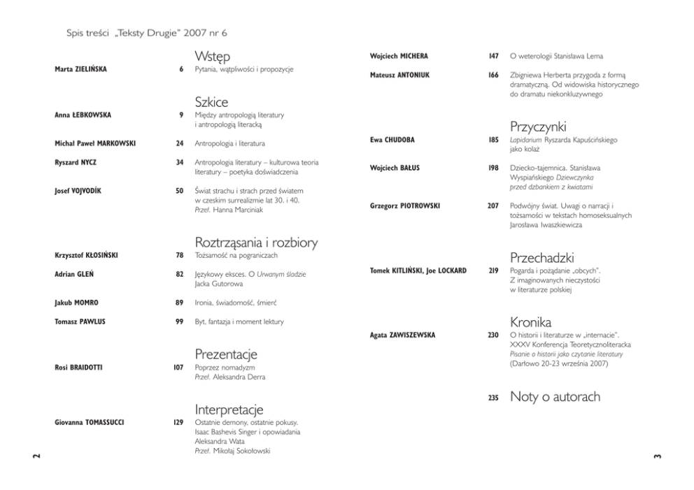 Spis treści „Teksty Drugie” 2007 nr 6 Wstęp Marta ZIELIŃSKA 6 Anna ŁEBKOWSKA 9 Pytania, wątpliwości i propozycje Wojciech MICHERA 147 O weterologii Stanisława Lema Mateusz ANTONIUK 166 Zbigniewa Herberta przygoda z formą dramatyczną. Od widowiska historycznego do dramatu niekonkluzywnego Szkice Między antropologią literatury i antropologią literacką Michał Paweł MARKOWSKI 24 Antropologia i literatura Ryszard NYCZ 34 Antropologia literatury – kulturowa teoria literatury – poetyka doświadczenia Josef VOJVODÍK 50 Świat strachu i strach przed światem w czeskim surrealizmie lat 30. i 40. Przeł. Hanna Marciniak Przyczynki Ewa CHUDOBA 185 Lapidarium Ryszarda Kapuścińskiego jako kolaż Wojciech BAŁUS 198 Dziecko-tajemnica. Stanisława Wyspiańskiego Dziewczynka przed dzbankiem z kwiatami Grzegorz PIOTROWSKI 207 Podwójny świat. Uwagi o narracji i tożsamości w tekstach homoseksualnych Jarosława Iwaszkiewicza Tomek KITLIŃSKI, Joe LOCKARD 219 Agata ZAWISZEWSKA 230 Roztrząsania i rozbiory Krzysztof KŁOSIŃSKI 78 Przechadzki Tożsamość na pograniczach Adrian GLEŃ 82 Językowy eksces. O Urwanym śladzie Jacka Gutorowa Jakub MOMRO 89 Ironia, świadomość, śmierć Tomasz PAWLUS 99 Byt, fantazja i moment lektury Kronika Prezentacje Rosi BRAIDOTTI 107 Pogarda i pożądanie „obcych”. Z imaginowanych nieczystości w literaturze polskiej Poprzez nomadyzm Przeł. Aleksandra Derra 235 O historii i literaturze w „internacie”. XXXV Konferencja Teoretycznoliteracka Pisanie o historii jako czytanie literatury (Darłowo 20-23 września 2007) Noty o autorach 2 Giovanna TOMASSUCCI 129 Ostatnie demony, ostatnie pokusy. Isaac Bashevis Singer i opowiadania Aleksandra Wata Przeł. Mikołaj Sokołowski 3 Interpretacje