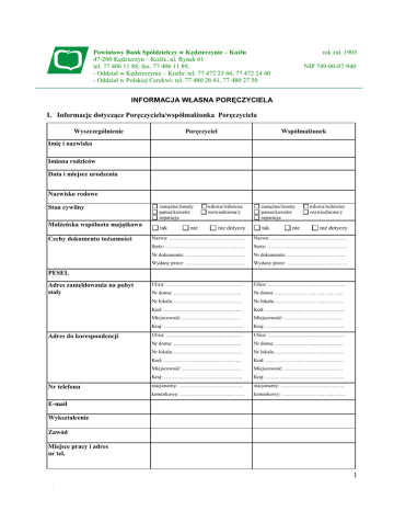 Powiatowy Bank Spółdzielczy w Kędzierzynie – Koźlu 47-200 Kędzierzyn – Koźle, ul. Rynek 61 tel. 77 406 11 88, fax. 77 406 11 89, - Oddział w Kędzierzynie – Koźlu: tel. 77 472 23 66, 77 472 24 40 - Oddział w Polskiej Cerekwi: tel. 77 480 26 41, 77 480 27 50 rok zał. 1903 NIP 749-00-07-940 INFORMACJA WŁASNA PORĘCZYCIELA I. Informacje dotyczące Poręczyciela/współmałżonka Poręczyciela Poręczyciel Wyszczególnienie Współmałżonek Imię i nazwisko Imiona rodziców Data i miejsce urodzenia Nazwisko rodowe Stan cywilny Małżeńska wspólnota majątkowa Cechy dokumentu tożsamości zamężna/żonaty panna/kawaler separacja tak nie wdowa/wdowiec rozwiedziona/y nie dotyczy zamężna/żonaty panna/kawaler separacja tak nie wdowa/wdowiec rozwiedziona/y nie dotyczy Nazwa: ……………………………………. Nazwa: ……………………………………. Seria: ……..……………………………….. Seria: ……..……………………………….. Nr dokumentu: ………………………….… Nr dokumentu: ………………………….… Wydany przez: ……………………………. Wydany przez: ……………………………. Ulica: ………………………….…………. Ulica: ………………………….…………. Nr domu: ………………….…………….. Nr domu: ………………….…………….. Nr lokalu………………….……………… Nr lokalu………………….……………… Kod: ……………………………………... Kod: ……………………………………... Miejscowość: …………………………… Miejscowość: …………………………… Kraj: ……………………………………... Kraj: ……………………………………... Ulica: ………………………….…………. Ulica: ………………………….…………. Nr domu: ………………….…………….. Nr domu: ………………….…………….. Nr lokalu………………….……………… Nr lokalu………………….……………… Kod: ……………………………………... Kod: ……………………………………... Miejscowość: …………………………… Miejscowość: …………………………… Kraj: ……………………………………... Kraj: ……………………………………... stacjonarny: ……………………………… stacjonarny: ……………………………… komórkowy: ……………………….……… komórkowy: ……………………………… PESEL Adres zameldowania na pobyt stały Adres do korespondencji Nr telefonu E-mail Wykształcenie Zawód Miejsce pracy i adres nr tel. 1 II. Sytuacja majątkowa Wyszczególnienie Poręczyciel Współmałżonek Miesięczny dochód netto w tym: dochód ze stosunku pracy ∗ dochody z prowadzonej działalności gospodarczej * dochód z najmu * emerytura/ renta * dochody sezonowe * Inne (podać źródła) * Wydatki gospodarstwa domowego ogółem, z tego: czynsz wraz z opłatami stałymi (gaz, co, telefon, energia elektryczna i inne) łączne wydatki na wyżywienie, ubranie, środki czystości, itp. koszty utrzymania samochodu spłata innych kredytów: 1) kredyty 2) limity w karcie kredytowej 3) limity w rachunku ROR płacone alimenty (renty) inne wydatki Liczba osób pozostających we wspólnym gospodarstwie domowym: .... w tym dzieci: …. INFORMACJA O POSIADANYM MAJĄTKU - OŚWIADCZENIE MAJĄTKOWE 1. Nieruchomości (rodzaj, adres, przybliżona wartość rynkowa, nr KW i Sąd prowadzący) .................................................................................................................................................................. 2. Pojazdy marka, rok produkcji, przybliżona wartość rynkowa) ............................................................................................................................................................. 3. Oszczędności (kwota, waluta, okres lokaty) ............................................................................................................................................................. 4. Papiery wartościowe (ilość, wartość) ............................................................................................................................................................. 5. Inne (wymienić) .......................................................................................................................... 2 OŚWIADCZENIA Oświadczam, że: 1) Posiadam rachunki bankowe (numer rachunku, nazwa i adres banku): ..................................................................................................................................................... ..................................................................................................................................................... 2) Posiadam zobowiązania z tytułu zaciągniętych kredytów lub pożyczek (nazwa i adres banku, cel kredytu, aktualna kwota zadłużenia, wysokość miesięcznej/ kwartalnej raty kapitałowoodsetkowej, ostateczny termin spłaty, zabezpieczenia spłaty kredytu): ..................................................................................................................................................... ..................................................................................................................................................... 3) Ubiegam się o kredyt/ pożyczkę w innym banku (nazwa i adres banku, cel kredytu, wnioskowana kwota kredytu i termin spłaty, proponowane zabezpieczenia spłaty kredytu): ..................................................................................................................................................... ..................................................................................................................................................... 4) Posiad
