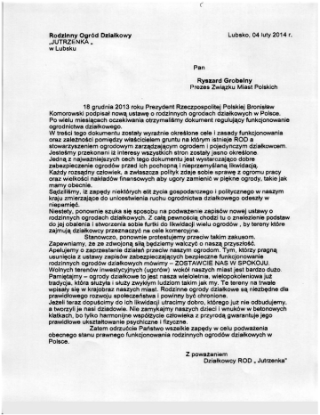 c Rodzinny Ogród Działkowy „JUTRZENKA „ w Lubsku Lubsko, 04 luty 2014 r. Pan Ryszard Grobelny Prezes Związku Miast Polskich 18 grudnia 2013 roku Prezydent Rzeczpospolitej Polskiej Bronisław Komorowski podpisał nową ustawę o rodzinnych ogrodach działkowych w Polsce. Po wielu miesiącach oczekiwania otrzymaliśmy dokument regulujący funkcjonowanie ogrodnictwa działkowego. W treści tego dokumentu zostały wyraźnie określone cele i zasady funkcjonowania oraz zależności pomiędzy właścicielem gruntu na którym istnieje ROD a stowarzyszeniem ogrodowym zarządzającym ogrodem i pojedynczym działkowcem. Jesteśmy przekonani iż interesy wszystkich stron zostały jasno określone Jedną z najważniejszych cech tego dokumentu jest wystarczająco dobre zabezpieczenie ogrodów przed ich pochopną i nieprzemyślaną likwidacją. Każdy rozsądny człowiek, a zwłaszcza polityk zdaje sobie sprawę z ogromu pracy oraz wielkości nakładów finansowych aby ugory zamienić w piękne ogrody, takie jak mamy obecnie. Sądziliśmy, iż zapędy niektórych elit życia gospodarczego i politycznego w naszym kraju zmierzające do unicestwienia ruchu ogrodnictwa działkowego odeszły w niepamięć. Niestety, ponownie szuka się sposobu na podważenie zapisów nowej ustawy o rodzinnych ogrodach działkowych. Z całą pewnością chodzi tu o znalezienie podstaw do jej obalenia i stworzenia sobie furtki do likwidacji wielu ogrodów , by tereny które zajmują działkowcy przeznaczyć na cele komercyjne. Stanowczo, ponownie protestujemy przeciw takim zakusom. Zapewniamy, że ze zdwojoną siłą będziemy walczyć o naszą przyszłość. Apelujemy o zaprzestanie działań przeciw naszym ogrodom. Tym, którzy pragną usunięcia z ustawy zapisów zabezpieczających bezpieczne funkcjonowanie rodzinnych ogrodów działkowych mówimy - ZOSTAWCIE NAS W SPOKOJU. Wolnych terenów inwestycyjnych (ugorów) wokół naszych miast jest bardzo dużo. Pamiętajmy - ogrody działkowe to jest nasza wieloletnia, wielopokoleniowa już tradycja, która służyła i służy zwykłym ludziom takim jak my. Te tereny na trwałe wpisały się w krajobraz naszych miast. Rodzinne ogrody działkowe są niezbędne dla prawidłowego rozwoju społeczeństwa i powinny być chronione. Jeżeli teraz dopuścimy do ich likwidacji utracimy dobro, którego już nie odbudujemy, a tworzyli je nasi dziadowie. Nie zamykajmy naszych dzieci i wnuków w betonowych klatkach, bo tylko harmonijne współżycie człowieka z przyrodą gwarantuje jego prawidłowe ukształtowanie psychiczne i fizyczne. Zatem odrzućcie Państwo wszelkie zapędy w celu podważenia obecnego stanu prawnego funkcjonowania rodzinnych ogrodów działkowych w Polsce. Z poważaniem Działkowcy ROD „ Jutrzenka"
