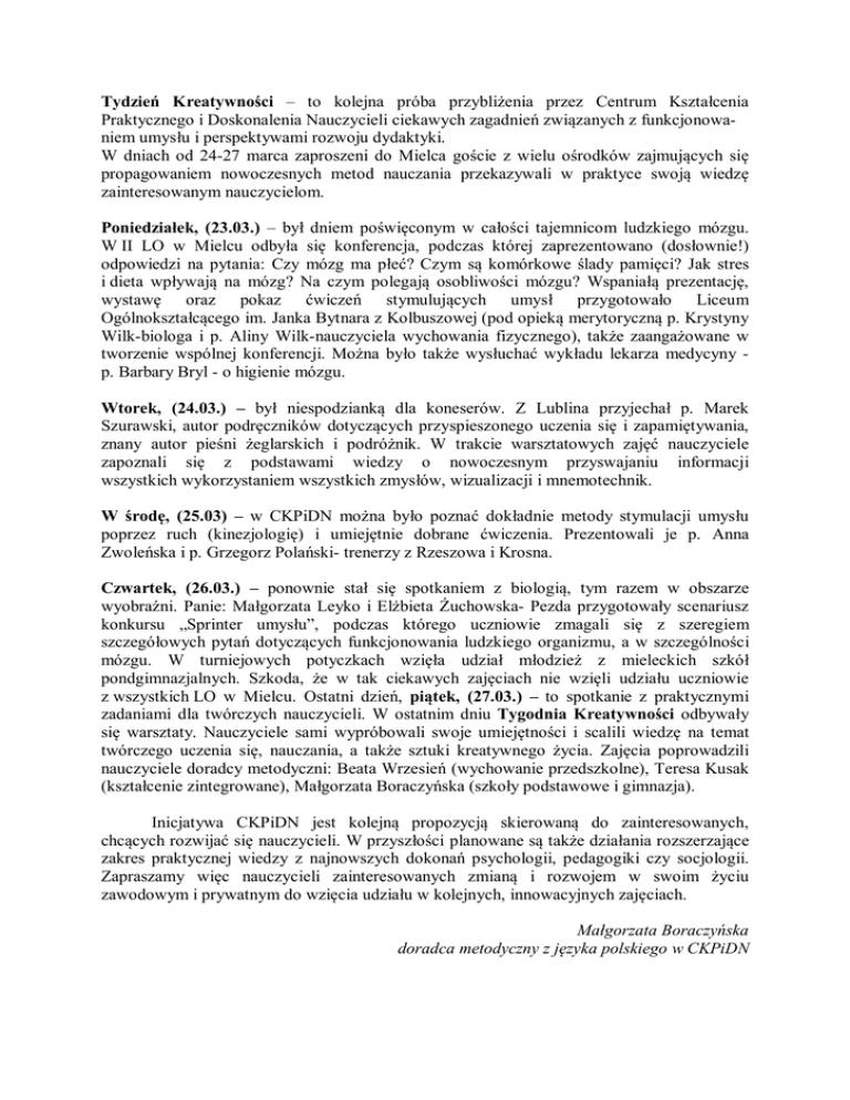 Tydzień Kreatywności – to kolejna próba przybliżenia przez Centrum Kształcenia Praktycznego i Doskonalenia Nauczycieli ciekawych zagadnień związanych z funkcjonowaniem umysłu i perspektywami rozwoju dydaktyki. W dniach od 24-27 marca zaproszeni do Mielca goście z wielu ośrodków zajmujących się propagowaniem nowoczesnych metod nauczania przekazywali w praktyce swoją wiedzę zainteresowanym nauczycielom. Poniedziałek, (23.03.) – był dniem poświęconym w całości tajemnicom ludzkiego mózgu. W II LO w Mielcu odbyła się konferencja, podczas której zaprezentowano (dosłownie!) odpowiedzi na pytania: Czy mózg ma płeć? Czym są komórkowe ślady pamięci? Jak stres i dieta wpływają na mózg? Na czym polegają osobliwości mózgu? Wspaniałą prezentację, wystawę oraz pokaz ćwiczeń stymulujących umysł przygotowało Liceum Ogólnokształcącego im. Janka Bytnara z Kolbuszowej (pod opieką merytoryczną p. Krystyny Wilk-biologa i p. Aliny Wilk-nauczyciela wychowania fizycznego), także zaangażowane w tworzenie wspólnej konferencji. Można było także wysłuchać wykładu lekarza medycyny p. Barbary Bryl - o higienie mózgu. Wtorek, (24.03.) – był niespodzianką dla koneserów. Z Lublina przyjechał p. Marek Szurawski, autor podręczników dotyczących przyspieszonego uczenia się i zapamiętywania, znany autor pieśni żeglarskich i podróżnik. W trakcie warsztatowych zajęć nauczyciele zapoznali się z podstawami wiedzy o nowoczesnym przyswajaniu informacji wszystkich wykorzystaniem wszystkich zmysłów, wizualizacji i mnemotechnik. W środę, (25.03) – w CKPiDN można było poznać dokładnie metody stymulacji umysłu poprzez ruch (kinezjologię) i umiejętnie dobrane ćwiczenia. Prezentowali je p. Anna Zwoleńska i p. Grzegorz Polański- trenerzy z Rzeszowa i Krosna. Czwartek, (26.03.) – ponownie stał się spotkaniem z biologią, tym razem w obszarze wyobraźni. Panie: Małgorzata Leyko i Elżbieta Żuchowska- Pezda przygotowały scenariusz konkursu „Sprinter umysłu”, podczas którego uczniowie zmagali się z szeregiem szczegółowych pytań dotyczących funkcjonowania ludzkiego organizmu, a w szczególności mózgu. W turniejowych potyczkach wzięła udział młodzież z mieleckich szkół pondgimnazjalnych. Szkoda, że w tak ciekawych zajęciach nie wzięli udziału uczniowie z wszystkich LO w Mielcu. Ostatni dzień, piątek, (27.03.) – to spotkanie z praktycznymi zadaniami dla twórczych nauczycieli. W ostatnim dniu Tygodnia Kreatywności odbywały się warsztaty. Nauczyciele sami wypróbowali swoje umiejętności i scalili wiedzę na temat twórczego uczenia się, nauczania, a także sztuki kreatywnego życia. Zajęcia poprowadzili nauczyciele doradcy metodyczni: Beata Wrzesień (wychowanie przedszkolne), Teresa Kusak (kształcenie zintegrowane), Małgorzata Boraczyńska (szkoły podstawowe i gimnazja). Inicjatywa CKPiDN jest kolejną propozycją skierowaną do zainteresowanych, chcących rozwijać się nauczycieli. W przyszłości planowane są także działania rozszerzające zakres praktycznej wiedzy z najnowszych dokonań psychologii, pedagogiki czy socjologii. Zapraszamy więc nauczycieli zainteresowanych zmianą i rozwojem w swoim życiu zawodowym i prywatnym do wzięcia udziału w kolejnych, innowacyjnych zajęciach. Małgorzata Boraczyńska doradca metodyczny z języka polskiego w CKPiDN