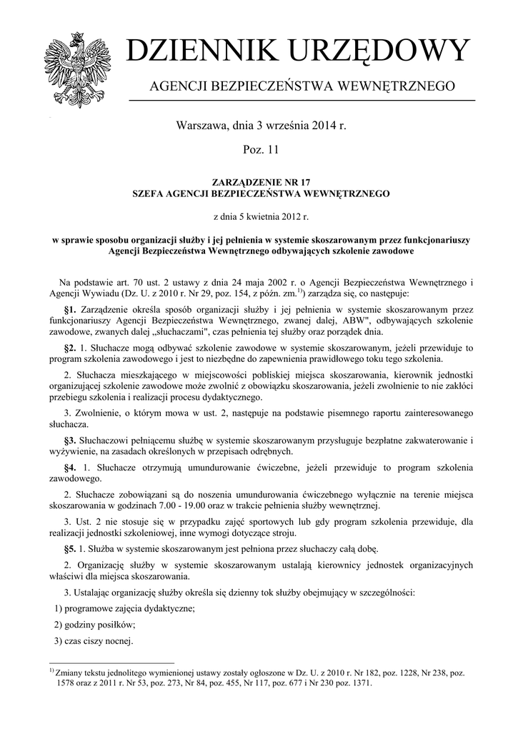 DZIENNIK URZĘDOWY AGENCJI BEZPIECZEŃSTWA WEWNĘTRZNEGO ccccc Warszawa, dnia 3 września 2014 r. Poz. 11 ZARZĄDZENIE NR 17 SZEFA AGENCJI BEZPIECZEŃSTWA WEWNĘTRZNEGO z dnia 5 kwietnia 2012 r. w sprawie sposobu organizacji służby i jej pełnienia w systemie skoszarowanym przez funkcjonariuszy Agencji Bezpieczeństwa Wewnętrznego odbywających szkolenie zawodowe Na podstawie art. 70 ust. 2 ustawy z dnia 24 maja 2002 r. o Agencji Bezpieczeństwa Wewnętrznego i Agencji Wywiadu (Dz. U. z 2010 r. Nr 29, poz. 154, z późn. zm.1)) zarządza się, co następuje: §1. Zarządzenie określa sposób organizacji służby i jej pełnienia w systemie skoszarowanym przez funkcjonariuszy Agencji Bezpieczeństwa Wewnętrznego, zwanej dalej, ABW", odbywających szkolenie zawodowe, zwanych dalej „słuchaczami", czas pełnienia tej służby oraz porządek dnia. §2. 1. Słuchacze mogą odbywać szkolenie zawodowe w systemie skoszarowanym, jeżeli przewiduje to program szkolenia zawodowego i jest to niezbędne do zapewnienia prawidłowego toku tego szkolenia. 2. Słuchacza mieszkającego w miejscowości pobliskiej miejsca skoszarowania, kierownik jednostki organizującej szkolenie zawodowe może zwolnić z obowiązku skoszarowania, jeżeli zwolnienie to nie zakłóci przebiegu szkolenia i realizacji procesu dydaktycznego. 3. Zwolnienie, o którym mowa w ust. 2, następuje na podstawie pisemnego raportu zainteresowanego słuchacza. §3. Słuchaczowi pełniącemu służbę w systemie skoszarowanym przysługuje bezpłatne zakwaterowanie i wyżywienie, na zasadach określonych w przepisach odrębnych. §4. 1. Słuchacze otrzymują umundurowanie ćwiczebne, jeżeli przewiduje to program szkolenia zawodowego. 2. Słuchacze zobowiązani są do noszenia umundurowania ćwiczebnego wyłącznie na terenie miejsca skoszarowania w godzinach 7.00 - 19.00 oraz w trakcie pełnienia służby wewnętrznej. 3. Ust. 2 nie stosuje się w przypadku zajęć sportowych lub gdy program szkolenia przewiduje, dla realizacji jednostki szkoleniowej, inne wymogi dotyczące stroju. §5. 1. Służba w systemie skoszarowanym jest pełniona przez słuchaczy całą dobę. 2. Organizację służby w systemie skoszarowanym ustalają kierownicy jednostek organizacyjnych właściwi dla miejsca skoszarowania. 3. Ustalając organizację służby określa się dzienny tok służby obejmujący w szczególności: 1) programowe zajęcia dydaktyczne; 2) godziny posiłków; 3) czas ciszy nocnej. 1) Zmiany tekstu jednolitego wymienionej ustawy zostały ogłoszone w Dz. U. z 2010 r. Nr 182, poz. 1228, Nr 238, poz. 1578 oraz z 2011 r. Nr 53, poz. 273, Nr 84, poz. 455, Nr 117, poz. 677 i Nr 230 poz. 1371. -2Dziennik Urzędowy Agencji Bezpieczeństwa Wewnętrznego Poz. 11 4. Kierownicy, o których mowa w ust. 2, określając dzienny tok służby, biorą pod uwagę w szczególności: 1) cele szkolenia zawodowego; 2) ustalenia zawarte w programach szkolenia zawodowego; 3) możliwości bazy szkoleniowej; 4) warunki zakwaterowania. §6. 1. Do czasu służby w systemie skoszarowanym zalicza się udział słuchaczy w: 1) programowych zajęciach dydaktycznych; 2) służbie wewnętrznej, polegającej na wykonywaniu zadań z zakresu ochrony fizycznej obiektów miejsca skoszarowania. 2. Służbę wewnętrzną słuchacze pełnią przez 12 godzin w godzinach od 8.00 do 20.00 albo od 20.00 do 8.00. 3. Harmonogram pełnienia służby ustala kierownik komórki organizacyjnej odpowiedzialnej za ochronę fizyczną miejsca skoszarowania w porozumieniu z kierownikiem jednostki organizacyjnej ABW właściwej dla miejsca skoszarowania. 4. Słuchacze pełniący służbę, o której mowa w ust. 2, w godzinach: 1) od 8.00 do 20.00 - zwolnieni są z uczestniczenia w programowych zajęciach dydaktycznych w dniu pełnienia tej służby; 2) od 20.00 do 8.00 - zwolnieni są z uczestniczenia w programowych zajęciach dydaktycznych w dniu, w którym zakończyli pełnienie tej służby. 5. Słuchacze pełniący służbę wewnętrzną są obowiązani do uzupełnienia materiału realizowanego na zajęciach dydaktycznych, w których nie brali udziału. §7. Słuchacze mogą w celach pozasłużbowych opuszczać teren miejsca skoszarowania za zgodą właściwych przełożonych. §8. Traci moc zarządzenie nr 49 Szefa Agencji Bezpieczeństwa z dnia 23 grudnia 2003 r. w sprawie sposobu organizacji służby i jej pełnienia w systemie skoszarowanym przez funkcjonariuszy Agencji Bezpieczeństwa Wewnętrznego. §9. Zarządzenie wchodzi w życie z dniem podpisania. Szef Agencji Bezpieczeństwa Wewnętrznego gen. bryg. Krzysztof BONDARYK