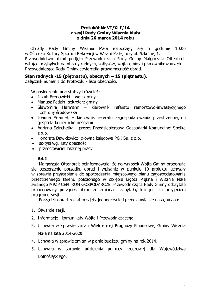 Protokół Nr VI/XLI/14 z sesji Rady Gminy Wisznia Mała z dnia 26 marca 2014 roku Obrady Rady Gminy Wisznia Mała rozpoczęły się o godzinie 10.00 w Ośrodku Kultury Sportu i Rekreacji w Wiszni Małej przy ul. Szkolnej 1. Przewodnictwo obrad podjęła Przewodnicząca Rady Gminy Małgorzata Ottenbreit witając przybyłych na obrady radnych, sołtysów, wójta gminy i pracowników urzędu. Przewodnicząca Rady Gminy stwierdziła prawomocność obrad. Stan radnych -15 (piętnastu), obecnych – 15 (piętnastu). Załącznik numer 1 do Protokołu - lista obecności. W posiedzeniu uczestniczyli również: Jakub Bronowicki – wójt gminy Mariusz Fedzin- sekretarz gminy Sławomira Hermann – kierownik referatu remontowo-inwestycyjnego i ochrony środowiska Joanna Adamek – kierownik referatu zagospodarowania przestrzennego i gospodarki nieruchomościami Adriana Szlachetka - prezes Przedsiębiorstwa Gospodarki Komunalnej Spółka z o.o. Honorata Dawidowicz- główna księgowa PGK Sp. z o.o. sołtysi wg. listy obecności przedstawiciel lokalnej prasy Ad.1 Małgorzata Ottenbreit poinformowała, że na wniosek Wójta Gminy proponuje się poszerzenie porządku obrad i wpisanie w punkcie 10 projektu uchwały w sprawie przystąpienia do sporządzenia miejscowego planu zagospodarowania przestrzennego terenu położonego w obrębie Ligota Piękna i Wisznia Mała zwanego MPZP CENTRUM GOSPODARCZE. Przewodnicząca Rady Gminy odczytała proponowany porządek obrad ze zmianą i zapytała, kto jest za przyjęciem programu sesji. Porządek obrad został przyjęty jednogłośnie i przedstawia się następująco: 1. Otwarcie sesji. 2. Informacje i komunikaty Wójta i Przewodniczącego. 3. Uchwała w sprawie zmian Wieloletniej Prognozy Finansowej Gminy Wisznia Mała na lata 2014-2020. 4. Uchwała w sprawie zmian w planie budżetu gminy na rok 2014. 5. Uchwała w sprawie udzielenia pomocy rzeczowej dla Województwa Dolnośląskiego. 1 6. Uchwała w sprawie wyrażenia zgody na wyodrębnienie w budżecie gminy środków stanowiących fundusz sołecki. 7. Uchwała w sprawie zmiany uchwały Rady Gminy Wisznia Mała Nr VI/XXXIV/288/13 w sprawie regulaminu udzielania pomocy materialnej o charakterze socjalnym dla uczniów zamieszkałych na terenie gminy Wisznia Mała. 8. Uchwała w sprawie przyjęcia programu opieki nad zwierzętami bezdomnymi oraz zapobiegania bezdomności zwierząt na terenie Gminy Wisznia Mała w 2014 r. 9. Uchwała w sprawie zatwierdzenia Sołeckiej Strategii Rozwoju Wsi Strzeszów. 10. Uchwała w sprawie przystąpienia do sporządzenia miejscowego planu zagospodarowania przestrzennego terenu położonego w obrębie Ligota Piękna i Wisznia Mała zwanego MPZP CENTRUM GOSPODARCZE. 11. Przyjęcie protokołu z poprzedniej sesji. 12. Interpelacje i zapytania radnych i sołtysów. 13. Zamknięcie obrad. Ad.2 Głos zabrał Wójt Gminy Jakub Bronowicki, który poinformował o działaniach podejmowanych od czasu ostatniej sesji: - 5 marca – spotkanie organizacyjne nt. „Operacji Zachód”, cyklicznej imprezy paramilitarnej Rakowie-Cieninie. Gminę na tym spotkaniu reprezentował p. Sekretarz Mariusz Fedzin - 8 marca - po raz drugi zorganizowano mistrzostwa gminy w pływaniu. Najlepsza okazała się szkoła podstawowa w Wiszni Małej. Było wielu uczestników. Najwięcejzawodników było w najmłodszych kategoriach wiekowych. Dziękuje trzebnickiemu „Zdrojowi” za przygotowanie oprawy sędziowskiej i ufundowanie części nagród. - 8 marca – w Piotrkowiczkach świętowaliśmy „Dzień Kobiet” tym razem w nowej, ciekawej formule pokazu mody. Paniom z naszej gminy, które brały udział w tym pokazie w roli modelek gratulujemy odwagi i chęci wystąpienia. To udowadnia, że moda jest dla wszystkich. Poza tym jak zwykle serdeczne podziękowania dla Pani sołtys Barbary Wilk i jej zespołu za pomoc organizatorom. - 10 marca – podpisywaliśmy razem z panią skarbnik umowa w sprawie eUrzędu – jako wynik uchwały podjętej na ubiegłej sesji - 9 marca –w Dolnośląskim Urzędzie Wojewódzkim wręczenie wyróżnień przez Wojewodę Dolnośląskiego dla sołtysów. Serdeczne gratulacje dla pani Sołtys z Krzyżanowic. Co roku staramy się przedstawić kandydaturę naszego sołtysa w tym konkursie i w tym roku to wyróżnienie zdobyła Pani sołtys Józefa Bebłocińska. 2 W związku z zapytaniem podczas ostatniej sesji radnego Zdzisława Zdobylaka, informację nt. działalności Przedsiębiorstwa Gospodarki Komunalnej sp. z o.o. w Wiszni Małej oraz wyniku spółki za rok 2013 przedstawiła Prezes Zarządu Adriana Szlachetka oraz Główna Księgowa Spółki Honorata Dawidowicz. Prezes spółki przypomniała, że PGK sp. z o.o. w Wiszni Małej jest jednoosobową spółką Gminy Wisznia Mała, powstałą na mocy Uchwały Rady Gminy Wisznia Mała z dnia 28 listopada 2012 roku oraz Aktu Notarialnego z dnia 20 grudnia 2012 roku. Kapitał zakładowy Spółki wynosi 19.895.000,00 zł. Przedmiotem działalności Spółki jest szeroko pojęta gospodarka wodno – ściekowa, a w szczególności: pobór, uzdatnianie i dostarczanie wody odbiorcom oraz odbiór i oczyszczanie ścieków. Od stycznia 2014 r. PGK jest zarządzającym nieczynnych gminnych składowisk odpadów w Piotrkowiczkach i Mienicach. Z dniem 1 lipca 2013 roku Spółka przejęła działalność od Rejonowego Związku Spółek Wodnych w Trzebnicy, który prowadził eksploatację w zakresie wodociągów i kanalizacji na majątku gminy od roku 1993r. Spółka jest właścicielem majątku komunalnego przekazanego jej przez gminę Wisznia Mała o wartości 19.890.000,00 złotych. W jego skład wchodzą nieruchomości oraz urządzenia sieci wodociągowej i kanalizacyjnej, tj.: a) Stacje uzdatniania wody w Psarach i Krynicznie b) Sieć wodociągowa wraz z przyłączami, na którą składa się: wodociąg grupowy Kryniczno-Rogoż, wodociąg grupowy Psary-Szymanów-Krzyżanowice, wodociąg zbiorowy Wisznia Mała c) oczyszczalnia ścieków w Strzesz