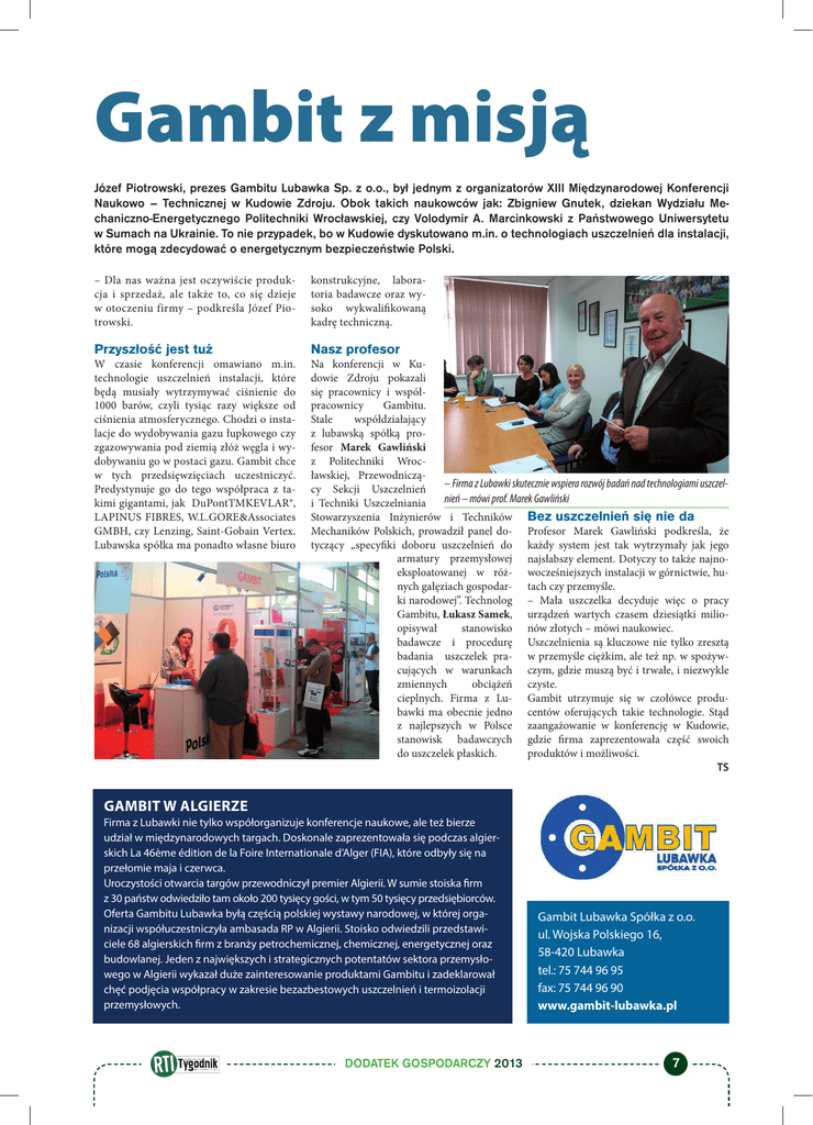 Gambit z misją Józef Piotrowski, prezes Gambitu Lubawka Sp. z o.o., był jednym z organizatorów XIII Międzynarodowej Konferencji Naukowo – Technicznej w Kudowie Zdroju. Obok takich naukowców jak: Zbigniew Gnutek, dziekan Wydziału Mechaniczno-Energetycznego Politechniki Wrocławskiej, czy Volodymir A. Marcinkowski z Państwowego Uniwersytetu w Sumach na Ukrainie. To nie przypadek, bo w Kudowie dyskutowano m.in. o technologiach uszczelnień dla instalacji, które mogą zdecydować o energetycznym bezpieczeństwie Polski. – Dla nas ważna jest oczywiście produkcja i sprzedaż, ale także to, co się dzieje w otoczeniu firmy – podkreśla Józef Piotrowski. konstrukcyjne, laboratoria badawcze oraz wysoko wykwalifikowaną kadrę techniczną. Przyszłość jest tuż Nasz profesor W czasie konferencji omawiano m.in. technologie uszczelnień instalacji, które będą musiały wytrzymywać ciśnienie do 1000 barów, czyli tysiąc razy większe od ciśnienia atmosferycznego. Chodzi o instalacje do wydobywania gazu łupkowego czy zgazowywania pod ziemią złóż węgla i wydobywaniu go w postaci gazu. Gambit chce w tych przedsięwzięciach uczestniczyć. Predystynuje go do tego współpraca z takimi gigantami, jak DuPontTMKEVLAR®, LAPINUS FIBRES, W.L.GORE&Associates GMBH, czy Lenzing, Saint-Gobain Vertex. Lubawska spółka ma ponadto własne biuro Na konferencji w Kudowie Zdroju pokazali się pracownicy i współpracownicy Gambitu. Stale współdziałający z lubawską spółką profesor Marek Gawliński z Politechniki Wrocławskiej, Przewodniczą– Firma z Lubawki skutecznie wspiera rozwój badań nad technologiami uszczelcy Sekcji Uszczelnień nień – mówi prof. Marek Gawliński i Techniki Uszczelniania Stowarzyszenia Inżynierów i Techników Bez uszczelnień się nie da Mechaników Polskich, prowadził panel do- Profesor Marek Gawliński podkreśla, że tyczący „specyfiki doboru uszczelnień do każdy system jest tak wytrzymały jak jego armatury przemysłowej najsłabszy element. Dotyczy to także najnoeksploatowanej w róż- wocześniejszych instalacji w górnictwie, hunych gałęziach gospodar- tach czy przemyśle. ki narodowej”. Technolog – Mała uszczelka decyduje więc o pracy Gambitu, Łukasz Samek, urządzeń wartych czasem dziesiątki milioopisywał stanowisko nów złotych – mówi naukowiec. badawcze i procedurę Uszczelnienia są kluczowe nie tylko zresztą badania uszczelek pra- w przemyśle ciężkim, ale też np. w spożywcujących w warunkach czym, gdzie muszą być i trwałe, i niezwykle zmiennych obciążeń czyste. cieplnych. Firma z Lu- Gambit utrzymuje się w czołówce produbawki ma obecnie jedno centów oferujących takie technologie. Stąd z najlepszych w Polsce zaangażowanie w konferencję w Kudowie, stanowisk badawczych gdzie firma zaprezentowała część swoich do uszczelek płaskich. produktów i możliwości. TS Gambit w Algierze Firma z Lubawki nie tylko współorganizuje konferencje naukowe, ale też bierze udział w międzynarodowych targach. Doskonale zaprezentowała się podczas algierskich La 46ème édition de la Foire Internationale d’Alger (FIA), które odbyły się na przełomie maja i czerwca. Uroczystości otwarcia targów przewodniczył premier Algierii. W sumie stoiska firm z 30 państw odwiedziło tam około 200 tysięcy gości, w tym 50 tysięcy przedsiębiorców. Oferta Gambitu Lubawka byłą częścią polskiej wystawy narodowej, w której organizacji współuczestniczyła ambasada RP w Algierii. Stoisko odwiedzili przedstawiciele 68 algierskich firm z branży petrochemicznej, chemicznej, energetycznej oraz budowlanej. Jeden z największych i strategicznych potentatów sektora przemysłowego w Algierii wykazał duże zainteresowanie produktami Gambitu i zadeklarował chęć podjęcia współpracy w zakresie bezazbestowych uszczelnień i termoizolacji przemysłowych. DODATEK GOSPODARCZY 2013 Gambit Lubawka Spółka z o.o. ul. Wojska Polskiego 16, 58-420 Lubawka tel.: 75 744 96 95 fax: 75 744 96 90 www.gambit-lubawka.pl 7