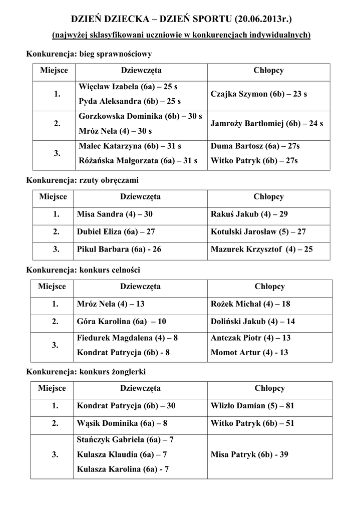 DZIEŃ DZIECKA – DZIEŃ SPORTU (20.06.2013r.) (najwyżej sklasyfikowani uczniowie w konkurencjach indywidualnych) Konkurencja: bieg sprawnościowy Miejsce 1. 2. 3. Dziewczęta Więcław Izabela (6a) – 25 s Pyda Aleksandra (6b) – 25 s Gorzkowska Dominika (6b) – 30 s Mróz Nela (4) – 30 s Chłopcy Czajka Szymon (6b) – 23 s Jamroży Bartłomiej (6b) – 24 s Malec Katarzyna (6b) – 31 s Duma Bartosz (6a) – 27s Różańska Małgorzata (6a) – 31 s Witko Patryk (6b) – 27s Konkurencja: rzuty obręczami Miejsce Dziewczęta Chłopcy 1. Misa Sandra (4) – 30 Rakuś Jakub (4) – 29 2. Dubiel Eliza (6a) – 27 Kotulski Jarosław (5) – 27 3. Pikul Barbara (6a) - 26 Mazurek Krzysztof (4) – 25 Konkurencja: konkurs celności Miejsce Dziewczęta Chłopcy 1. Mróz Nela (4) – 13 Rożek Michał (4) – 18 2. Góra Karolina (6a) – 10 Doliński Jakub (4) – 14 Fiedurek Magdalena (4) – 8 Antczak Piotr (4) – 13 Kondrat Patrycja (6b) - 8 Momot Artur (4) - 13 3. Konkurencja: konkurs żonglerki Miejsce Dziewczęta Chłopcy 1. Kondrat Patrycja (6b) – 30 Wlizło Damian (5) – 81 2. Wąsik Dominika (6a) – 8 Witko Patryk (6b) – 51 Stańczyk Gabriela (6a) – 7 3. Kulasza Klaudia (6a) – 7 Kulasza Karolina (6a) - 7 Misa Patryk (6b) - 39 Konkurencje drużynowe Biegi sztafetowe Miejsce Klasa 1. 6b 2. 4 3. 6a 4. 5 Rozgrywki w siatkówkę L.p. Kolejność meczy Wynik 1. 4:5 0:2 2. 6b : 6a 2:0 3. 6b : 4 2:1 4. 6a : 5 2:0 5. 6b : 5 2:0 6. 6a : 4 2:0 Drużyna Suma punktów Miejsce w klasyfikacji 6b 9 1. 6a 7 2. 5 5 3. 4 3 4. Drużyna Suma punktów Miejsce w klasyfikacji 6b 9 1. 4 7 2. 5 5 3. 6a 3 4. Drużyna Suma punktów Miejsce w klasyfikacji 6a 9 1. 6b 7 2. 5 6 3. 4 3 4. Rozgrywki w badmintona L.p. Kolejność meczy Wynik 1. 4:5 15 : 10 2. 6b : 6a 15 : 11 3. 6b : 4 17 : 15 4. 6a : 5 18 : 20 5. 6b : 5 15 : 9 6. 6a : 4 9 :15 Przeciąganie liny L.p. Kolejność meczy Wynik 1. 4:5 0:2 2. 6b : 6a 0:2 3. 6b : 4 2:0 4. 6a : 5 2:0 5. 6b : 5 2:1 6. 6a : 4 2:0 Quiz sportowy Punkty za poszczególne Miejsce w klasyfikacji Nazwisko i imię Suma Klasa pytania pkt. 1 2 3 4 5 Dogrywka 1. Czajka Szymon 6b 1 1 1 0 1 1+1+1 2. Wlizło Damian 5 1 1 0 1 1 1+1+0 3. Malec Gabriela 5 1 1 1 0 1 1+0 4. Gawda Karolina 6b 1 1 0 1 1 0 5. Więcław Izabela 6a 0 1 0 1 0 2 - 6. Duma Bartosz 6a 0 0 1 0 0 1 - 7. Doliński Jakub 4 0 0 0 0 0 0 1 8. Misa Sandra 4 0 0 0 0 0 0 0 4