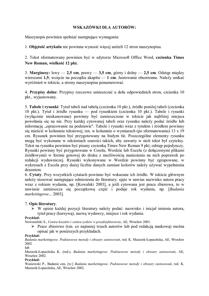 WSKAZÓWKI DLA AUTORÓW: Maszynopis powinien spełniać następujące wymagania: 1. Objętość artykułu nie powinna wynosić więcej aniżeli 12 stron maszynopisu. 2. Tekst sformatowany powinien być w edytorze Microsoft Office Word, czcionka Times New Roman, wielkość 12 pkt. 3. Marginesy: lewy — 2,5 cm, prawy — 3,5 cm, górny i dolny — 2,5 cm. Odstęp między wierszami 1,5; wcięcie na początku akapitu — 1 cm. Justowanie obustronne. Należy unikać wyróżnień w tekście, a strony maszynopisu ponumerować. 4. Przypisy dolne: Przypisy rzeczowe umieszczać u dołu odpowiednich stron, czcionka 10 pkt., wyjustowany. 5. Tabele i rysunki: Tytuł tabeli nad tabelą (czcionka 10 pkt.), źródło poniżej tabeli (czcionka 10 pkt.). Tytuł i źródło rysunku — pod rysunkiem (czcionka 10 pkt.). Tabele i rysunki (wyłącznie nieskanowane) powinny być zamieszczone w tekście jak najbliżej miejsca powołania się na nie. Przy każdej cytowanej tabeli oraz rysunku należy podać źródło lub informację „opracowanie na podstawie". Tabele i rysunki wraz z tytułem i źródłem powinny się mieścić w kolumnie tekstowej, tzn. w kolumnie o wymiarach (po sformatowaniu) 13 x 19 cm. Rysunek powinien być przygotowany na białym tle. Poszczególne elementy rysunku mogą być wykonane w odcieniach szarości takich, aby zawarty w nich tekst był czytelny. Tekst na rysunku powinien być pisany czcionką Times New Roman 9 pkt, odstęp pojedynczy. Rysunki powinny być przygotowane w Corelu, Wordzie lub Excelu (z dołączonymi plikami źródłowymi) w formie gotowej do druku z możliwością naniesienia na nich poprawek po redakcji wydawniczej. Rysunki wykonywane w Wordzie powinny być zgrupowane, w wykresach z Excela przy dużej liczbie danych zamiast kolorów należy używać wypełnienia deseniem. 6. Cytaty. Przy wszystkich cytatach powinno być wskazane ich źródło. W tekście głównym należy stosować następujące odniesienia do literatury: ujęte w nawias nazwisko autora pracy wraz z rokiem wydania, np. [Kowalski 2003], a jeśli cytowana jest praca zbiorowa, to w nawiasie zamieszcza się początkową część i podaje rok wydania, np. [Badania marketingowe... 2003]. 7. Opis literatury. W opisie każdej pozycji literatury należy podać: nazwisko i inicjał imienia autora, tytuł pracy (kursywą), nazwę wydawcy, miejsce i rok wydania. Przykład: Nowosielski S., Centra kosztów i centra zysków w przedsiębiorstwie, AE, Wrocław 2001. Prace zbiorowe (tzn. co najmniej trzech autorów lub pod redakcją naukową) można opisać jak w poniższych przykładach. Przykład: Badania marketingowe. Podstawowe metody i obszary zastosowań, red. K. Mazurek-Łopacińska, AE, Wrocław 2002 lub Mazurek-Łopacińska K. (red.), Badania marketingowe. Podstawowe metody i obszary zastosowań, AE, Wrocław 2002. Przykład: Waniowski P., Badanie cen, [w:] Badania marketingowe. Podstawowe metody i obszary zastosowań, red. K. Mazurek-Łopacińska, AE, Wrocław 2002. W razie powoływania się na artykuły w czasopismach lub seriach naukowych należy podać: nazwisko i inicjał imienia autora, tytuł artykułu (kursywą), tytuł czasopisma (w cudzysłowie) lub serii naukowej, rok wydania, numer zeszytu (lub tomu). Przykład: Kowal A., Perspektywy integracji europejskiej, „Teraźniejszość i Przyszłość” 2003, Tulibacki W., Wartości wartości, Prace Naukowe Akademii Ekonomicznej nr 722, AE, Wrocław 2002. Układ artykułu powinien być następujący: Nazwisko i imię (czcionka 12 pkt., wyśrodkowane) Uczelnia, instytucja lub miejsce pracy (czcionka 10 pkt. wyśrodkowane) TYTUŁ ARTYKUŁU (wersalikami, czcionka 14 pkt., w jęz. polskim, wyśrodkowane) Streszczenie w języku polskim (max 850 znaków ze spacjami, czcionka 10 pkt.) Tekst artykułu (czcionka 12 pkt.) podzielony na następujące części: 1. Wstęp 2. Tytuł części 3. Tytuł części ............... 4. Podsumowanie Literatura Alfabetyczny spis literatury (czcionka 10 pkt.) 1. Nazwisko I., Tytuł, Wydawnictwo, Miejsce rok wydania. 2. prace zbiorowe lub pod redakcją: Nazwisko I. (red.), Tytuł, Wydawnictwo, Miejsce rok wydania. 3. przykład powołania na rozdział w pracy zbiorowej: Nazwisko I., Tytuł, [w:] Tytuł, red. I. Nazwisko, Wydawnictwo, Miejsce rok wydania. 4. powołanie się na artykuły w czasopismach: Nazwisko I., Tytuł, „Czasopismo” rok wydania, numer. 5. powołanie się na artykuły w seriach naukowych: Nazwisko I., Tytuł, seria naukowa nr, Wydawnictwo, Miejsce rok wydania. 6. Ustawa z 25 maja 2001 r. tytuł (Dz.U. rok, nr, poz.). TYTUŁ W JĘZYKU ANGIELSKIM (wersalikami, czcionka 12 pkt., wyśrodkowane) Summary Streszczenie w języku angielskim (max 850 znaków ze spacjami, czcionka 10 pkt.) nr 4.