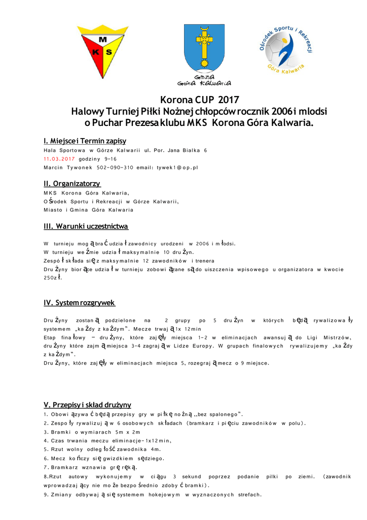 Korona CUP 2017 Halowy Turniej Piłki Nożnej chłopców rocznik 2006 i mlodsi o Puchar Prezesa klubu MKS Korona Góra Kalwaria. I. Miejsce i Termin zapisy Hala Sporto w a w Górze Kal w a r i i ul. Por. Jana Bial k a 6 1 1.03.20 1 7 godz i n y 9-16 Ma r c i n Ty w o n e k 502-090-310 email: ty we k 1 @ o p . p l II. Organizatorzy M K S K o r o n a Góra Kal w a r i a, O środek Sportu i Rek reac j i w Górze Kal w a r i i, M ias to i G m i n a Góra Kal w a r i a III. Warunki uczestnictwa W turn ie j u mog ą bra ć udzia ł zaw o d n i c y urodze n i w 2006 i m łodsi. W turniej u we źmie udzia ł maks y m a l n i e 10 dru żyn. Zespó ł sk łada si ę z maks y m a l n i e 12 zawo d n i k ó w i trenera Dru żyny bior ące udzia ł w turniej u zobo w i ązane są do uiszczen ia wpis o w e g o u organiz at o ra w k w o c i e 250z ł. IV. System rozgrywek Dru żyny zostan ą podz iel o n e na 2 grup y po 5 dru żyn w któr y c h b ęd ą ry wa l i z o w a ły syste me m „ka żdy z ka żdy m ”. M ec z e trwaj ą 1x 12 m i n Etap fina łow y – dru żyny, które zaj ęły miejsca 1-2 w eli m i n a c j a c h awansu j ą do Lig i M is t rz ó w , dru żyny które zaj m ą miejsca 3-4 zagraj ą w Lid ze Europ y. W grupac h finalo w y c h ry w a l i z u j e m y „ka żdy z ka żdy m ”. Dru żyny, które zaj ęły w eli m i n a c j ac h miejsca 5, rozegraj ą mecz o 9 miejsce. V. Przepisy i skład drużyny 1. Obo w i ązy w a ć b ęd ą przepis y gry w pi łk ę no żn ą ,,bez spaloneg o”. 2. Zespo ły ry wa l i z u j ą w 6 osobo w y c h sk ładach (bramk arz i pi ęciu zaw o d n i k ó w w polu). 3. Bra m k i o wy m i a r a c h 5m x 2m 4. Czas trwa n ia mecz u eli m i n a c j e- 1x 1 2 m i n, 5. Rzut wol n y odleg ło ść zawo d n i k a 4m. 6. Me c z ko ńczy si ę gw iz d k i e m sędziego. 7. Bra m k a r z wz na w i a gr ę r ęk ą. 8.Rzut auto w y wy k o n u j e m y w ci ągu 3 sekun d poprzez podan ie pilk i po ziem i. wpr o w a d z a j ący nie mo że bezpo średnio zdob y ć bram k i). 9. Z m i a n y odb y w a j ą si ę syste me m hokej o w y m w w y z na c z o n y c h strefac h. (zawodn i k 10. Zespo ły bior ące udzia ł w turniej u po w i n n y posiada ć jednol i te stroje z nume ra m i. 1 1. Za w o d y b ęd ą rozgr y w a n e pi łk ą nr 4. 12. Obo w i ązuje gra w obu w i u z jasn ą podesz w ą. 13. Za zw y c i ęstwo dru żynie prz y z na w a n e są 3 pkt., za remis 1 pkt., za pora żk ę 0 pkt. 14. O kolej n o ści miejsc w tabeli decy d u j ą kolejn o: a) liczba zdob y t y c h pun k t ó w , b) wy n i k i bezpo średnic h spotka ń zainteres o w a n y c h dru żyn, c) stosune k bra m k o w y zaintereso w a n y c h dru żyny, d) wi ększa liczba strzelo n y c h goli. e) 3 rzuty karne 15. Kar y dysc y p l i n a r n e : a) kara 1-2 min u t, b) czer w o n a kartka – dru żyna gra w niek o m p l e t n y m sk ładzie do ko ńca mecz u, zawo d n i k otrz y m u j ący czer w o n ą kartk ę pauz uje do ko ńca turniej u. 16. W czasie trwan ia turniej u zaw o d n i k mo że gra ć tylk o w jednej dru żynie. 17. Za w o d n i c y musz ą posiada ć wa żny w dniu zawo d ó w dok u m e n t ze zdj ęcie m pot w i e r d z a j ący to żsamo ść oraz aktualne badania lekars k ie. VI. Postanowienia końcowe 1. Za nieprzestrzegan ie regula m i n u i przepis ó w gry groz i kara dysk w a l i f i k a c j i z turniej u lub wal k o w e r. 2. Za w o d y sędziuj ą osob y w y z na c z o n e przez organiz at o ra. 3. Organ i z at o r zape w n i a opiek ę med y c z n ą, wo d ę dla zawo d n i k ó w podczas zaw o d ó w . 4. Organ i z at o r nie ubezpiec z a zaw o d n i k ó w oraz nie ponosi odpo w i e d z i a l n o ści za rzecz y zagubi o n e podc zas turniej u. 5. Organ i z at o r nie ponosi odpo w i e d z i a l n o ści za rzecz y pozosta w i o n e i zgubi o ne w szatni oraz w trakc ie trwa n ia turniej u. 6. Za szkod y po wsta łe na obiek c ie odpo w i a d a dru żyna. 7. Wszel k i e spra w y sporne oraz nieob j ęte regula m i n e m rozstrz y g a organiz at o r. 8. Przyst ąpienie do turniej u oznacza pe łn ą akceptac je regula m i n u. VII Nagrody Me da le i puchar y oraz nagrod y ind y w i d u a l n e dla króla strzelc ó w, najlepszeg o zawo d n i k a oraz najlepszeg o bra m k a r z a.