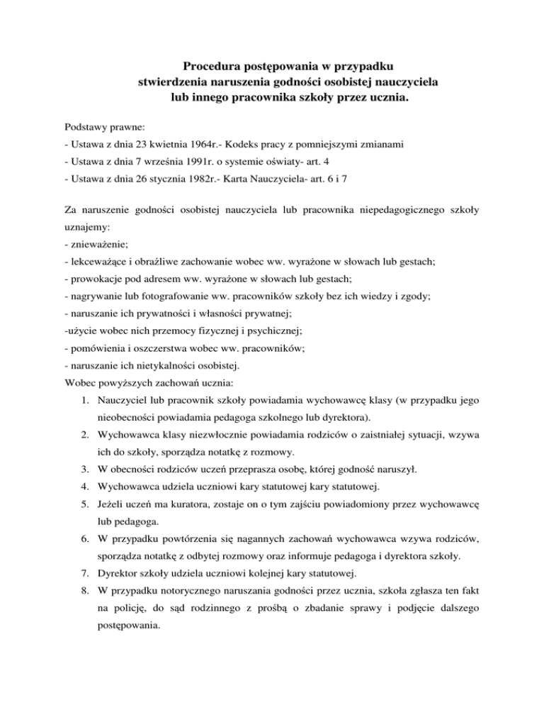 Procedura postępowania w przypadku stwierdzenia naruszenia godności osobistej nauczyciela lub innego pracownika szkoły przez ucznia. Podstawy prawne: - Ustawa z dnia 23 kwietnia 1964r.- Kodeks pracy z pomniejszymi zmianami - Ustawa z dnia 7 września 1991r. o systemie oświaty- art. 4 - Ustawa z dnia 26 stycznia 1982r.- Karta Nauczyciela- art. 6 i 7 Za naruszenie godności osobistej nauczyciela lub pracownika niepedagogicznego szkoły uznajemy: - znieważenie; - lekceważące i obraźliwe zachowanie wobec ww. wyrażone w słowach lub gestach; - prowokacje pod adresem ww. wyrażone w słowach lub gestach; - nagrywanie lub fotografowanie ww. pracowników szkoły bez ich wiedzy i zgody; - naruszanie ich prywatności i własności prywatnej; -użycie wobec nich przemocy fizycznej i psychicznej; - pomówienia i oszczerstwa wobec ww. pracowników; - naruszanie ich nietykalności osobistej. Wobec powyższych zachowań ucznia: 1. Nauczyciel lub pracownik szkoły powiadamia wychowawcę klasy (w przypadku jego nieobecności powiadamia pedagoga szkolnego lub dyrektora). 2. Wychowawca klasy niezwłocznie powiadamia rodziców o zaistniałej sytuacji, wzywa ich do szkoły, sporządza notatkę z rozmowy. 3. W obecności rodziców uczeń przeprasza osobę, której godność naruszył. 4. Wychowawca udziela uczniowi kary statutowej kary statutowej. 5. Jeżeli uczeń ma kuratora, zostaje on o tym zajściu powiadomiony przez wychowawcę lub pedagoga. 6. W przypadku powtórzenia się nagannych zachowań wychowawca wzywa rodziców, sporządza notatkę z odbytej rozmowy oraz informuje pedagoga i dyrektora szkoły. 7. Dyrektor szkoły udziela uczniowi kolejnej kary statutowej. 8. W przypadku notorycznego naruszania godności przez ucznia, szkoła zgłasza ten fakt na policję, do sąd rodzinnego z prośbą o zbadanie sprawy i podjęcie dalszego postępowania.