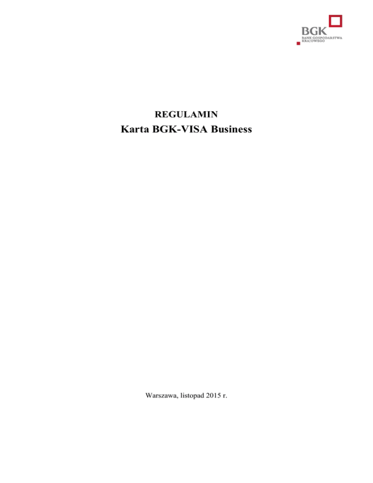 REGULAMIN Karta BGK-VISA Business Warszawa, listopad 2015 r. Spis treści Rozdział 1. Postanowienia ogólne .............................................................................................................. 3 Rozdział 2. Wydanie karty ........................................................................................................................... 4 Rozdział 3. Wznowienie karty. Duplikat karty............................................................................................ 6 Rozdział 4. Używanie karty ......................................................................................................................... 7 Rozdział 5. Ochrona kart i PIN. Zastrzeganie i blokowanie kart ............................................................... 9 Rozdział 6. Rozliczenia transakcji płatniczych .......................................................................................... 12 Rozdział 7. Opłaty i prowizje ..................................................................................................................... 14 Rozdział 8. Reklamacje .............................................................................................................................. 14 Rozdział 9. Usługi dodatkowe ................................................................................................................... 15 Rozdział 10. Rozwiązanie Umowy ............................................................................................................... 15 Rozdział 11. Zmiana Regulaminu ................................................................................................................ 16 Rozdział 12. Postanowienia końcowe ......................................................................................................... 17 2/18 Rozdział 1. Postanowienia ogólne 1. 2. 3. 4. § 1. Regulamin „Karta BGK-VISA Business”, zwany dalej Regulaminem, określa warunki wydawania i zasady używania kart BGK-VISA Business wydawanych przez Bank Gospodarstwa Krajowego przedsiębiorcom i innym klientom instytucjonalnym oraz zasady rozliczania transakcji płatniczych dokonywanych przy użyciu tych kart. Zasady otwierania i prowadzenia rachunków bankowych w Banku Gospodarstwa Krajowego określa Regulamin otwierania i prowadzenia rachunków bankowych dla przedsiębiorców i innych klientów instytucjonalnych w Banku Gospodarstwa Krajowego, zwany dalej Regulaminem RB. Bank, działając zgodnie z art.16 i art. 33 ustawy z dnia 19 sierpnia 2011 r. o usługach płatniczych (Dz. U. z 2014 r. poz. 873, z późn. zm.), zwanej dalej „Ustawą UP”, nie stosuje do transakcji płatniczych realizowanych przy użyciu kart BGK-VISA Business w państwach członkowskich przepisów tej ustawy wyłączonych ze stosowania w Banku Regulaminem świadczenia usług płatniczych w Banku Gospodarstwa Krajowego, zwanym dalej „Regulaminem UP”. W miejsce wyłączonych przepisów Ustawy UP zastosowanie mają postanowienia niniejszego Regulaminu oraz Regulaminu UP. Termin określony w art. 44 ust.2 Ustawy UP zastępuje się terminem określonym w § 48 niniejszego Regulaminu. § 2. 1. Przez użyte w niniejszym Regulaminie określenia należy rozumieć: 1) autoryzacja - zgodę Użytkownika karty na dokonanie transakcji przy użyciu karty, wyrażoną w sposób określony w Regulaminie; 2) agent rozliczeniowy – bank, instytucję kredytową albo instytucję płatniczą w rozumieniu Ustawy UP , która na podstawie zawartej umowy z akceptantem pośredniczy w realizacji transakcji płatniczej dokonanej kartą; 3) akceptant – sprzedawcę lub usługodawcę, który przyjmuje zapłatę, wypłaca gotówkę lub umożliwia dokonanie innych operacji przy użyciu karty; 4) Bank – Bank Gospodarstwa Krajowego; 5) bank – inny bank; 6) bankomat - urządzenie umożliwiające Użytkownikowi karty podejmowanie gotówki lub dokonywanie innych transakcji płatniczych oraz innych operacji przy użyciu karty; 7) blokada karty – czasowe uniemożliwienie realizacji transakcji przy użyciu karty, dokonywane przez Bank, polegające na zablokowaniu karty w systemie autoryzacyjnym; 8) centrum autoryzacyjne – First Data Polska SA z siedzibą w Warszawie prowadzącą na mocy umowy z Bankiem obsługę kart, w tym przyjmowanie zgłoszeń dotyczących zastrzeżeń, pośredniczącą w realizacji transakcji płatniczych dokonywanych przy użyciu kart; 9) dzień roboczy – każdy dzień od poniedziałku do piątku, z wyłączeniem dni ustawowo wolnych od pracy, w którym Bank prowadzi działalność wymaganą do wykonania transakcji płatniczej oraz innych operacji objętych niniejszym Regulaminem przy użyciu karty, lub dzień, w którym bank/dostawca usług płatniczych uczestniczący w wykonaniu tej transakcji płatniczej prowadzi działalność wymaganą do jej wykonania; 10) karta - międzynarodową kartę płatniczą BGK-VISA Business wydawaną przez Bank, na której widnieje numer karty, imię i nazwisko Użytkownika karty, firma Posiadacza karty oraz data jej ważności; 11) kod CVV – trzycyfrowy numer zamieszczony na pasku do podpisu, służący do dodatkowej identyfikacji karty przy transakcjach dokonywanych bez fizycznego użycia karty; 12) Komunikat Banku - informację podawaną do wiadomości Klientów Banku, udostępnioną w Oddziałach lub na stronie internetowej Banku pod adresem www.bgk.pl, w szczególności dotyczącą niektórych dodatkowych warunków wydawania i używania kart VISA; 13) limit dzienny – ustaloną przez Bank maksymalną dzienną kwotę transakcji płatniczych określonego rodzaju, możliwych do dokonania jedną kartą; 3/18 14) limit karty - dopuszczalną w okresie rozliczeniowym łączną kwotę transakcji płatniczych możliwych do dokonania jedną kartą; 15) łączny limit transakcji - miesięczny limit, równy sumie limitów wszystkich kart wydanych na podstawie Umowy; 16) okres rozliczeniowy - okres od 26 dnia kalendarzowe