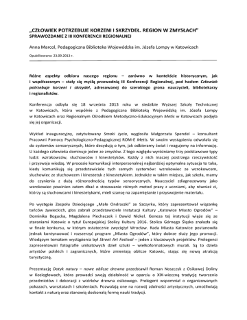 „CZŁOWIEK POTRZEBUJE KORZENI I SKRZYDEŁ. REGION W ZMYSŁACH” SPRAWOZDANIE Z III KONFERENCJI REGIONALNEJ Anna Marcol, Pedagogiczna Biblioteka Wojewódzka im. Józefa Lompy w Katowicach Opublikowano: 23.09.2013 r. Różne aspekty odbioru naszego regionu – zarówno w kontekście historycznym, jak i współczesnym – stały się myślą przewodnią III Konferencji Regionalnej, pod hasłem Człowiek potrzebuje korzeni i skrzydeł, adresowanej do szerokiego grona nauczycieli, bibliotekarzy i regionalistów. Konferencja odbyła się 18 września 2013 roku w siedzibie Wyższej Szkoły Technicznej w Katowicach, która wspólnie z Pedagogiczna Biblioteką Wojewódzką im. Józefa Lompy w Katowicach oraz Regionalnym Ośrodkiem Metodyczno-Edukacyjnym Metis w Katowicach podjęła się jej organizacji. Wykład inauguracyjny, zatytułowany Smaki życia, wygłosiła Małgorzata Spendel – konsultant Pracowni Pomocy Psychologiczno-Pedagogicznej ROM-E Metis. W swoim wystąpieniu odwołała się do systemów sensorycznych, które decydują o tym, jak odbieramy świat i reagujemy na informację. U każdego człowieka dominuje jeden ze zmysłów. Z tego względu wyróżniamy trzy podstawowe typy ludzi: wzrokowców, słuchowców i kinestetyków. Każdy z nich inaczej postrzega rzeczywistość i przyswaja wiedzę. W procesie komunikacji interpersonalnej najbardziej optymalna sytuacja to taka, kiedy komunikują się przedstawiciele tych samych systemów: wzrokowiec ze wzrokowcem, słuchowiec ze słuchowcem i kinestetyk z kinestetykiem. Jednakże w takim miejscu, jak szkoła, mamy do czynienia z dużą różnorodnością typów sensorycznych. Nauczyciel zdiagnozowany jako wzrokowiec powinien zatem dbać o stosowanie różnych metod pracy z uczniami, aby również ci, którzy są słuchowcami i kinestetykami, mieli szansę na zapamiętanie i przyswojenie materiału. Po występie Zespołu Dziecięcego „Małe Ondraszki” ze Szczyrku, który zaprezentował wiązankę tańców żywieckich, głos zabrali przedstawiciele Instytucji Kultury „Katowice Miasto Ogrodów” – Dominika Bogucka, Magdalena Piechaczek i Dawid Nickel. Geneza tej instytucji wiąże się ze staraniami Katowic o tytuł Europejskiej Stolicy Kultury 2016. Stolica Górnego Śląska znalazła się w finale konkursu, w którym ostatecznie zwyciężył Wrocław. Rada Miasta Katowice postanowiła jednak kontynuować i rozszerzyć program „Miasta Ogrodów”, który dobrze służy jego promocji. Wiodącym tematem wystąpienia był Street Art Festival – jeden z kluczowych projektów. Prelegenci zaprezentowali fotografie unikatowych dzieł sztuki – wielkoformatowych murali. Są to dzieła artystów polskich i zagranicznych, które zmieniają oblicze Katowic, stając się nową atrakcją turystyczną. Prezentację Dotyk natury – nowe oblicze drewna przedstawił Roman Noszczyk z Osikowej Doliny w Koziegłowach, która prowadzi swoją działalność w oparciu o XIX-wieczną tradycję tworzenia przedmiotów i dekoracji z wiórków drewna osikowego. Prelegent wspomniał o organizowanych pokazach, warsztatach i szkoleniach. Pozwalają one na rozwój zdolności artystycznych, umożliwiają kontakt z naturą oraz stanowią doskonałą formę nauki tradycji. Po przerwie, podczas której zwiedzano stanowiska wystawowe, wystąpili muzycy Filharmonii Śląskiej w Katowicach. Zaprezentowali wiązankę utworów muzycznych, zatytułowaną Od pomysłu do dzieła muzycznego. W ramach występu wysłuchano wybranych dzieł: Antonia Vivaldiego, Fryderyka Chopina, Stanisława Moniuszki, Henryka Wieniawskiego, Witolda Lutosławskiego, Maurice'a Ravela i Fritza Kreislera. Następnie głos zabrała dr Joanna Knapik z Muzeum Śląskiego w Katowicach, która mówiła o Roli zmysłów w edukacji kulturowej. Nawiązując do osobistych doświadczeń z pracy nauczyciela i muzealnika, podkreśliła rolę metod aktywizujących w nauczaniu historii i edukacji regionalnej. Rekonstrukcje, dramy i gry dydaktyczne są sposobem na dotarcie do współczesnych uczniów, ponieważ sprawiają, że nauka staje się dla nich atrakcyjna. Kolejną prezentację, zatytułowaną Czy wszystko jest kwestią smaku? O regionalnym apetycie – kilka smacznych i niesmacznych historii, przedstawiła Aleksandra Czapla-Oslislo – autorka Ostrygi – blogu dotyczącego zagadnień kultury kulinarnej. Blogerka wspomniała o nieodkrytym bogactwie śląskiej kuchni, która jest kuchnią czterech subregionów. Zachęcała do tworzenia ogródków warzywnych oraz wprowadzania tematyki kulinarnej do szkół, ponieważ można o niej mówić w ramach różnych przedmiotów nauczania. Ostatnią prelegentką była Agnieszka Sikorska – dyrektor Biura Śląskiej Organizacji Turystycznej. Zaprezentowała Szlak Kulinarny „Śląskie Smaki”, obejmujący 35 restauracji, które pomyślnie przeszły proces certyfikacji, gwarantujący wysoki poziom serwowanych potraw i obsługi. Lokale objęte szlakiem – oraz restauracje pretendujące do otrzymania certyfikatu – co roku uczestniczą w konkursie kulinarnym, który jest doskonałą formą ich promocji. Imprezy te pokazały, jak wiele znakomitych smaków województwa jest jeszcze nieodkrytych. Potwierdziły różnorodność i bogactwo śląskiej kuchni, stereotypowo kojarzonej z tradycyjną roladą, kluskami i modrą kapustą. W konferencji uczestniczyło ponad sto osób, wśród których dominowali nauczyciele, bibliotekarze i regionaliści. Ze względu na duże zainteresowanie tematyką regionalną, cykl Człowiek potrzebuje korzeni i skrzydeł będzie kontynuowany w przyszłości.