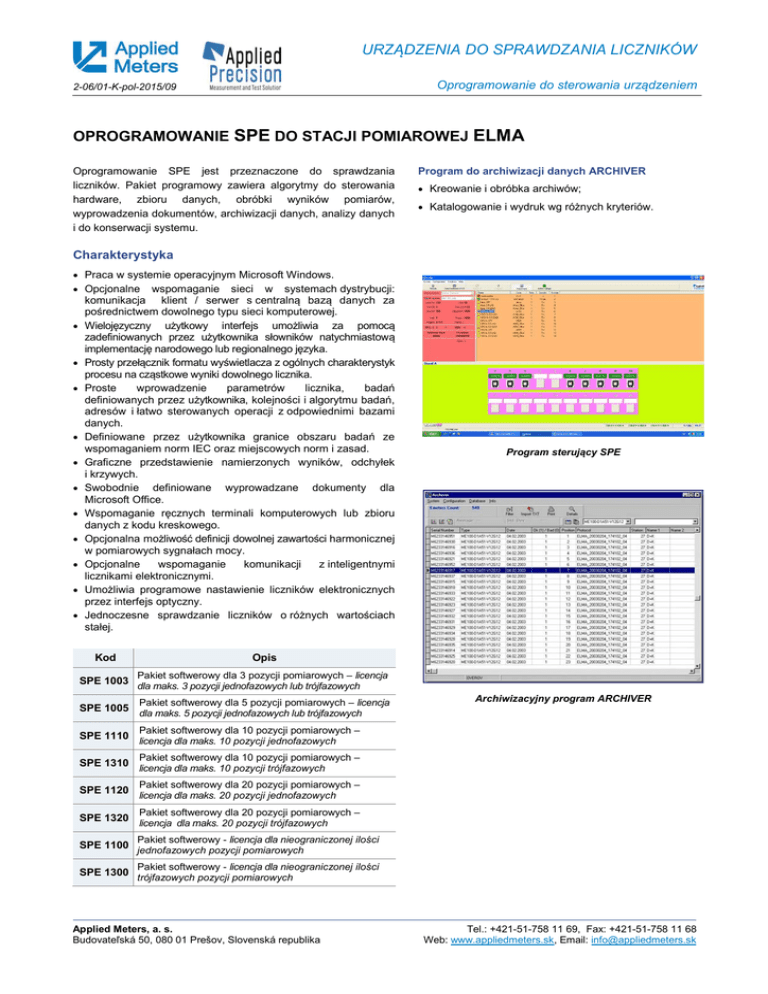 URZĄDZENIA DO SPRAWDZANIA LICZNIKÓW Oprogramowanie do sterowania urządzeniem 2-06/01-K-pol-2015/09 OPROGRAMOWANIE SPE DO STACJI POMIAROWEJ ELMA Oprogramowanie SPE jest przeznaczone do sprawdzania liczników. Pakiet programowy zawiera algorytmy do sterowania hardware, zbioru danych, obróbki wyników pomiarów, wyprowadzenia dokumentów, archiwizacji danych, analizy danych i do konserwacji systemu. Program do archiwizacji danych ARCHIVER • Kreowanie i obróbka archiwów; • Katalogowanie i wydruk wg różnych kryteriów. Charakterystyka • Praca w systemie operacyjnym Microsoft Windows. • Opcjonalne wspomaganie sieci w systemach dystrybucji: • • • • • • • • • • • komunikacja klient / serwer s centralną bazą danych za pośrednictwem dowolnego typu sieci komputerowej. Wielojęzyczny użytkowy interfejs umożliwia za pomocą zadefiniowanych przez użytkownika słowników natychmiastową implementację narodowego lub regionalnego języka. Prosty przełącznik formatu wyświetlacza z ogólnych charakterystyk procesu na cząstkowe wyniki dowolnego licznika. Proste wprowadzenie parametrów licznika, badań definiowanych przez użytkownika, kolejności i algorytmu badań, adresów i łatwo sterowanych operacji z odpowiednimi bazami danych. Definiowane przez użytkownika granice obszaru badań ze wspomaganiem norm IEC oraz miejscowych norm i zasad. Graficzne przedstawienie namierzonych wyników, odchyłek i krzywych. Swobodnie definiowane wyprowadzane dokumenty dla Microsoft Office. Wspomaganie ręcznych terminali komputerowych lub zbioru danych z kodu kreskowego. Opcjonalna możliwość definicji dowolnej zawartości harmonicznej w pomiarowych sygnałach mocy. Opcjonalne wspomaganie komunikacji z inteligentnymi licznikami elektronicznymi. Umożliwia programowe nastawienie liczników elektronicznych przez interfejs optyczny. Jednoczesne sprawdzanie liczników o różnych wartościach stałej. Kod Program sterujący SPE Opis Pakiet softwerowy dla 3 pozycji pomiarowych – licencja SPE 1003 dla maks. 3 pozycji jednofazowych lub trójfazowych SPE 1005 Pakiet softwerowy dla 5 pozycji pomiarowych – licencja dla maks. 5 pozycji jednofazowych lub trójfazowych SPE 1110 Pakiet softwerowy dla 10 pozycji pomiarowych – licencja dla maks. 10 pozycji jednofazowych SPE 1310 Pakiet softwerowy dla 10 pozycji pomiarowych – licencja dla maks. 10 pozycji trójfazowych SPE 1120 Pakiet softwerowy dla 20 pozycji pomiarowych – licencja dla maks. 20 pozycji jednofazowych SPE 1320 Pakiet softwerowy dla 20 pozycji pomiarowych – licencja dla maks. 20 pozycji trójfazowych SPE 1100 Pakiet softwerowy - licencja dla nieograniczonej ilości jednofazowych pozycji pomiarowych SPE 1300 Pakiet softwerowy - licencja dla nieograniczonej ilości trójfazowych pozycji pomiarowych Applied Meters, a. s. Budovateľská 50, 080 01 Prešov, Slovenská republika Archiwizacyjny program ARCHIVER Tel.: +421-51-758 11 69, Fax: +421-51-758 11 68 Web: www.appliedmeters.sk, Email: [email protected]