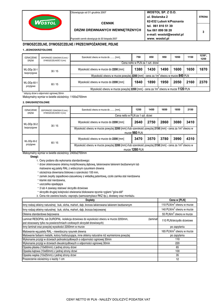 Obowiązuje od 01 grudnia 2007 CENNIK DRZWI DREWNIANYCH WEWNĘTRZNYCH Poprzedni cennik obowiązuje do 30 listopada 2007 WOSTOL SP. Z O.O. ul. Stolarska 2 62-032 Luboń k/Poznania tel. 061 810 51 39 fax 061 899 58 20 e-mail: [email protected] www. wostol.pl STRONA 3 DYMOSZCZELNE, DYMOSZCZELNE / PRZECIWPOŻAROWE, PEŁNE 1. JEDNOSKRZYDŁOWE OZNACZENIE DRZWI ODPORNOŚĆ OGNIOWA EI [min] / DYMOSZCZELNOŚĆ S [min] 750 Szerokość otworu w murze do ........ [mm], 850 950 1050 1150 1230*, 1250 1490 1600 1650 1870 Cena netto w PLN za 1 szt. drzwi WL-DDp 30-1 Wysokość otworu w murze do 2200 [mm] 30 / 15 bezprzylgowe 1380 1430 2 Wysokość otworu w murze powyżej 2200 [mm] - cena za 1m otworu w murze 840 PLN WL-DDp 60-1 Wysokość otworu w murze do 2200 [mm] 60 / 15 przylgowe 1840 1890 1950 2050 2160 2 Wysokość otworu w murze powyżej 2200 [mm] - cena za 1m otworu w murze 1120 PLN * dotyczy drzwi o odporności ogniowej 30min Maksymalny wymiar w świetle ościeżnicy: 1100x2700mm 2. DWUSKRZYDŁOWE OZNACZENIE DRZWI WL-DDp 30-2 bezprzylgowe WL-DDp 60-2 przylgowe ODPORNOŚĆ OGNIOWA EI [min] / DYMOSZCZELNOŚĆ S [min] Szerokość otworu w murze do ........ [mm], 1250 1450 1650 1850 2860 3080 2150 Cena netto w PLN za 1 szt. drzwi Wysokość otworu w murze do 2200 [mm] 30 / 15 2640 2750 3410 2 Wysokość otworu w murze powyżej 2200 [mm] i/lub szerokość powyżej 2150 [mm] - cena za 1m otworu w murze 960 PLN Wysokość otworu w murze do 2200 [mm] 3470 3570 3780 3990 60 / 15 4310 2 Wysokość otworu w murze powyżej 2200 [mm] i/lub szerokość powyżej 2150 [mm] - cena za 1m otworu w murze 1260 PLN Maksymalny wymiar w świetle ościeżnicy: 2400x2700mm Uwagi: 1. Ceny podano dla wykonania standardowego: * drzwi okleinowane okleiną modyfikowaną dębową, lakierowane lakierem bezbarwnym lub malowane wg palety RAL z widocznym rysunkiem drewna * ościeżnica drewniana blokowa o szerokości 100 mm, * zamek zwykły zapadkowo-zasuwkowy z wkładką patentową, czoło zamka stal nierdzewna * klamki stal nierdzewna, * uszczelka opadająca * 3 lub 4 zawiasy stalowe/ skrzydło drzwiowe * skrzydło drugiej kolejności otwierania blokowane ręcznie ryglami "góra-dół" 3. Cena nie zawiera kosztu: osprzętu (samozamykacz RKZ itp.), dostawy oraz montażu. Dopłaty Cena w [PLN] 2 Inny rodzaj okleiny naturalnej: buk, olcha, mahoń, dąb, brzoza lakierowana lakierem bezbarwnym 110 PLN/m otworu w murze Inny rodzaj okleiny naturalnej: buk, olcha, mahoń, dąb, brzoza bejcowanej 140 PLN/m2 otworu w murze 2 55 PLN/m otworu w murze Okleina standardowa bejcowana Laminat RESOPAL lub DUROPAL -kolekcja drzwiowa do wysokości otworu w murze 2200mm, jest stosowany tylko na powierzchniach czołowych skrzydeł drzwiowych) Inny laminat oraz powyżej wysokości 2200mm w murze (laminat Malowanie wg palety RAL - niewidoczny rysunek drewna Malowanie farbami metalik, kolory fosforyzujące, inne okleiny naturalne niż wymienione powyżej Wykonanie przylgi w drzwiach jednoskrzydłowych o odporności ogniowej 30min Wykonanie przylgi w drzwiach dwuskrzydłowych o odporności ogniowej 30min Opaska płaska (10x60mm) z jednej strony drzwi Opaska kątowa (10x60mm) z jednej strony drzwi Opaska wąska (10x25mm) z jednej strony drzwi Poszerzenie ościeżnicy o każdy 1 cm CENY NETTO W PLN - NALEŻY DOLICZYĆ PODATEK VAT 110 PLN/skrzydło drzwiowe po zapytaniu 165 PLN/m2 otworu w murze po zapytaniu 110 220 65 100 35 12 2370
