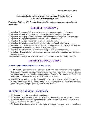 Pasym, dnia 11.10.2005r. Sprawozdanie z działalności Burmistrza Miasta Pasym w okresie międzysesyjnym. Pomiędzy XXV a XXVI sesją Rady Miejskiej zajmowałam się następującymi sprawami: REFERAT FINANSOWY 1. wydałam 8 postanowień w sprawie wszczęcia postępowania podatkowego 2. wydałam 56 decyzji wymiarowych na łączne zobowiązanie podatkowe, 3. wydałam 10 decyzji w sprawie umorzenia łącznego zobowiązania podatkowego, 4. wydałam 3 decyzje w sprawie odroczenia spłat podatkowych 5. wydałam 1 decyzję w sprawie udzielenia ulgi żołnierskiej 6. wydałam 1 decyzję w sprawie udzielenia ulgi z tytułu nabycia gruntu, 7. wydałam 2 postanowienia o wszczęciu postępowania w sprawie określenia zobowiązania w podatku od środków transportowych, 8. wydałam 1 postanowienie o pozostawieniu podania bez rozpatrzenia, 9. wydałam 1 decyzję o odroczeniu terminu płatności podatku od środków transportowych, 10.wydałam 1 decyzję o rozłożeniu na raty podatku od środków transportowych. REFERAT ROZWOJU GMINY PLANOWANIE PRZESTRZENNE I INWESTYCJE • 15.09.2005r. - przeprowadzono dyskusję publiczną nad rozwiązaniami przyjętymi do projektu "zmiany miejscowego planu zagospodarowania przestrzennego terenu półwyspu Ostrów w obrębie geodezyjnym Pasym". W trakcie dyskusji nie wniesiono postulatów o o inne zmiany do projektu planu. • 3.10.2005r zwróciłam się do Gminnej Komisji Urbanistyczno- Architektonicznej o zaopiniowanie projektu „miejscowego planu zagospodarowania przestrzennego gminy Pasym w obrębie geodezyjnym Rusek Wielki". DECYZJE O WARUNKACH ZABUDOWY 1. Wydałam 6 decyzji o warunkach zabudowy. 2. Wszczęłam postępowanie w sprawie wydania 16 decyzji o warunkach zabudowy. 3. Wydałam 21 zaświadczeń o przeznaczeniu nieruchomości w miejscowym planie zagospodarowania przestrzennego 4. Wydałam 2 postanowienia o wszczęciu z urzędu postępowania o ustaleniu jednorazowej opłaty z tytułu wzrostu wartości nieruchomości związanej z uchwaleniem miejscowego planu zagospodarowania przestrzennego w obrębie geodezyjnym Miłuki gmina Pasym. 5. Dnia 4.10.2005r. Został rozstrzygnięty przetarg na budowę ciągu pieszo-jezdnego od gimnazjum do ul. Leśnej (przetarg wygrała firma PUDIZ ze Szczytna) OŚWIETLENIE 1. 10.10.2005r rozpoczęto modernizację oświetlenia drogowego miasta Pasym. DROGI ● Uzgodniłam cztery projekty dotyczące umieszczenia w pasach drogowych urządzeń niezwiązanych z funkcjonowaniem drogi. ● Wydałam jedną decyzję na zajęcie pasa drogowego w miejscowości Siedliska, działka 146 obręb Siedliska. ● Wykonany został II etap profilowania dróg gruntowych na terenie gminy Pasym. ● Wszczęłam procedury tworzenia planu akcji zimowej 2005/2006r. ZAMÓWIENIA PUBLICZNE • 8.09.2005r podpisałam umowę na wykonanie robót budowlanych polegających na: modernizacji kotłowni c.o. w budynku Urzędu Miasta z zakupem i wymianą kotła c.o. oraz zbiornika wyrównawczego na wieży. Wykonawca robót: Przedsiębiorstwo Handlowo-Usługowe "BO-DAR" Sp. Jawna, Szczytno ul. Polna 18. UTRZYMANIE CZYSTOŚCI ● ● Wysłałam 54 wezwania do uporządkowania nieruchomości na terenie miasta Pasym. Wysłałam 1 wezwanie do podpisania umowy na wywóz odpadów komunalnych. WYCINKA DRZEW ● Wpłynęło 10 wniosków o wydanie zezwolenia na usunięcie drzew z czego: - wydałam 8 decyzji pozytywnych - 2 wnioski są w toku ● Wysłałam 2 wnioski do Starosty Szczycieńskiego o wydanie zezwolenia na usunięcie drzew z terenów gminnych REFERAT ORGANIZACYJNO-SPOŁECZNY EWIDENCJA DZIAŁALNOŚCI GOSPODARCZEJ: –wpisałam 4 podmioty gospodarcze, –dokonałam 6 zmian we wpisie do ewidencji gospodarczej, –wykreśliłam 8 podmiotów gospodarczych. Decyzje administracyjne: wygasiłam 3 zezwolenia na sprzedaż napojów alkoholowych, w tym: 1 – do 4,5% alkoholu oraz piwa, 1 – od 4,5% do 18% alkoholu, 1 - powyżej 18% alkoholu, Sprawy bezrobotnych: zawarłam 3 umowy z Powiatowym Urzędem Pracy , w tym: - 2 na odbycie stażu absolwenckiego dla 2 osób, na 6 m-cy, - 1 na przygotowanie zawodowe dla 1 osoby , na 6 m-cy. W zakresie promocji zdrowia: W ramach Polskiego Projektu 400 Miast zorganizowałam w dniach 5 – 9 września 2005r. tydzień bezpłatnych badań przesiewowych tj. pomiar ciśnienia tętniczego krwi, badanie poziomu cukru i cholesterolu we krwi. Podczas tygodniowych badań przyjęto 281 osób, z tego 93 osoby skierowano do lekarza z powodu: – 43 osoby – wysokiego poziomu cholesterolu, – 24 osoby – wysokiego poziomu glukozy, – 26 osób - wysokiej wartości ciśnienia . OŚWIATA – – – • • • • wydałam zgodę na indywidualne nauczanie dla trzech uczniów gminy Pasym rozpoczęto prace nad wdrożeniem programu “Znakowanie Turystyczne Warmii i Mazur” Komisja do spraw opiniowania stypendium szkolnego rozpatrzyła 262 wnioski w sprawie przyznania stypendium. (do dnia 10 października br. wszystkie decyzje zostały wydane.) dnia 22. 09. 2005 r. - zorganizowałam spotkanie z dyrektorami szkół w celu omówienia bieżących spraw z zakresu zarządzania szkołami na terenie miasta i gminy Pasym dnia 30.09.2005 r. - uczestniczyłam w uroczystości ślubowania klas pierwszych Szkoły Podstawowej w Pasymiu 1. 10. 2005 r. - przedstawiciel Pani Burmistrz wziął udział w uroczystości nadania Publicznemu Gimnazjum w Dźwierzutach imienia Krzysztofa Klenczona 04.10. 2005 r. - Sekretarz Miasta uczestniczył w spotkaniu dyrektorów szkół w Publicznym Gimnazjum w Pasymiu z Panią wizytator Kuratorium Oświaty w Olsztynie DZIAŁALNOŚCI PEŁNOMOCNIKA DS. ROZWIĄZYWANIA PROBLEMÓW ALKOHOLOWYCH 1. Odbyły się dwa festyny profilaktyczno- rekreacyjne -10 września 2005r. na boisku wiejskim w Tylkowie odbył się Rodzinny Festyn pod hasłem “ Integracja Trzech Pokoleń” zorganizowany wspólnie przez trzy sołectwa Tylkowo, Michałki i Rutki 2. 10 września 2005r. w Rusku Wielkim odbył się Rodzinny Festyn profilaktyczno- rekreacyjny dla 