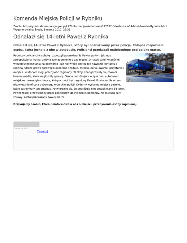 Komenda Miejska Policji w Rybniku Źródło: http://rybnik.slaska.policja.gov.pl/k22/informacje/wiadomosci/172687,Odnalazl-sie-14-letni-Pawel-z-Rybnika.html Wygenerowano: Środa, 8 marca 2017, 22:35 Odnalazł się 14-letni Paweł z Rybnika Odnalazł się 14-letni Paweł z Rybnika, który był poszukiwany przez policję. Chłopca rozpoznała osoba, która jechała z nim w autobusie. Policjanci przekazali małoletniego pod opiekę matce. Rybniccy policjanci w sobotę rozpoczęli poszukiwania Pawła, po tym jak jego zaniepokojona matka, złożyła zawiadomienie o zaginięciu. 14-latek dzień wcześniej wyszedł z mieszkania na podwórko i już nie wrócił ani też nie nawiązał kontaktu z rodziną. Stróże prawa sprawdzili okoliczne szpitale, ośrodki, parki, dworce, przystanki i miejsca, w których mógł przebywać zaginiony. W akcję zaangażowały się również lokalne media, które nagłośniły sprawę. Osoba podróżująca w tym dniu autobusem miejskim, zauważyła chłopca, którym mógł być zaginiony Paweł. Powiadomiła o tym niezwłocznie oficera dyżurnego rybnickiej policji. Dyżurny wysłał na miejsce patrole, które zatrzymały ten autobus. Potwierdziło się, że podróżuje nim poszukiwany 14-latek. Paweł został przewieziony przez policjantów do rybnickiej komendy. Na miejscu cały i zdrowy, został przekazany swojej matce. Dziękujemy osobie, która poinformowała nas o miejscu przebywania osoby zaginionej. Ocena: 0/5 (0) Tweetnij