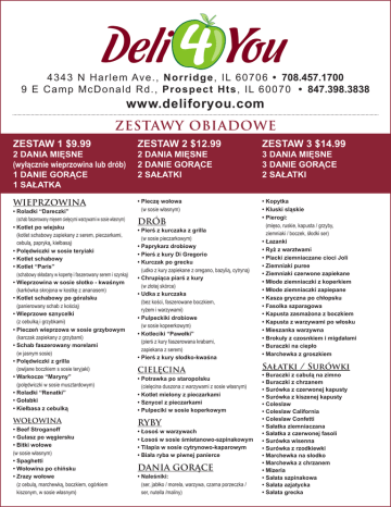4343 N H a r l e m Av e . , N o r rid g e, IL 6 0 7 0 6 • 708.457.1700 9 E C amp M c D o n a l d R d . , P r o sp e c t Ht s , IL 6 0 0 7 0 • 847.398.3838 www.deliforyou.com zestawy obiadowe zestaw 1 $9.99 zestaw 2 $12.99 zestaw 3 $14.99 wieprzowina • Pieczę wołowa (w sosie własnym) • Kopytka • Kluski sląskie • Pierogi: (mięso, ruskie, kapusta / grzyby, ziemniaki / boczek, śłodki ser) • Łazanki • Ryż z warztwami • Placki ziemniaczane cioci Joli • Ziemniaki puree • Ziemniaki czerwone zapiekane • Młode ziemniaczki z koperkiem • Młode ziemniaczki zapiepane • Kasza gryczna po chłopsku • Fasolka szparagowa • Kapusta zasmażona z boczkiem • Kapusta z warzywami po włosku • Mieszanka warzywna • Brokuły z czosnkiem i migdałami • Buraczki na ciepło • Marchewka z groszkiem 2 dania mięsne (wyłącznie wieprzowina lub drób) 1 danie gorące 1 sałatka • Roladki “Dareczki” (schab faszerowany mięsem cielęcymi warzywami w sosie własnym) • Kotlet po wiejsku (kotlet schabowy zapiekany z serem, pieczarkami, cebulą, papryką, kiełbasą) • Polędwiczki w sosie teryiaki • Kotlet schabowy • Kotlet “Paris” (schabowy składany w kopertę i faszerowany serem i szynką) • Wieprzowina w sosie słotko - kwaśnym (karkówka skrojona w kostkę z ananasem) • Kotlet schabowy po góralsku (panierowany schab z kością) • Wieprzowe sznycelki (z cebulką i grzybkami) • Pieczeń wieprzowa w sosie grzybowym (karczak zapiekany z grzybami) • Schab faszerowany morelami (w jasnym sosie) • Polędwiczki z grilla (owijane boczkiem s sosie teryjaki) • Warkocze “Maryny” (polędwiczki w sosie musztardowym) • Roladki “Renatki” • Gołabki • Kiełbasa z cebulką Wołowina • Beef Stroganoff • Gulasz po węgiersku • Bitki wołowe (w sosie własnym) • Spaghetti • Wołowina po chińsku • Zrazy wołowe (z cebulą, marchewką, boczkiem, ogórkiem kiszonym, w sosie własnym) 2 dania mięsne 2 danie gorące 2 sałatki Drób • Pierś z kurczaka z grilla (w sosie pieczarkowym) • Paprykarz drobiowy • Pierś z kury Di Gregorio • Kurczak po grecku (udko z kury zapiekane z oregano, bazylią, cytryną) • Chrupiąca piarś z kury (w złotej skórce) • Udka z kurczaka (bez kości, faszerowane boczkiem, ryżem i warzywami) • Pulpeckiki drobiowe (w sosie kopeerkowym) • Kotleciki “Pawełki” (pierś z kury faszerowana krabami, zapiekana z serem) • Pierś z kury słodko-kwaśna Cielęcina • Potrawka po staropolsku (cielęcina duszona z warzywami z sosie własnym) • Kotlet mielony z pieczarkami • Sznycel z pieczarkami • Pulpeciki w sosie koperkowym Ryby • Łosoś w warzywach • Łosoś w sosie śmietanowo-szpinakowym • Tilapia w sosie cytrynowo-kaparowym • Biała ryba w piwnej panierce Dania Gorące • Naleśniki: (ser, jabłko / morela, warzywa, czarna porzeczka / ser, nutella /maliny) 3 dania mięsne 3 danie gorące 2 sałatki Sałatki / Surówki • Buraczki z cabulą na zimno • Buraczki z chrzanem • Surówka z czerwonej kapusty • Surówka z kiszenej kapusty • Coleslaw • Coleslaw California • Coleslaw Confetti • Sałatka ziemniaczana • Sałatka z czerwonej fasoli • Surówka wisenna • Surówka z rzodkiewki • Marchewka na słodko • Marchewka z chrzanem • Mizeria • Sałata szpinakowa • Sałata azjatycka • Sałata grecka