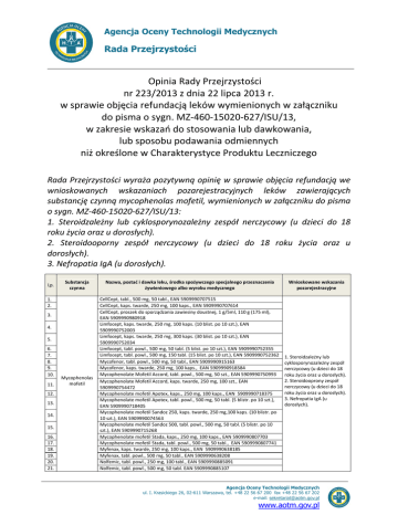 Agencja Oceny Technologii Medycznych Rada Przejrzystości Opinia Rady Przejrzystości nr 223/2013 z dnia 22 lipca 2013 r. w sprawie objęcia refundacją leków wymienionych w załączniku do pisma o sygn. MZ-460-15020-627/ISU/13, w zakresie wskazań do stosowania lub dawkowania, lub sposobu podawania odmiennych niż określone w Charakterystyce Produktu Leczniczego Rada Przejrzystości wyraża pozytywną opinię w sprawie objęcia refundacją we wnioskowanych wskazaniach pozarejestracyjnych leków zawierających substancję czynną mycophenolas mofetil, wymienionych w załączniku do pisma o sygn. MZ-460-15020-627/ISU/13: 1. Steroidzależny lub cyklosporynozależny zespół nerczycowy (u dzieci do 18 roku życia oraz u dorosłych). 2. Steroidooporny zespół nerczycowy (u dzieci do 18 roku życia oraz u dorosłych). 3. Nefropatia IgA (u dorosłych). Lp. Substancja czynna 1. 2. 3. 4. 5. 6. 7. 8. 9. 10. 11. 12. 13. 14. 15. 16. 17. 18. 19. 20. 21. Mycophenolas mofetil Nazwa, postać i dawka leku, środka spożywczego specjalnego przeznaczenia żywieniowego albo wyrobu medycznego CellCept, tabl., 500 mg, 50 tabl., EAN 5909990707515 CellCept, kaps. twarde, 250 mg, 100 kaps., EAN 5909990707614 CellCept, proszek do sporządzania zawiesiny doustnej, 1 g/5ml, 110 g (175 ml), EAN 5909990980918 Limfocept, kaps. twarde, 250 mg, 100 kaps. (10 blist. po 10 szt.), EAN 5909990752003 Limfocept, kaps. twarde, 250 mg, 300 kaps. (30 blist. po 10 szt.), EAN 5909990752034 Limfocept, tabl. powl., 500 mg, 50 tabl. (5 blist. po 10 szt.), EAN 5909990752355 Limfocept, tabl. powl., 500 mg, 150 tabl. (15 blist. po 10 szt.), EAN 5909990752362 Mycofenor, tabl. powl., 500 mg, 50 tabl., EAN 5909990915163 Mycofenor, kaps. twarde, 250 mg, 100 kaps., EAN 5909990918584 Mycophenolate Mofetil Accord, tabl. powl., 500 mg, 50 szt., EAN 5909990750993 Mycophenolate Mofetil Accord, kaps. twarde, 250 mg, 100 szt., EAN 5909990754472 Mycophenolate mofetil Apotex, kaps., 250 mg, 100 kaps., EAN 5909990718375 Mycophenolate mofetil Apotex, tabl. powl., 500 mg, 50 tabl. (5 blistr. po 10 szt.), EAN 5909990718405 Mycophenolate mofetil Sandoz 250, kaps. twarde, 250 mg,100 kaps. (10 blistr. po 10 szt.), EAN 5909990074563 Mycophenolate mofetil Sandoz 500, tabl. powl., 500 mg, 50 tabl. (5 blistr. po 10 szt.), EAN 5909990715268 Mycophenolate mofetil Stada, kaps., 250 mg, 100 kaps., EAN 5909990807703 Mycophenolate mofetil Stada, tabl. powl., 500 mg, 50 tabl., EAN 5909990807741 Myfenax, kaps. twarde, 250 mg, 100 kaps., EAN 5909990638185 Myfenax, tabl. powl., 500 mg, 50 tabl., EAN 5909990638208 Nolfemic, tabl. powl., 250 mg, 100 tabl., EAN 5909990885091 Nolfemic, tabl. powl., 500 mg, 50 tabl. EAN 5909990885107 Wnioskowane wskazania pozarejestracyjne 1. Steroidzależny lub cyklosporynozależny zespół nerczycowy (u dzieci do 18 roku życia oraz u dorosłych). 2. Steroidooprony zespół nerczycowy (u dzieci do 18 roku życia oraz u dorosłych). 3. Nefropatia IgA (u dorosłych). Agencja Oceny Technologii Medycznych ul. I. Krasickiego 26, 02-611 Warszawa, tel. +48 22 56 67 200 fax +48 22 56 67 202 e-mail: [email protected] www.aotm.gov.pl Opinia Rady Przejrzystości AOTM nr 223/2013 z dnia 22 lipca 2013 r. Uzasadnienie Obecnie część z wymienionych preparatów mykofenolan mofetylu jest refundowana we wskazaniach pozarejestracyjnych w steroidozależnym i cyklosporynozależnym zespole nerczycowym u dzieci i dorosłych oraz w steroidoopornym zespole nerczycowym u dzieci do 18 r życia. Cyklosporyna jest lekiem nefrotoksycznym, więc słuszne jest preferowanie nienefrotoksycznego mykofenolanu mofetylu także w przypadkach steroidozależnego zespołu nerczycowego u dorosłych. Zamiana spójnika „i” na „lub” umożliwi stosowanie mykofenolanu mofetylu w steroidozależnym zespole nerczycowym, bez konieczności wykazania cyklosporynozależności. Stosowanie mykofenolanu mofetylu w stroidozależnym i steroidoopornym zespole nerczycowym u dorosłych oraz w nefropatii IgA jest uzasadnione w świetle dowodów naukowych i obecnej tendencji do unikania w glomerulopatiach leków nefrotoksycznych. Przedmiot zlecenia Przedmiotem zlecenia Ministra Zdrowia było przygotowanie opinii Rady Przejrzystości w sprawie wydania z urzędu decyzji o objęciu refundacją leków wymienionych w załączniku do pisma zlecającego (pismo z dnia 4 lipca 2013 r. o sygnaturze MZ-PLA-460-15020-627/ISU/13). W załączniku wymieniono jedną substancję czynną – mycophenolas mofetil. Odpowiednie produkty lecznicze i wnioskowane wskazania pozarejestracyjne zawiera poniższa tabela. Lp. Substancja czynna 1. 2. 3. 4. 5. 6. 7. 8. 9. 10. 11. 12. 13. 14. 15. 16. 17. 18. 19. 20. 21. Mycophenolas mofetil Nazwa, postać i dawka leku, środka spożywczego specjalnego przeznaczenia żywieniowego albo wyrobu medycznego CellCept, tabl., 500 mg, 50 tabl., EAN 5909990707515 CellCept, kaps. twarde, 250 mg, 100 kaps., EAN 5909990707614 CellCept, proszek do sporządzania zawiesiny doustnej, 1 g/5ml, 110 g (175 ml), EAN 5909990980918 Limfocept, kaps. twarde, 250 mg, 100 kaps. (10 blist. po 10 szt.), EAN 5909990752003 Limfocept, kaps. twarde, 250 mg, 300 kaps. (30 blist. po 10 szt.), EAN 5909990752034 Limfocept, tabl. powl., 500 mg, 50 tabl. (5 blist. po 10 szt.), EAN 5909990752355 Limfocept, tabl. powl., 500 mg, 150 tabl. (15 blist. po 10 szt.), EAN 5909990752362 Mycofenor, tabl. powl., 500 mg, 50 tabl., EAN 5909990915163 Mycofenor, kaps. twarde, 250 mg, 100 kaps., EAN 5909990918584 Mycophenolate Mofetil Accord, tabl. powl., 500 mg, 50 szt., EAN 5909990750993 Mycophenolate Mofetil Accord, kaps. twarde, 250 mg, 100 szt., EAN 5909990754472 Mycophenolate mofetil Apotex, kaps., 250 mg, 100 kaps., EAN 5909990718375 Mycophenolate mofetil Apotex, tabl. powl., 500 mg, 50 tabl. (5 blistr. po 10 szt.), EAN 5909990718405 Mycophenolate mofetil Sandoz 250, kaps. twarde, 250 mg,100 kaps. (10 blistr. po 10 szt.), EAN 5909990074563 Mycophenolate mofetil Sandoz 500, tabl. powl., 500 mg, 50 tabl. (5 blistr. po 10 s