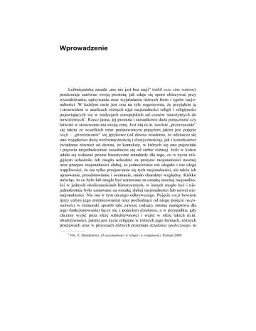 Wprowadzenie Leibnicjańska zasada „nic nie jest bez racji” (nihil esse sine ratione) przekonuje zarówno swoją prostotą, jak zdaje się sporo obiecywać przy wyszukiwaniu, opisywaniu oraz wyjaśnianiu różnych form i typów racjonalności. W każdym razie jest ona na tyle sugestywna, że przyjąłem ją i stosowałem w analizach różnych ujęć racjonalności religii i religijności pojawiających się w tradycjach europejskich od czasów starożytnych do nowożytnych1. Rzecz jasna, jej prostota i stosunkowo duża poręczność czy łatwość w stosowaniu ma swoją cenę. Jest nią m.in. swoiste „przerzucanie” się takim ze wszelkich miar podstawowym pojęciem jakim jest pojęcie racji – „przerzucanie” się językowe (od dawna wiadomo, że odznacza się ono wyjątkowo dużą wieloznacznością i elastycznością), jak i kontekstowe (wiadomo również od dawna, że konteksty, w których się ono pojawiało i pojawia niejednokrotnie zasadniczo się od siebie różnią). Jeśli w końcu udało się wskazać pewne historyczne standardy dla tego, co w życiu religijnym uchodziło lub mogło uchodzić za przejaw racjonalności mocnej oraz przejaw racjonalności słabej, to jednocześnie nie ulegało i nie ulega wątpliwości, że nie tylko przejawianie się tych racjonalności, ale także ich ujmowanie, przedstawianie i ocenianie, miało charakter względny. Krótko mówiąc, to co było lub mogło być uznawane za oznakę mocnej racjonalności w jednych okolicznościach historycznych, w innych mogło być i niejednokrotnie było uznawane za oznakę słabej racjonalności lub nawet nieracjonalności. Nie ma w tym niczego odkrywczego. Pojęcie racji bowiem (przy całym jego zróżnicowaniu) oraz pochodzące od niego pojęcie racjonalności w różnoraki sposób (ale zawsze rodzący istotne następstwa dla jego funkcjonowania) łączy się z pojęciem działania, a w przypadku, gdy chcemy wyjść poza sferę subiektywności i wejść w sferę takich m.in. obiektywności, jakimi jest życie religijne w różnych jego formach, różnych przejawach oraz w procesach różnych przemian działania społecznego, to ________________________ 1 Por. Z. Drozdowicz, O racjonalności w religii i w religijności, Poznań 2009. 8 Wprowadzenie znaczy – mówiąc słowami Maxa Webera – „działania zorientowanego na przeszłe, obecne lub oczekiwane w przyszłości zachowanie innych ludzi”. Można zatem powiedzieć, że przy tak zorientowanym pragnieniu nie tylko „nic nie jest bez racji”, ale także „nie ma żadnej racji bez działania społecznego”. Tej rozszerzonej formuły racjonalności trzymam się w analizowanych i prezentowanych tutaj ujęciach religii i religijności. Na potrzebę jej stosowania w takim rozszerzeniu wskazują m.in. prezentowani w tym zbiorze wykładów filozofowie i uczeni – Émile Durkheim, Max Weber, William James, Gerardus van der Leeuw, Mirce Eliade, Rodney Stark, William S. Bainbridge, Peter L. Berger, Thomas Luckmann i Niklas Luhmann. Jej przyjęcie oznacza – poza wszystkim innym – konieczność odejścia od operowania dualnym schematem racjonalność i irracjonalność oraz wprowadzania znacznie bardziej złożonych opozycji i dopełnień. Próbę ich wprowadzenia podjęli już „ojcowie założyciele” współczesnej socjologii, to jest Durkheim i Weber, ale – jak pokazały późniejsze dyskusje wokół ich stanowisk – problemu tego nie rozwiązali na tyle poprawnie, aby mogło to zadowolić współczesnych socjologów, religioznawców oraz przedstawicieli innych jeszcze dyscyplin społecznych. Zgłaszane przez nich korekty łączy przekonanie, że w analizowaniu, opisywaniu i wyjaśnieniu takiego zjawiska społecznego jakim jest religia i religijność proste schematy, proste formuły językowe, czy też proste rozwiązania mają ograniczone zastosowanie, a schematyzacja, upraszczanie czy redukowanie problemów złożonych do prostszych ich części składowych jest wprawdzie zasadne, ale musi podlegać takim zasadom, które mają swoje wyraźnie określone i wyłożone racje (i w tym sensie są racjonalne). Inaczej mówiąc, powinno ono być uwikłane w takie sprawdzone (i sprawdzalne) procedury postępowania naukowego, o których można z przekonaniem powiedzieć, że spełniają współczesne kryteria naukowości. Rzecz jasna, kryteria te również są uwikłane – w różnego rodzaju teorie i praktyki badawcze występujące w różnych dyscyplinach, w różnego rodzaju cele stawiane różnym naukom i sposoby ich osiągania, a nawet w różnego rodzaju naukowe „mody” występujące w różnych naukach społecznych. Nie jest to oczywiście pełna lista tych uwikłań. W przypadku każdego w miarę całościowego i jasno wyłożonego ujęcia religii i religijności (a tylko takie ujęcia mnie tutaj interesują) można wskazać te ogólne założenia i postulaty, które jako racje determinujące i uzasadniające stanowią dla nich swoiste credo. Ich wskazanie powinno być pewnym ułatwieniem w poruszaniu się po tak ogromnie zróżnicowa- Wprowadzenie 9 nym obszarze jakim jest refleksja przywoływanych tutaj filozofów i uczonych. Zapewne można zgłosić różnego rodzaju obiekcje i korekty do tego, co znalazło się w tym credo, w tym obiekcje dotyczące jego kompletności oraz poprawności oszacowania ich znaczenia. Dodam zatem tylko, że dla ułatwienia sobie zadania generalnie nie wchodzę w sferę prywatności przywoływanych tutaj filozofów i uczonych, w tym w sferę ich osobistej wiary – chyba że ma ona wyraźne przełożenie na proponowane przez nich obiektywizacje. Nie kwestionuję oczywiście zasadności twierdzenia, że jest to sfera, w którą uwikłane są proponowane przez nich ujęcia religii i religijności. Analizowanie i przedstawianie tych uwikłań doprowadziłoby być może do interesującego biografizmu, ale biografizmu zawierającego – jak zresztą każdy biografizm – sporą dozę incydentalności, p