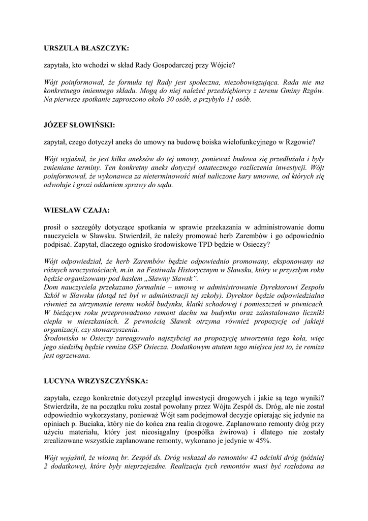 URSZULA BŁASZCZYK: zapytała, kto wchodzi w skład Rady Gospodarczej przy Wójcie? Wójt poinformował, Ŝe formuła tej Rady jest społeczna, niezobowiązująca. Rada nie ma konkretnego imiennego składu. Mogą do niej naleŜeć przedsiębiorcy z terenu Gminy Rzgów. Na pierwsze spotkanie zaproszono około 30 osób, a przybyło 11 osób. JÓZEF SŁOWIŃSKI: zapytał, czego dotyczył aneks do umowy na budowę boiska wielofunkcyjnego w Rzgowie? Wójt wyjaśnił, Ŝe jest kilka aneksów do tej umowy, poniewaŜ budowa się przedłuŜała i były zmieniane terminy. Ten konkretny aneks dotyczył ostatecznego rozliczenia inwestycji. Wójt poinformował, Ŝe wykonawca za nieterminowość miał naliczone kary umowne, od których się odwołuje i grozi oddaniem sprawy do sądu. WIESŁAW CZAJA: prosił o szczegóły dotyczące spotkania w sprawie przekazania w administrowanie domu nauczyciela w Sławsku. Stwierdził, Ŝe naleŜy promować herb Zarembów i go odpowiednio podpisać. Zapytał, dlaczego ognisko środowiskowe TPD będzie w Osieczy? Wójt odpowiedział, Ŝe herb Zarembów będzie odpowiednio promowany, eksponowany na róŜnych uroczystościach, m.in. na Festiwalu Historycznym w Sławsku, który w przyszłym roku będzie organizowany pod hasłem „Sławny Sławsk”. Dom nauczyciela przekazano formalnie – umową w administrowanie Dyrektorowi Zespołu Szkół w Sławsku (dotąd teŜ był w administracji tej szkoły). Dyrektor będzie odpowiedzialna równieŜ za utrzymanie terenu wokół budynku, klatki schodowej i pomieszczeń w piwnicach. W bieŜącym roku przeprowadzono remont dachu na budynku oraz zainstalowano liczniki ciepła w mieszkaniach. Z pewnością Sławsk otrzyma równieŜ propozycję od jakiejś organizacji, czy stowarzyszenia. Środowisko w Osieczy zareagowało najszybciej na propozycję utworzenia tego koła, więc jego siedzibą będzie remiza OSP Osiecza. Dodatkowym atutem tego miejsca jest to, Ŝe remiza jest ogrzewana. LUCYNA WRZYSZCZYŃSKA: zapytała, czego konkretnie dotyczył przegląd inwestycji drogowych i jakie są tego wyniki? Stwierdziła, Ŝe na początku roku został powołany przez Wójta Zespół ds. Dróg, ale nie został odpowiednio wykorzystany, poniewaŜ Wójt sam podejmował decyzje opierając się jedynie na opiniach p. Buciaka, który nie do końca zna realia drogowe. Zaplanowano remonty dróg przy uŜyciu materiału, który jest nieosiągalny (pospółka Ŝwirowa) i dlatego nie zostały zrealizowane wszystkie zaplanowane remonty, wykonano je jedynie w 45%. Wójt wyjaśnił, Ŝe wiosną br. Zespół ds. Dróg wskazał do remontów 42 odcinki dróg (później 2 dodatkowe), które były nieprzejezdne. Realizacja tych remontów musi być rozłoŜona na kilka najbliŜszych lat, poniewaŜ moŜliwości finansowe gminy w tym zakresie są bardzo skromne. Wyremontowano najgorsze odcinki dróg, przez co osiągnięto ich przejezdność. Pan Buciak jako ekspert zakwestionował projekt na wykonanie odwodnienia drogi w Witnicy, który był niezgodny z prawem drogowym, więc trzeba było to przeprojektować. Wybrano najtańszy materiał do remontów dróg, aby wykonać jak najwięcej. Dodatkowo wykonano drogę w Osieczy do p. Gałeckiego i w prawo oraz odcinek drogi w Kurowie. SŁAWOMIR ŁAWNICZAK: zapytał, czy są nowe pomysły na zagospodarowanie budynku dawnej szkoły w Zarzewku? Czy stwierdzono jakieś powaŜne uchybienia w trakcie kontroli NIK? Wójt poinformował, Ŝe zabezpieczono dach na budynku w Zarzewku. Jest to idealne miejsce, aby zorganizować tam tzw. dom seniora, więc trzeba szukać inwestora w tym kierunku. Budynek ten musi być teŜ dostępny do uŜytku mieszkańców Zarzewka. Wójt poprosił, aby p. Monika Lebioda – Zastępca Wójta odczytała wystąpienie pokontrolne NIK (załączono na następnej stronie). WIKTOR NAWROCKI: stwierdził, Ŝe jest jednoznaczny błąd Rady Gminy, Ŝe zrezygnowano z dalszej budowy boiska w Rzgowie i odrzucono 300 tys. dotacji ze środków unijnych na ten cel. Dlatego teŜ Rada musi zapewnić środki na odpowiednie zabezpieczenie boiska przed jego niszczeniem. Wójt stwierdził, Ŝe błąd nastąpił przy planowaniu stadionu w tym miejscu. Rezygnacja z tej inwestycji była decyzją Rady Gminy, którą Wójt poparł. W umowie z wykonawcą boiska nie zaznaczono, Ŝe wymagane jest doświadczenie w realizacji tego typu inwestycji, dlatego było duŜo usterek i budowa się przedłuŜała. Wójt poinformował, Ŝe przekazano do NIK odpowiedź na wszystkie uwagi zawarte w wystąpieniu pokontrolnym.