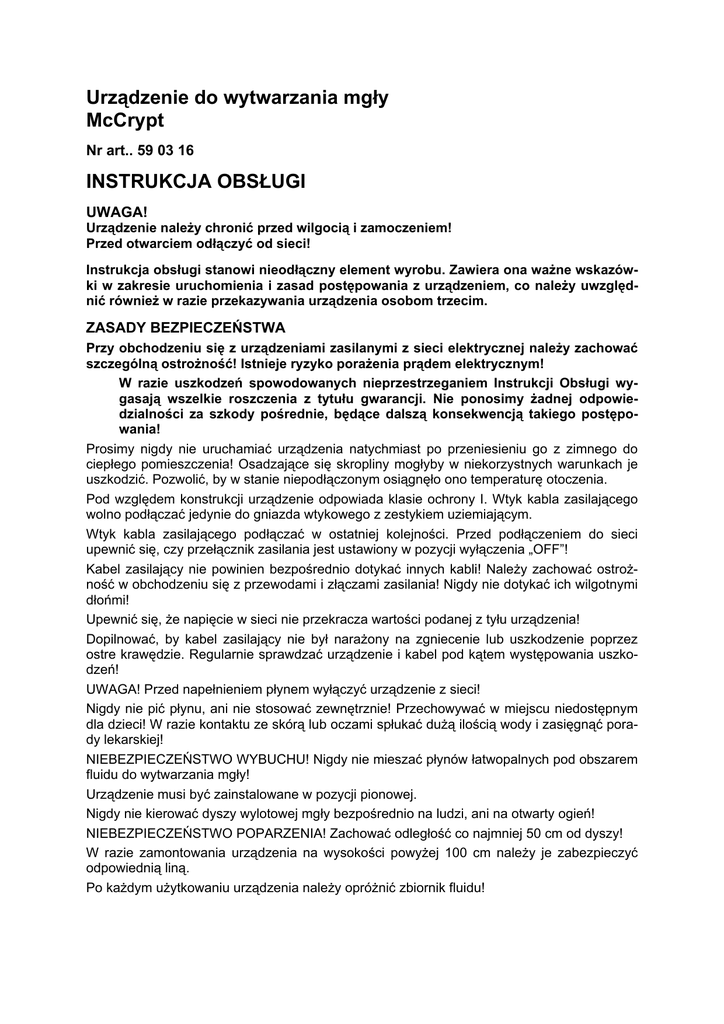 Urządzenie do wytwarzania mgły McCrypt Nr art.. 59 03 16 INSTRUKCJA OBSŁUGI UWAGA! Urządzenie należy chronić przed wilgocią i zamoczeniem! Przed otwarciem odłączyć od sieci! Instrukcja obsługi stanowi nieodłączny element wyrobu. Zawiera ona ważne wskazówki w zakresie uruchomienia i zasad postępowania z urządzeniem, co należy uwzględnić również w razie przekazywania urządzenia osobom trzecim. ZASADY BEZPIECZEŃSTWA Przy obchodzeniu się z urządzeniami zasilanymi z sieci elektrycznej należy zachować szczególną ostrożność! Istnieje ryzyko porażenia prądem elektrycznym! W razie uszkodzeń spowodowanych nieprzestrzeganiem Instrukcji Obsługi wygasają wszelkie roszczenia z tytułu gwarancji. Nie ponosimy żadnej odpowiedzialności za szkody pośrednie, będące dalszą konsekwencją takiego postępowania! Prosimy nigdy nie uruchamiać urządzenia natychmiast po przeniesieniu go z zimnego do ciepłego pomieszczenia! Osadzające się skropliny mogłyby w niekorzystnych warunkach je uszkodzić. Pozwolić, by w stanie niepodłączonym osiągnęło ono temperaturę otoczenia. Pod względem konstrukcji urządzenie odpowiada klasie ochrony I. Wtyk kabla zasilającego wolno podłączać jedynie do gniazda wtykowego z zestykiem uziemiającym. Wtyk kabla zasilającego podłączać w ostatniej kolejności. Przed podłączeniem do sieci upewnić się, czy przełącznik zasilania jest ustawiony w pozycji wyłączenia „OFF”! Kabel zasilający nie powinien bezpośrednio dotykać innych kabli! Należy zachować ostrożność w obchodzeniu się z przewodami i złączami zasilania! Nigdy nie dotykać ich wilgotnymi dłońmi! Upewnić się, że napięcie w sieci nie przekracza wartości podanej z tyłu urządzenia! Dopilnować, by kabel zasilający nie był narażony na zgniecenie lub uszkodzenie poprzez ostre krawędzie. Regularnie sprawdzać urządzenie i kabel pod kątem występowania uszkodzeń! UWAGA! Przed napełnieniem płynem wyłączyć urządzenie z sieci! Nigdy nie pić płynu, ani nie stosować zewnętrznie! Przechowywać w miejscu niedostępnym dla dzieci! W razie kontaktu ze skórą lub oczami spłukać dużą ilością wody i zasięgnąć porady lekarskiej! NIEBEZPIECZEŃSTWO WYBUCHU! Nigdy nie mieszać płynów łatwopalnych pod obszarem fluidu do wytwarzania mgły! Urządzenie musi być zainstalowane w pozycji pionowej. Nigdy nie kierować dyszy wylotowej mgły bezpośrednio na ludzi, ani na otwarty ogień! NIEBEZPIECZEŃSTWO POPARZENIA! Zachować odległość co najmniej 50 cm od dyszy! W razie zamontowania urządzenia na wysokości powyżej 100 cm należy je zabezpieczyć odpowiednią liną. Po każdym użytkowaniu urządzenia należy opróżnić zbiornik fluidu! W razie nie używania oraz przed każdym czyszczeniem wyłączyć urządzenie z sieci! Nie dopuszczać do urządzenia dzieci i osób postronnych! Nie wolno użytkować urządzenia bez nadzoru! UŻYTKOWANIE ZGODNE Z PRZEZNACZENIEM Urządzenie służy do wytwarzania gęstej mgły ze specjalnego fluidu. Produkt ten dopuszczony jest jedynie do zasilania z sieci 230 V prądu przemiennego, 50 Hz oraz przeznaczony wyłącznie do użytkowania w pomieszczeniach wewnątrz budynku. Należy unikać wstrząsów oraz stosowania siły podczas instalacji czy uruchamiania urządzenia. Wybierając miejsce zainstalowania, prosimy unikać narażania urządzenia na działanie wysokich temperatur, wilgoci oraz kurzu. Dopilnować, by żadne kable nie poniewierały się wokół luzem, narażając na niebezpieczeństwo operatora oraz osoby trzecie. Przed napełnieniem wyłączyć urządzenie z sieci! Nie wlewać do urządzenia gorących płynów! Używać wyłącznie preparatów przeznaczonych do tego typu urządzeń (zgodnie z pisemną informacją producenta), tzn. wysokiej jakości fluidów mgielnych na bazie wody, zalecanych dealerów naszych produktów. Inne fluidy mgielne mogą spowodować zapchanie urządzenia lub wyciekanie preparatu. Należy uważać, by w zbiorniku znajdowała się zawsze wystarczająca ilość fluidu mgielnego. Użytkowanie bez fluidu doprowadzi do uszkodzenia pompy i przegrzania elementu grzejnego. Urządzenie uruchamiać dopiero po zapoznaniu się z jego funkcjami. Obsługi urządzenia nie powierzać osobom postronnym, nie zaznajomionym ze sposobem obsługi. Jeśli urządzenie przestaje działać prawidłowo, to jest to zazwyczaj efekt niefachowej obsługi! Urządzenie przechowywać w suchym miejscu. Jeżeli urządzenie ma być transportowane, to należy zawsze opróżnić zbiornik i używać do transportu oryginalnego opakowania, aby uniknąć uszkodzeń. Samowolne modyfikacje urządzenia są wzbronione z przyczyn bezpieczeństwa! Zastosowanie, odbiegające od omówionego uprzednio, prowadzi do uszkodzenia wyrobu, co dodatkowo związane jest np. z ryzykiem zwarcia, pożaru itp. OPIS URZĄDZENIA Właściwości Urządzenie do wytwarzania mgły podczas imprez rozrywkowych Idealne do pomieszczeń klubowych i małych dyskotek. Wyrzucanie mgły na dużą odległość. Zdalne włączanie i wyłączanie. Pałąk do zawieszania. Wysokiej jakości termostaty. Wyłącznik dla ochrony przed przegrzaniem. Elementy urządzenia (1) Dysza wylotowa mgły (2) Obudowa (3) Pałąk do zawieszania (4) Zbiornik fluidu (5) Gniazdo przyłączeniowe pilota (6) Podstawa bezpiecznika (7) Wyłącznik (/włącznik) zasilania (8) Kabel zasilający (9) Uchwyt zabezpieczający liny URUCHOMIENIE Urządzenie ustawić na równej powierzchni. Zbiornik urządzenia trzeba napełniać fluidem zawsze przed uruchomieniem urządzenia oraz pod warunkiem wyłączenia z sieci (należy liczyć się z możliwością rozlania fluidu). Prosimy używać wysokiej jakości płynów do wytwarzania mgły. Zalecamy fluidy mgielne oferowane przez dealera urządzeń do wytwarzania mgły opatrzone zaświadczeniem o braku zastrzeżeń zdrowotnych odnośnie preparatu. Nie wolno używać materiałów zakwalifikowanych jako „substancje niebezpieczne”