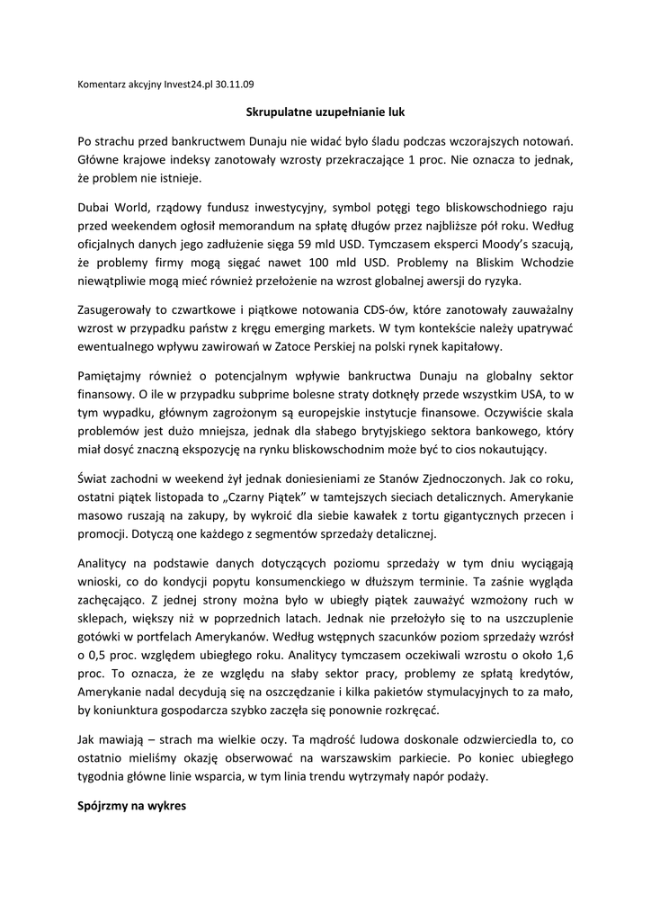 Komentarz akcyjny Invest24.pl 30.11.09 Skrupulatne uzupełnianie luk Po strachu przed bankructwem Dunaju nie widać było śladu podczas wczorajszych notowań. Główne krajowe indeksy zanotowały wzrosty przekraczające 1 proc. Nie oznacza to jednak, że problem nie istnieje. Dubai World, rządowy fundusz inwestycyjny, symbol potęgi tego bliskowschodniego raju przed weekendem ogłosił memorandum na spłatę długów przez najbliższe pół roku. Według oficjalnych danych jego zadłużenie sięga 59 mld USD. Tymczasem eksperci Moody’s szacują, że problemy firmy mogą sięgać nawet 100 mld USD. Problemy na Bliskim Wchodzie niewątpliwie mogą mieć również przełożenie na wzrost globalnej awersji do ryzyka. Zasugerowały to czwartkowe i piątkowe notowania CDS-ów, które zanotowały zauważalny wzrost w przypadku państw z kręgu emerging markets. W tym kontekście należy upatrywać ewentualnego wpływu zawirowań w Zatoce Perskiej na polski rynek kapitałowy. Pamiętajmy również o potencjalnym wpływie bankructwa Dunaju na globalny sektor finansowy. O ile w przypadku subprime bolesne straty dotknęły przede wszystkim USA, to w tym wypadku, głównym zagrożonym są europejskie instytucje finansowe. Oczywiście skala problemów jest dużo mniejsza, jednak dla słabego brytyjskiego sektora bankowego, który miał dosyć znaczną ekspozycję na rynku bliskowschodnim może być to cios nokautujący. Świat zachodni w weekend żył jednak doniesieniami ze Stanów Zjednoczonych. Jak co roku, ostatni piątek listopada to „Czarny Piątek” w tamtejszych sieciach detalicznych. Amerykanie masowo ruszają na zakupy, by wykroić dla siebie kawałek z tortu gigantycznych przecen i promocji. Dotyczą one każdego z segmentów sprzedaży detalicznej. Analitycy na podstawie danych dotyczących poziomu sprzedaży w tym dniu wyciągają wnioski, co do kondycji popytu konsumenckiego w dłuższym terminie. Ta zaśnie wygląda zachęcająco. Z jednej strony można było w ubiegły piątek zauważyć wzmożony ruch w sklepach, większy niż w poprzednich latach. Jednak nie przełożyło się to na uszczuplenie gotówki w portfelach Amerykanów. Według wstępnych szacunków poziom sprzedaży wzrósł o 0,5 proc. względem ubiegłego roku. Analitycy tymczasem oczekiwali wzrostu o około 1,6 proc. To oznacza, że ze względu na słaby sektor pracy, problemy ze spłatą kredytów, Amerykanie nadal decydują się na oszczędzanie i kilka pakietów stymulacyjnych to za mało, by koniunktura gospodarcza szybko zaczęła się ponownie rozkręcać. Jak mawiają – strach ma wielkie oczy. Ta mądrość ludowa doskonale odzwierciedla to, co ostatnio mieliśmy okazję obserwować na warszawskim parkiecie. Po koniec ubiegłego tygodnia główne linie wsparcia, w tym linia trendu wytrzymały napór podaży. Spójrzmy na wykres Rys. 1 Wykres 30 minutowy WIG-u. Skrupulatnie uzupełniane są ostatnio te poziomy, które wcześniej zostały pominięte. Nie ma tu znaczenia, czy była to luka wzrostowa czy spadkowa (na wykresie czerwona kropka symbolizuje uzupełnienie przez falę spadkową, a zielona przez falę wzrostową). To wskazuje, że teoretycznie rynek znajduje się w równowadze. Należy jednak pamiętać, że wszystkie te luki (bez pierwszej) powstały podczas krótkoterminowego trendu spadkowego. Jeśli historia miałaby się znów powtórzyć, to należy oczekiwać na domknięcie wczoraj powstałego okna cenowego. Ten spadek byłby już groźny dla hossy trwającej od wczesnej wiosny tego roku. Dawid Augustyn Analityk Invest24.pl