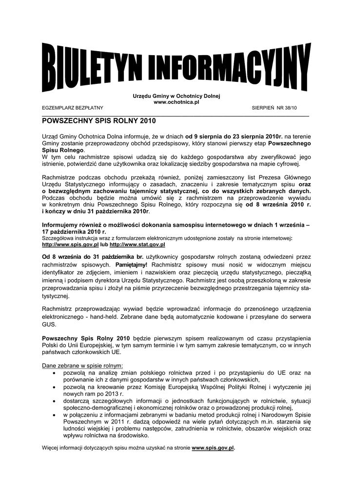 Urzędu Gminy w Ochotnicy Dolnej www.ochotnica.pl EGZEMPLARZ BEZPŁATNY SIERPIEŃ NR 38/10 __________________________________________________________________________________________ POWSZECHNY SPIS ROLNY 2010 Urząd Gminy Ochotnica Dolna informuje, Ŝe w dniach od 9 sierpnia do 23 sierpnia 2010r. na terenie Gminy zostanie przeprowadzony obchód przedspisowy, który stanowi pierwszy etap Powszechnego Spisu Rolnego. W tym celu rachmistrze spisowi udadzą się do kaŜdego gospodarstwa aby zweryfikować jego istnienie, potwierdzić dane uŜytkownika oraz lokalizację siedziby gospodarstwa na mapie cyfrowej. Rachmistrze podczas obchodu przekaŜą równieŜ, poniŜej zamieszczony list Prezesa Głównego Urzędu Statystycznego informujący o zasadach, znaczeniu i zakresie tematycznym spisu oraz o bezwzględnym zachowaniu tajemnicy statystycznej, co do wszystkich zebranych danych. Podczas obchodu będzie moŜna umówić się z rachmistrzem na przeprowadzenie wywiadu w konkretnym dniu Powszechnego Spisu Rolnego, który rozpoczyna się od 8 września 2010 r. i kończy w dniu 31 października 2010r. Informujemy równieŜ o moŜliwości dokonania samospisu internetowego w dniach 1 września – 17 października 2010 r. Szczegółowa instrukcja wraz z formularzem elektronicznym udostępnione zostały na stronie internetowej: http://www.spis.gov.pl lub http://www.stat.gov.pl Od 8 września do 31 października br. uŜytkownicy gospodarstw rolnych zostaną odwiedzeni przez rachmistrzów spisowych. Pamiętajmy! Rachmistrz spisowy musi nosić w widocznym miejscu identyfikator ze zdjęciem, imieniem i nazwiskiem oraz pieczęcią urzędu statystycznego, pieczątką imienną i podpisem dyrektora Urzędu Statystycznego. Rachmistrz jest osobą przeszkoloną w zakresie przeprowadzania spisu i złoŜył na piśmie przyrzeczenie bezwzględnego przestrzegania tajemnicy statystycznej. Rachmistrz przeprowadzając wywiad będzie wprowadzać informacje do przenośnego urządzenia elektronicznego - hand-held. Zebrane dane będą automatycznie kodowane i przesyłane do serwera GUS. Powszechny Spis Rolny 2010 będzie pierwszym spisem realizowanym od czasu przystąpienia Polski do Unii Europejskiej, w tym samym terminie i w tym samym zakresie tematycznym, co w innych państwach członkowskich UE. Dane zebrane w spisie rolnym: • pozwolą na analizę zmian polskiego rolnictwa przed i po przystąpieniu do UE oraz na porównanie ich z danymi gospodarstw w innych państwach członkowskich, • pozwolą na kreowanie przez Komisję Europejską Wspólnej Polityki Rolnej i wytyczenie jej nowych ram po 2013 r. • dostarczą szczegółowych informacji o jednostkach funkcjonujących w rolnictwie, sytuacji społeczno-demograficznej i ekonomicznej rolników oraz o prowadzonej produkcji rolnej, • w połączeniu z informacjami zebranymi w badaniu metod produkcji rolnej i Narodowym Spisie Powszechnym w 2011 r. dadzą odpowiedź na wiele pytań dotyczących m.in. starzenia się ludności wiejskiej i problemu następców, zatrudnienia w rolnictwie, obszarów wiejskich oraz wpływu rolnictwa na środowisko. Więcej informacji dotyczących spisu moŜna uzyskać na stronie www.spis.gov.pl. Str. 2 Nr 38/10 LIST PREZESA GŁÓWNEGO URZĘDU STATYSTYCZNEGO W roku 2010 we wszystkich krajach Unii Europejskiej (UE) są przeprowadzane powszechne spisy rolne. RównieŜ Polska zgodnie z ustawą z 17 lipca 2009 r. o powszechnym spisie rolnym w 2010 r. (Dz. U. Nr 126, poz. 1040), od 1 września do 31 października br. przeprowadzi Powszechny Spis Rolny 2010 (PSR 2010). Spis ten ma dla Polski szczególne znaczenie. Jest to bowiem pierwszy spis rolny po przystąpieniu naszego kraju do UE. Dane uzyskane z PSR 2010 umoŜliwią obiektywną ocenę sytuacji rolnictwa polskiego i obszarów wiejskich po włączeniu Polski do wspólnego rynku europejskiego. Obecny Powszechny Spis Rolny otwiera nowy etap w rozwoju polskiej statystyki publicznej, jakim jest prowadzenie masowych badań statystycznych przy wykorzystaniu nowoczesnych i efektywnych technologii informatycznych, jak elektroniczne rejestratory danych, telefon, czy Internet, który umoŜliwi respondentom dokonanie samodzielnego spisania się. Wykorzystamy równieŜ dane pobrane z systemów informacyjnych. Dzięki zastosowaniu efektywnych technologii informatycznych, którymi nie dysponowaliśmy jeszcze w poprzednim spisie, przeprowadzonym w 2002 r. zmniejszy się znacząco koszt zorganizowania i przeprowadzenia spisu oraz zapewnimy pełne bezpieczeństwo zebranych informacji. Zostanie równieŜ skrócony czas udziału w badaniu poświęcony przez respondentów, a zwłaszcza uŜytkowników małych gospodarstw rolnych. Realizacja spisu rolnego jest dla słuŜb statystyki publicznej i organów administracji, zwłaszcza samorządowej, zadaniem niezwykle trudnym i odpowiedzialnym, wymagającym zaangaŜowania w prace spisowe tysięcy osób i przeznaczenia odpowiednich środków finansowych. Aby wysiłek ten przyniósł oczekiwany efekt, spis musi być kompletny, co oznacza, Ŝe spisane powinny być wszystkie gospodarstwa rolne. Dlatego teŜ, jako Generalny Komisarz Spisowy i Prezes Głównego Urzędu Statystycznego, zwracam się do Państwa z gorącą prośbą o obdarzenie pracowników słuŜb spisowych, a w szczególności ankieterów statystycznych i rachmistrzów spisowych zaufaniem oraz pełny udział w spisie rolnym. Szczególnie gorąco zachęcam Państwa do samodzielnego spisania się przez Internet. Tylko Państwa pomoc przy realizacji spisu, przekazanie wyczerpujących i rzetelnych informacji pozwoli na uzyskanie pełnej wiedzy o rolnictwie polskim i wykorzystanie jego wyników do planowania polityki rolnej naszego państwa oraz efektywnego zarządzania na szczeblu ogólnokrajowym i lokalnym. LeŜy to w interesie nas wszystkich, a zwłaszcza sprzyja rozwojowi polskiej wsi i polskiego rolnictwa. Jednocześnie pragnę przypomnieć i zapewnić Państwa, Ŝe wszystkie dane indywidualne uzyskane w trakcie 