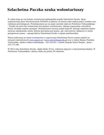 Szlachetna Paczka szuka wolontariuszy W całym kraju po raz kolejny wystartował ogólnopolski projekt Szlachetna Paczka. Akcja organizowana przez Stowarzyszenie WIOSNA za główny cel stawia sobie mądrą pomoc osobom oraz rodzinom potrzebującym. Przedsięwzięcie po raz piąty zawitało także do Piotrkowa Trybunalskiego. - Projekt nie może być realizowany bez pomocy wolontariuszy, dlatego zapraszamy wszystkich, którzy chcieliby mądrze pomagać. Wolontariusze stworzą zespół SuperW, którego zadaniem będzie zarówno odnalezienie rodzin, którym potrzebna jest pomoc, jak i darczyńców, będących w stanie przygotować pomoc – opisują liderzy Szlachetnej Paczki w rejonie piotrkowskim. Więcej informacji na temat uczestnictwa w tegorocznej Szlachetnej Paczce można znaleźć na stronach internetowych www.superw.pl i www.szlachetnapaczka.pl oraz u Lidera Rejonu Piotrków Trybunalski i okolice Oskara Kulińskiego – 503 418 847 i Liderki Zespołu Sylwii Warpas - Janus 533 173 248. W 2014 roku Szlachetna Paczka objęła blisko 20 tys. rodzinom żyjącym w niezawinionej biedzie. W Piotrkowie Trybunalskim i okolicy udało się pomóc 49 rodzinom.