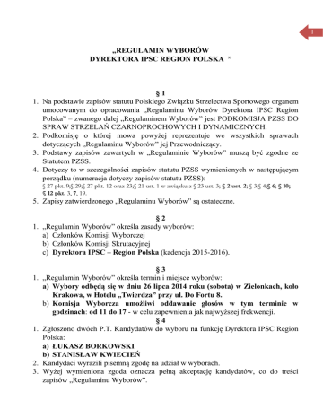 1 „REGULAMIN WYBORÓW DYREKTORA IPSC REGION POLSKA ” 1. 2. 3. 4. §1 Na podstawie zapisów statutu Polskiego Związku Strzelectwa Sportowego organem umocowanym do opracowania „Regulaminu Wyborów Dyrektora IPSC Region Polska” – zwanego dalej „Regulaminem Wyborów” jest PODKOMISJA PZSS DO SPRAW STRZELAŃ CZARNOPROCHOWYCH I DYNAMICZNYCH. Podkomisję o której mowa powyżej reprezentuje we wszystkich sprawach dotyczących „Regulaminu Wyborów” jej Przewodniczący. Podstawy zapisów zawartych w „Regulaminie Wyborów” muszą być zgodne ze Statutem PZSS. Dotyczy to w szczególności zapisów statutu PZSS wymienionych w następującym porządku (numeracja dotyczy zapisów statutu PZSS): § 27 pkt. 9;§ 29;§ 27 pkt. 12 oraz 23;§ 21 ust. 1 w związku z § 23 ust. 3; § 2 ust. 2; § 3;§ 4;§ 6; § 10; § 12 pkt. 3, 7, 19. 5. Zapisy zatwierdzonego „Regulaminu Wyborów” są ostateczne. §2 1. „Regulamin Wyborów” określa zasady wyborów: a) Członków Komisji Wyborczej b) Członków Komisji Skrutacyjnej c) Dyrektora IPSC – Region Polska (kadencja 2015-2016). 1. 1. 2. 3. §3 „Regulamin Wyborów” określa termin i miejsce wyborów: a) Wybory odbędą się w dniu 26 lipca 2014 roku (sobota) w Zielonkach, koło Krakowa, w Hotelu „Twierdza” przy ul. Do Fortu 8. b) Komisja Wyborcza umożliwi oddawanie głosów w tym terminie w godzinach: od 11 do 17 - w celu zapewnienia jak najwyższej frekwencji. §4 Zgłoszono dwóch P.T. Kandydatów do wyboru na funkcję Dyrektora IPSC Region Polska: a) ŁUKASZ BORKOWSKI b) STANISŁAW KWIECIEŃ Kandydaci wyrazili pisemną zgodę na udział w wyborach. Wyżej wymieniona zgoda oznacza pełną akceptację kandydatów, co do treści zapisów „Regulaminu Wyborów”. 4. Kadencja dla nowo wybranego Dyrektora IPSC Region Polska biegnie z dniem: 01 stycznia 2015 roku, a ulega wygaszeniu (konieczność zwołania nowych wyborów) z dniem 01 stycznia 2017 roku. a) Nowe wybory Dyrektora IPSC Region Polska powinny być zarządzone po wyborach Władz i Organów Nadzoru PZSS na kadencję 2017-2020 niezwłocznie po ich ukonstytuowaniu się. b) Od tego czasu (od dnia 01 stycznia 2017 r.) dotychczasowy Dyrektor IPSC Region Polska staje się pełniącym obowiązki Dyrektora IPSC Region Polska. 5. W przypadku rezygnacji złożonej na piśmie przez jednego z kandydatów przed dniem głosowania – ostateczną decyzję, co do przeprowadzenia wyborów (w przypadku pozostania tylko jednej kandydatury w obecnych wyborach) podejmie Przewodniczący Podkomisji PZSS do spraw strzelań czarno prochowych i dynamicznych po konsultacjach z Zarządem PZSS. 6. W przypadku rezygnacji obydwu kandydatów, kolejne wybory powinny zostać przeprowadzone do dnia 31 grudnia 2014 r. 7. W przypadku opóźnień w tym zakresie dotychczasowy Dyrektor IPSC Region Polska pozostaje pełniącym obowiązki Dyrektora IPSC Region Polska. §5 1. Na wniosek Przewodniczącego Podkomisji PZSS do spraw strzelań czarno prochowych i dynamicznych powołuje się Komisję Wyborczą. 2. Do zadań Komisji Wyborczej należy prawidłowe przeprowadzenie wyborów. 3. Komisja wyborcza liczy pięć osób. 4. W skład Komisji Wyborczej wchodzą: a) Przewodniczący Podkomisji PZSS do spraw strzelań czarno prochowych i dynamicznych – stając się z urzędu jej Przewodniczącym. b) Zastępca przewodniczącego Komisji Wyborczej. c) Dwóch członków Komisji Wyborczej (po jednym ze wskazanych przez każdego z kandydatów biorących udział w wyborach). Rezygnacja jednego z kandydatów nie uszczupla składu członków Komisji Wyborczej. d) Sekretarz Komisji Wyborczej. 5. Członkowie Komisji Wyborczej (poza jej Przewodniczącym i Sekretarzem) muszą posiadać ważne licencje PZSS dla zawodników na rok 2014 (dopuszczające formalnie udział zawodnika w strzelaniach dynamicznych) oraz mieć opłacone w sposób formalny składki członkowskie w IPSC w Kanadzie za rok 2014. 6. Niezbędne czynności techniczne na rzecz prawidłowości wyborów zabezpiecza Komisja Wyborcza pod Kierunkiem jej Przewodniczącego (karty do głosowania, protokoły, urnę, opieczętowanie dokumentów etc. oraz zakres współpracy z Komisją Skrutacyjną). 7. Karta do głosowania musi być: jednostronna, opieczętowana oraz zawierać nazwiska kandydatów (wraz z imieniem) w kolejności alfabetycznej oraz rubrykę 2 (duży kwadrat) przy każdym z nazwisk - pozwalającą oddać ważny głos poprzez x zaznaczenie wybranego kandydata (bez poprawek) – znak: . 8. Musi zostać zagwarantowana tajność wyborów (głosowania). 9. Sprawozdanie z prac Komisji Wyborczej oraz z całości Wyborów przedłoży i ogłosi w sposób zwyczajowo przewidziany w PZSS jej Przewodniczący. 1. 2. 3. 4. 5. 6. §6 Czynne i bierne prawo wyborcze (w rozumieniu zapisów niniejszego „Regulaminu Wyborczego”) ma wyłącznie ten, kto na dzień 10 lipca 2014 roku spełniał następujące wymogi formalne: a) Posiada pełną zdolność do czynności formalno-prawnych (w rozumieniu: osoba pełnoletnia), b) Posiada ważną licencję zawodnika wydaną przez PZSS, c) Opłacił składki do IPSC obowiązujące na rok 2014 – w rozumieniu: wniósł wymaganą opłatę w terminie pozwalającym na jej księgowanie na właściwym koncie dla tych wpłat najpóźniej na dzień 10 lipca 2014 roku, d) Jest członkiem klubu (lub stowarzyszenia kultury fizycznej) zarejestrowanego zgodnie z przepisami prawa i uznawanego przez PZSS w zakresie obszaru strzelectwa oraz prowadzącego statutową działalność w obszarze strzelań IPSC i mającego siedzibę na terenie RP. Weryfikacja praw wyborczych nastąpi z dniem 15 lipca 2014 roku (zamknięcie list). Podstawą dla weryfikacji uprawnionych osób będą bazy danych PZSS oraz dokumenty księgowe (np. elektroniczne zestawienie salda imiennych wpłat składek do IPSC na właściwe konto). W głosowaniu jednej osobie przysługuje jeden głos i jedna karta do głosowania. Nie przewiduje się głosowania korespondencyjnego, per proc