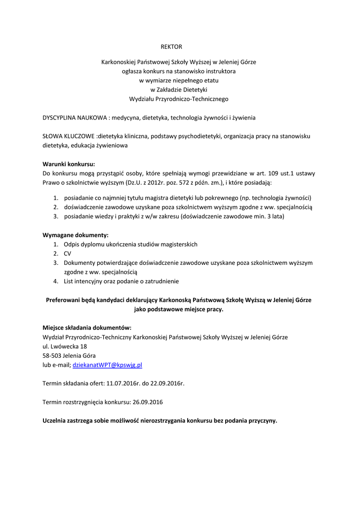 REKTOR Karkonoskiej Państwowej Szkoły Wyższej w Jeleniej Górze ogłasza konkurs na stanowisko instruktora w wymiarze niepełnego etatu w Zakładzie Dietetyki Wydziału Przyrodniczo-Technicznego DYSCYPLINA NAUKOWA : medycyna, dietetyka, technologia żywności i żywienia SŁOWA KLUCZOWE :dietetyka kliniczna, podstawy psychodietetyki, organizacja pracy na stanowisku dietetyka, edukacja żywieniowa Warunki konkursu: Do konkursu mogą przystąpić osoby, które spełniają wymogi przewidziane w art. 109 ust.1 ustawy Prawo o szkolnictwie wyższym (Dz.U. z 2012r. poz. 572 z późn. zm.), i które posiadają: 1. posiadanie co najmniej tytułu magistra dietetyki lub pokrewnego (np. technologia żywności) 2. doświadczenie zawodowe uzyskane poza szkolnictwem wyższym zgodne z ww. specjalnością 3. posiadanie wiedzy i praktyki z w/w zakresu (doświadczenie zawodowe min. 3 lata) Wymagane dokumenty: 1. Odpis dyplomu ukończenia studiów magisterskich 2. CV 3. Dokumenty potwierdzające doświadczenie zawodowe uzyskane poza szkolnictwem wyższym zgodne z ww. specjalnością 4. List intencyjny oraz podanie o zatrudnienie Preferowani będą kandydaci deklarujący Karkonoską Państwową Szkołę Wyższą w Jeleniej Górze jako podstawowe miejsce pracy. Miejsce składania dokumentów: Wydział Przyrodniczo-Techniczny Karkonoskiej Państwowej Szkoły Wyższej w Jeleniej Górze ul. Lwówecka 18 58-503 Jelenia Góra lub e-mail; [email protected] Termin składania ofert: 11.07.2016r. do 22.09.2016r. Termin rozstrzygnięcia konkursu: 26.09.2016 Uczelnia zastrzega sobie możliwość nierozstrzygania konkursu bez podania przyczyny.