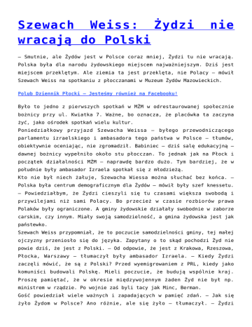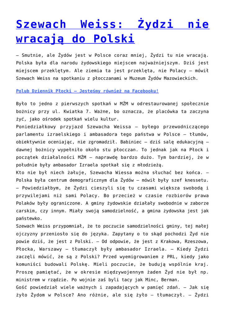 Szewach Weiss: Żydzi wracają do Polski nie – Smutnie, ale Żydów jest w Polsce coraz mniej, Żydzi tu nie wracają. Polska była dla narodu żydowskiego miejscem najważniejszym. Dziś jest miejscem przeklętym. Ale ziemia ta jest przeklęta, nie Polacy – mówił Szewach Weiss na spotkaniu z płocczanami w Muzeum Żydów Mazowieckich. Polub Dziennik Płocki – Jesteśmy również na Facebooku! Było to jedno z pierwszych spotkań w MŻM w odrestaurowanej społecznie bożnicy przy ul. Kwiatka 7. Ważne, bo oznacza, że placówka ta zaczyna żyć, jako ośrodek spotkań wielu kultur. Poniedziałkowy przyjazd Szewacha Weissa – byłego przewodniczącego parlamentu izraelskiego i ambasadora tego państwa w Polsce – tłumów, obiektywnie oceniając, nie zgromadził. Babiniec – dziś salę edukacyjną – dawnej bożnicy wypełniło około stu płocczan. To jednak jak na Płock i początek działalności MŻM – naprawdę bardzo dużo. Tym bardziej, że w południe były ambasador Izraela spotkał się z młodzieżą. Kto nie był niech żałuje, Szewacha Wiessa można słuchać bez końca. – Polska była centrum demograficznym dla Żydów – mówił były szef knessetu. – Powiedziałbym, że Żydzi cieszyli się tu czasami większa swobodą i przywilejami niż sami Polacy. Bo przecież w czasie rozbiorów prawa Polaków były ograniczone. A gminy żydowskie działały swobodnie w zaborze carskim, czy innym. Miały swoją samodzielność, a gmina żydowska jest jak państewko. Szewach Weiss przypomniał, że to poczucie samodzielności gminy, tej małej ojczyzny przeniosło się do języka. Zapytany o to skąd pochodzi Żyd nie powie dziś, że jest z Polski. – Od odpowie, że jest z Krakowa, Rzeszowa, Płocka, Warszawy – tłumaczył były ambasador Izraela. – Kiedy Żydzi zaczęli mówić, że są z Polski? Przed wyemigrowaniem z PRL, kiedy jako komuniści budowali Polskę. Mieli poczucie, że budują wspólnie kraj. Proszę pamiętać, że w okresie międzywojennym żaden Żyd nie był np. ministrem w rządzie. Po wojnie zaś byli tacy jak Minc, Berman. Gość powiedział wiele ważnych i zapadających w pamięć zdań. – Jak się żyło Żydom w Polsce? Ano różnie, ale się żyło – tłumaczył. – Żydzi wędrowali po świecie, Polska ich zaprosiła do siebie w XV i XVI wieku. I Polska stała się z czasem najważniejszym centrum demograficznym dla narodu żydowskiego. Nie przez przypadek w tym miejscu powstały niemieckie fabryki śmierci. Podkreślam słowo niemieckie, celowo je mówię. Oczywiście, że było to faszyści, proszę jednak pamiętać w styczniu 1933 blisko połowa narodu niemieckiego świadomie wybrała w demokratycznych wyborach Hitlera. Wiedzieli, kogo wybierają, on już opublikował „Mein Kampf”. Może nie zdawali sonie sprawy, że wybierają aż takie diabelstwo, nie wiedzieli, że takie diabelstwo jest możliwe w XX wieku, ale wybrali – dodawał Szewach Weiss. Po utworzeniu państwa Izrael na 120 posłów pierwszego knessetu 61 mówiło po polsku – przypomniał gość MŻM. – Biorąc pod uwagę różne pochodzenie polityczne posłów, była to jedyna większość w parlamencie. W pierwszym rządzie Izraela na 12 ministrów, sześciu mówiło po polsku. Plus sam Ben Gurion. Pamiętam przemówienie Lecha Wałęsy w knessecie w 1993 roku. Czterech ludzi zdjęło słuchawki, by pokazać, że nie muszą mieć tłumacza. Zrobiłem to ja, rabin z Łodzi, pewien pan z Lwowa, który też rozumiał i mówił po polsku. Tylko ten czwarty bez słuchawek nie rozumiał, ani nie mówił po polsku. To późniejszy premier Izraela Szymon Peres – dodał Szewach Weiss. Polansia – to miejsce, w którym spoczywa Bóg. – Smutne jest, że w dzisiejszej Polsce nie ma Żydów – nie ukrywał żalu Szewach Weiss. – Są cmentarze, zniszczone i odnowione, jest cudnie odnowiona synagoga w Płocku, ale Żydów już nie ma. Przed wojną było w Lublinie 45 tys. Żydów. Dziś jest siedmiu, za rok będzie pewnie pięciu. Jak będzie za pięć lat?
