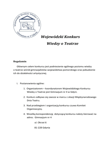 Wojewódzki Konkurs Wiedzy o Teatrze Regulamin Głównym celem konkursu jest podniesienie ogólnego poziomu wiedzy o teatrze wśród gimnazjalistów województwa pomorskiego oraz pobudzenie ich do działalności artystycznej. I. Postanowienia ogólne: 1. Organizatorem – koordynatorem Wojewódzkiego Konkursu Wiedzy o Teatrze jest Gimnazjum nr 4 w Gdyni. 2. Konkurs odbywa się zawsze w marcu z okazji Międzynarodowego Dnia Teatru. 3. Nad przebiegiem i organizacją konkursu czuwa Komitet Organizacyjny. 4. Wszelką korespondencję dotyczącą konkursu należy kierować na adres: Gimnazjum nr 4 ul. Okrzei 6 81-228 Gdynia tel. (58) 663-79-88 500061880 www.gimnazjum4.gom.pl Pytania kierować do przedstawiciela Komitetu Organizacyjnego – Aliny Zielińskiej. 5. Regulamin, formularz zgłoszeniowy i wykaz literatury będzie umieszczony na stronach internetowych: www.gimnazjum4.gom.pl oraz www.teatrszekspirowski.pl 6. Organizator nie ponosi kosztów uczestnictwa w konkursie. II. Uczestnicy: 1. Konkurs skierowany jest do wszystkich uczniów z gimnazjów województwa pomorskiego. 2. Szkołę reprezentuje 5- osobowy zespół, który musi wykazać się wiedzą oraz umiejętnością pracy w grupie. 3. Zgłoszenia należy składać na formularzu zgłoszeniowym do 20 grudnia 2010 r. III. Przebieg: 1. Konkurs jest dwuetapowy: I etap – eliminacje szkolne - do 10 grudnia 2010 r. II etap – finał wojewódzki - 26 marca 2011 r. 2. Przebieg eliminacji szkolnych: a) eliminacje szkolne są organizowane i przeprowadzane przez Szkolną Komisję Konkursową, która wyłoni 5 osobowy zespół do finału, b) eliminacje powinny się odbyć do 10 grudnia 2010 roku, c) po zakończeniu eliminacji I stopnia, Szkolne Komisje Konkursowe przysyłają do 20 grudnia 2010 r. kartę zgłoszenia uczestników (karta zgłoszenia w załączniku 1.) 3. Przebieg finału wojewódzkiego: a) eliminacje II stopnia przeprowadza Komitet Organizacyjny, b) konkurs składa się z trzech części: I część - sprawdzenie wiedzy na temat teatru antycznego i średniowiecznego (forma zależy od ilości zgłoszonych zespołów) II część - 5-8 minutowa prezentacja sceniczna dowolnego fragmentu Antygony Sofoklesa z zachowaniem wzorców antycznych (lub innej tragedii antycznej) III część - zaprezentowanie przygotowanego plakatu do utworu Antygona, c) między pierwszą a drugą częścią przewidziana jest przerwa na sprawdzenie prac i podsumowanie wyników, d) druga część finału wojewódzkiego odbywa się w obecności publiczności. 4. Pytania przygotowane przez Komitet Organizacyjny sformułowane zostaną w oparciu o podaną literaturę. Liczy się jednak również wiedza ogólna. 5. Treści: • pochodzenie tragedii i komedii, • teatr średniowieczny, • cechy teatru ateńskiego, greckiego i rzymskiego, • budowle sceniczne i scena, • utwory i przedstawiciele dramatu religijnego i świeckiego. IV. Nagrody 1. Wszyscy uczestnicy otrzymają pamiątkowe dyplomy. 2. Zostaną przyznane dyplomy i nagrody: Gdańskiego Teatru Szekspirowskiego Teatru Miejskiego w Gdyni Prezydenta Miasta Gdynia Dyrektora Gimnazjum nr 4 w Gdyni V. Współorganizatorzy, sponsorzy i przyjaciele konkursu: Wiceprezydent Miasta Gdyni Ewa Łowkiel – patronat Gdański Teatr Szekspirowski – patronat Teatr Miejski im Witolda Gombrowicza w Gdyni Młodzieżowy Dom Kultury w Gdyni. VI. Literatura: • Kudliński Tadeusz Vademecum teatromana, • Nicoll Allardyce Dzieje teatru • Podręczniki do historii i języka polskiego do gimnazjum. • Kosiński Dariusz i inni - praca zbiorowa Słownik wiedzy o teatrze (wydawnictwo ParkEdukacja) VII. Ustalenia końcowe 1. Komitet Organizacyjny ustala rodzaj dokumentacji oraz sposób jej przechowywania. 2. Regulamin, aktualne informacje dotyczące konkursu dostępne są na stronie www.gimnazjum4.gom.pl. 3. Uczestnicy konkursu wyrażają zgodę na podanie do publicznej wiadomości imienia i nazwiska oraz szkoły. Serdecznie zapraszamy wszystkich gimnazjalistów województwa pomorskiego oraz nauczycieli do udziału w Wojewódzkim Konkursie Wiedzy o Teatrze. Komitet Organizacyjny