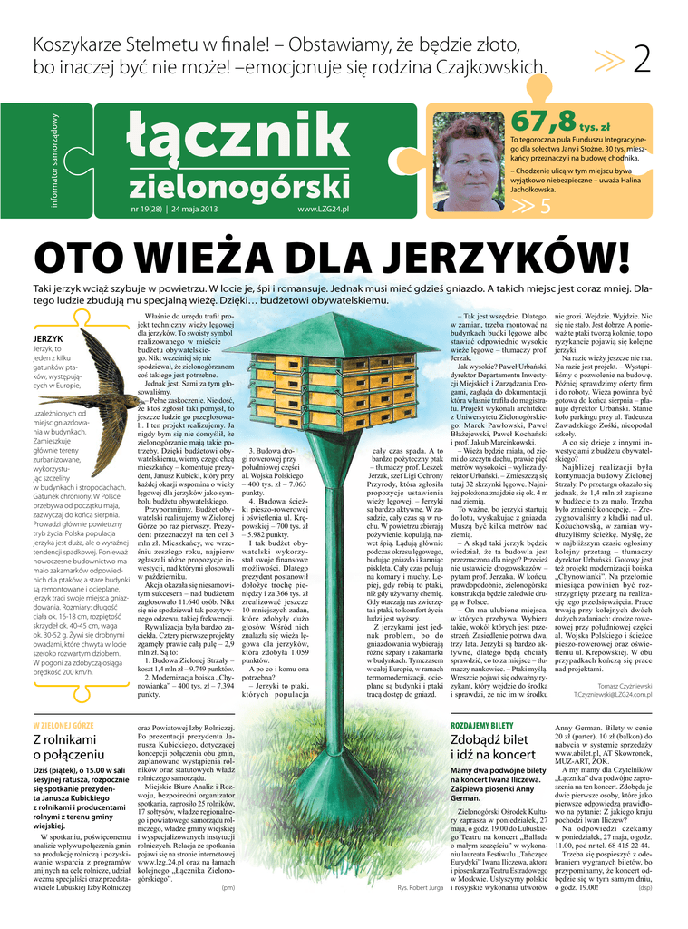 Koszykarze Stelmetu w finale! – Obstawiamy, że będzie złoto, bo inaczej być nie może! –emocjonuje się rodzina Czajkowskich. >> 2 67,8 tys. zł To tegoroczna pula Funduszu Integracyjnego dla sołectwa Jany i Stożne. 30 tys. mieszkańcy przeznaczyli na budowę chodnika. – Chodzenie ulicą w tym miejscu bywa wyjątkowo niebezpieczne – uważa Halina Jachołkowska. nr 19(28) | 24 maja 2013 >> 5 www.LZG24.pl Oto wieża dla jerzyków! Taki jerzyk wciąż szybuje w powietrzu. W locie je, śpi i romansuje. Jednak musi mieć gdzieś gniazdo. A takich miejsc jest coraz mniej. Dlatego ludzie zbudują mu specjalną wieżę. Dzięki… budżetowi obywatelskiemu. JERZYK Jerzyk, to jeden z kilku gatunków ptaków, występujących w Europie, uzależnionych od miejsc gniazdowania w budynkach. Zamieszkuje głównie tereny zurbanizowane, wykorzystując szczeliny w budynkach i stropodachach. Gatunek chroniony. W Polsce przebywa od początku maja, zazwyczaj do końca sierpnia. Prowadzi głównie powietrzny tryb życia. Polska populacja jerzyka jest duża, ale o wyraźnej tendencji spadkowej. Ponieważ nowoczesne budownictwo ma mało zakamarków odpowiednich dla ptaków, a stare budynki są remontowane i ocieplane, jerzyk traci swoje miejsca gniazdowania. Rozmiary: długość ciała ok. 16-18 cm, rozpiętość skrzydeł ok. 40-45 cm, waga ok. 30-52 g. Żywi się drobnymi owadami, które chwyta w locie szeroko rozwartym dziobem. W pogoni za zdobyczą osiąga prędkość 200 km/h. W ZIELONEJ GÓRZE Z rolnikami o połączeniu Dziś (piątek), o 15.00 w sali sesyjnej ratusza, rozpocznie się spotkanie prezydenta Janusza Kubickiego z rolnikami i producentami rolnymi z terenu gminy wiejskiej. W spotkaniu, poświęconemu analizie wpływu połączenia gmin na produkcję rolniczą i pozyskiwanie wsparcia z programów unijnych na cele rolnicze, udział wezmą specjaliści oraz przedstawiciele Lubuskiej Izby Rolniczej Właśnie do urzędu trafił projekt techniczny wieży lęgowej dla jerzyków. To swoisty symbol realizowanego w mieście budżetu obywatelskiego. Nikt wcześniej się nie spodziewał, że zielonogórzanom coś takiego jest potrzebne. Jednak jest. Sami za tym głosowaliśmy. – Pełne zaskoczenie. Nie dość, że ktoś zgłosił taki pomysł, to jeszcze ludzie go przegłosowali. I ten projekt realizujemy. Ja nigdy bym się nie domyślił, że zielonogórzanie mają takie potrzeby. Dzięki budżetowi obywatelskiemu, wiemy czego chcą mieszkańcy – komentuje prezydent, Janusz Kubicki, który przy każdej okazji wspomina o wieży lęgowej dla jerzyków jako symbolu budżetu obywatelskiego. Przypomnijmy. Budżet obywatelski realizujemy w Zielonej Górze po raz pierwszy. Prezydent przeznaczył na ten cel 3 mln zł. Mieszkańcy, we wrześniu zeszłego roku, najpierw zgłaszali różne propozycje inwestycji, nad którymi głosowali w październiku. Akcja okazała się niesamowitym sukcesem – nad budżetem zagłosowało 11.640 osób. Nikt się nie spodziewał tak pozytywnego odzewu, takiej frekwencji. Rywalizacja była bardzo zaciekła. Cztery pierwsze projekty zgarnęły prawie całą pulę – 2,9 mln zł. Są to: 1. Budowa Zielonej Strzały – koszt 1,4 mln zł – 9.749 punktów. 2. Modernizacja boiska „Chynowianka” – 400 tys. zł – 7.394 punkty. oraz Powiatowej Izby Rolniczej. Po prezentacji prezydenta Janusza Kubickiego, dotyczącej koncepcji połączenia obu gmin, zaplanowano wystąpienia rolników oraz statutowych władz rolniczego samorządu. Miejskie Biuro Analiz i Rozwoju, bezpośredni organizator spotkania, zaprosiło 25 rolników, 17 sołtysów, władze regionalnego i powiatowego samorządu rolniczego, władze gminy wiejskiej i wyspecjalizowanych instytucji rolniczych. Relacja ze spotkania pojawi się na stronie internetowej www.lzg.24.pl oraz na łamach kolejnego „Łącznika Zielonogórskiego”. (pm) 3. Budowa drogi rowerowej przy południowej części al. Wojska Polskiego – 400 tys. zł – 7.063 punkty. 4. Budowa ścieżki pieszo-rowerowej i oświetlenia ul. Krępowskiej – 700 tys. zł – 5.982 punkty. I tak budżet obywatelski wykorzystał swoje finansowe możliwości. Dlatego prezydent postanowił dołożyć trochę pieniędzy i za 366 tys. zł zrealizować jeszcze 10 mniejszych zadań, które zdobyły dużo głosów. Wśród nich znalazła się wieża lęgowa dla jerzyków, która zdobyła 1.059 punktów. A po co i komu ona potrzebna? – Jerzyki to ptaki, których populacja cały czas spada. A to bardzo pożyteczny ptak – tłumaczy prof. Leszek Jerzak, szef Ligi Ochrony Przyrody, która zgłosiła propozycję ustawienia wieży lęgowej. – Jerzyki są bardzo aktywne. W zasadzie, cały czas są w ruchu. W powietrzu zbierają pożywienie, kopulują, nawet śpią. Lądują głównie podczas okresu lęgowego, budując gniazdo i karmiąc pisklęta. Cały czas polują na komary i muchy. Lepiej, gdy robią to ptaki, niż gdy używamy chemię. Gdy otaczają nas zwierzęta i ptaki, to komfort życia ludzi jest wyższy. Z jerzykami jest jednak problem, bo do gniazdowania wybierają różne szpary i zakamarki w budynkach. Tymczasem w całej Europie, w ramach termomodernizacji, ocieplane są budynki i ptaki tracą dostęp do gniazd. – Tak jest wszędzie. Dlatego, w zamian, trzeba montować na budynkach budki lęgowe albo stawiać odpowiednio wysokie wieże lęgowe – tłumaczy prof. Jerzak. Jak wysokie? Paweł Urbański, dyrektor Departamentu Inwestycji Miejskich i Zarządzania Drogami, zagląda do dokumentacji, która właśnie trafiła do magistratu. Projekt wykonali architekci z Uniwersytetu Zielonogórskiego: Marek Pawłowski, Paweł Błażejewski, Paweł Kochański i prof. Jakub Marcinkowski. – Wieża będzie miała, od ziemi do szczytu dachu, prawie pięć metrów wysokości – wylicza dyrektor Urbański. – Zmieszczą się tutaj 32 skrzynki lęgowe. Najniżej położona znajdzie się ok. 4 m nad ziemią. To ważne, bo jerzyki startują do lotu, wyskakuj