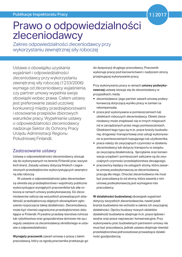 Publikacje Inspektoratu Pracy Prawo o odpowiedzialności zleceniodawcy 1 | 2017 Zakres odpowiedzialności zleceniodawcy przy wykorzystaniu zewnętrznej siły roboczej Ustawa o obowiązku uzyskania wyjaśnień i odpowiedzialności zleceniodawcy przy wykorzystaniu zewnętrznej siły roboczej (1233/2006) wymaga od zleceniodawcy wyjaśnienia, czy partner umowy wypełnia swoje obowiązki wobec prawa. Celem ustawy jest preferowanie zasad uczciwej konkurencji między przedsiębiorstwami i stosowanie przepisów zbiorowych warunków pracy. Wypełnianie ustawy o odpowiedzialności zleceniodawcy nadzoruje Sektor ds Ochrony Pracy Urzędu Administracji Regionu Południowej Finlandii. Zastosowanie ustawy Ustawę o odpowiedzialności zleceniodawcy stosuje się do wykonywanych na terenie Finlandii prac wszystkich branż. Zasady ustawy dotyczą fińskich i zagranicznych przedsiębiorstw wykorzystujących zewnętrzną siłę roboczą. W ustawie o odpowiedzialności jako zleceniodawcę określa się przedsiębiorstwa i wspólnoty publiczne wykorzystujące wynajętych pracowników lub siłę roboczą w ramach umowy podwykonawczej. Do zleceniodawców zalicza się wszystkich prowadzących działalność przedsiębiorczą objętych obowiązkiem zgłoszenia rozpoczęcia takiej działalności. Zleceniodawcą może być również zagraniczne przedsiębiorstwo działające w Finlandii. Prywatne przedsię-biorstwa rolnicze lub rybołówstwa oraz gospodarstwa domowe nie są z reguły uważane za zleceniodawcę określonego w ustawie o odpowiedzialności. Wynajęty pracownik zawarł umowę o pracę z takim pracodawcą, który za zgodą pracownika przekazuje go do dyspozycji drugiego pracodawcy. Pracownik wykonuje pracę pod kierownictwem i nadzorem strony przejmującej wykonywanie pracy. Przy wykonywaniu pracy w ramach umowy podwykonawczej ustawę stosuje się do zleceniodawcy w przypadkach, kiedy zleceniodawca i jego partner zawarli umowę podwykonawczą dotyczącą wyniku pracy w zamian za rekompensatę. praca jest wykonywana w pomieszczeniach lub obiektach roboczych zleceniodawcy. Obiekt zleceniodawcy może znajdować się w innych miejscach niż w zarządzanych przez niego pomieszczeniach. Obiektami tego typu są m.in. prace branży budowlanej, drogowej i transportowej oraz usługi wykonywane w pomieszczeniach kupującego lub użytkownika. praca należy do zwyczajnych czynności w działaniu zleceniodawcy lub dotyczy transportu w związku ze zwyczajną działalnością. Sprzątanie oraz konserwacja urządzeń i pomieszczeń zaliczane są do zwyczajnych czynności przedsiębiorstwa zlecającego. pracownicy będący na usługach strony, która zawarła umowę podwykonawczą ze zleceniodawcą pracują dla niego. Chociaż zleceniodawca nie musi być pracodawcą to od strony, która zawarła z nim umowę podwykonawczą jest wymagana rola pracodawcy. W działalności budowlanej obowiązek wyjaśnień dotyczy wszystkich zleceniodawców, nawet jeżeli branża budowlana nie wchodzi w zakres ich zwyczajnej działalności. Oprócz budowy nowych obiektów działalność budowlana obejmuje m.in. prace lądowe i wodne oraz prace naprawcze i konserwacyjne. Przy wykonywaniu prac budowlanych partnerem umowy nie musi być pracodawca, jednak ustawa obejmuje również przedsiębiorstwa jednoosobowe prowadzące działalność gosdpodarczą. Prawo o odpowiedzialności zleceniodawcy Ustawa o odpowiedzialności zleceniodawcy nie dotyczy niewielkich umów o podwykonawstwie i wynajmie pracowników. Poza zasięgiem ustawy pozostaje praca wynajmowana, trwająca w cyklu ciągłym najwyżej 10 dni roboczych oraz umowa podwykonawcza, której wartość bez podatku VAT nie przekracza 9 000 euro. Obowiązku uzyskania wyjaśnień nie można ominąć dzieląc umowę na części nie przekraczające wartości granicznych. Przy obliczaniu wartości granicznych pracę ocenia się jako ciągłą, jeżeli następuje ona na podstawie umów na następujące po sobie okresy lub o charakterze ciągłym z krótkimi przerwami. Zawartość obowiązku uzyskania wyjaśnień Przed zawarciem umowy o podwykonawstwie lub wynajmie siły roboczej zleceniodawca jest zobowiązany uzyskać następujące wyjaśnienia i zaświadczenia dotyczące partnera umowy: 1) dowód wpisu do Rejestru Przedpłat Podatkowych, Rejestru Pracodawców i Rejestru Podatników VAT 2) wyciąg z Rejestru Handlowego 3) dowód opłat podatkowych 4) dowód posiadania ubezpieczeń emerytalnych dla pracowników i płacenia składek lub wyjaśnienie o sporządzeniu umowy spłacania zaległych składek 5) wyjaśnienie dotyczące zastosowanej zbiorowej umowy o warunkach pracy lub przedstawienie głównych warunków zatrudnienia 6) wyjaśnienie dotyczące zorganizowania opieki zdrowotnej miejsca pracy 7) dowód posiadania ustawowego ubezpieczenia od wypadków (w umowach dotyczących działalności budowlanej). Zleceniodawca może sam, wykorzystując informacje zawarte w publicznym Rejestrze Dłużników Podatkowych, uzyskać wyjaśnienia dotyczące opłat podat- 2 kowch partnera umowy. Rejestr jest dostępny w systemie danych przedsiębiorstw i wspólnot (www.ytj.fi). Jeżeli w Rejestrze Dłużników Podatkowych jest wpis o zadłużeniu zleceniodawca powinien w celu wypełnienia obowiązku wyjaśnienia otrzymać dodatkowo świadectwo zadłużenia podatkowego. Jeżeli partner umowy nie należy do rejonowego Rejestru Dłużników Podatkowych (np. wspólnota zagraniczna, która nie ma swojego oddziału w Finlandii) zleceniodawca powinien dostać od partnera umowy dowód opłacania podatków i świadectwo zadłużenia podatkowego lub wyjaśnienie o sporządzeniu planu spłacania długu podatkowego. Zleceniodawca powinien zawsze formalnie ocenić, czy partner umowy ma zamiar wywiązać się z nałożonych przez prawo obowiązków płatniczych. Jeżeli zadłużenie podatkowe można uznać za znaczne i zleceniodawca powinien był wiedzieć, że strona umowy nie ma zamiaru wywiązać się z wymaganych przez prawo