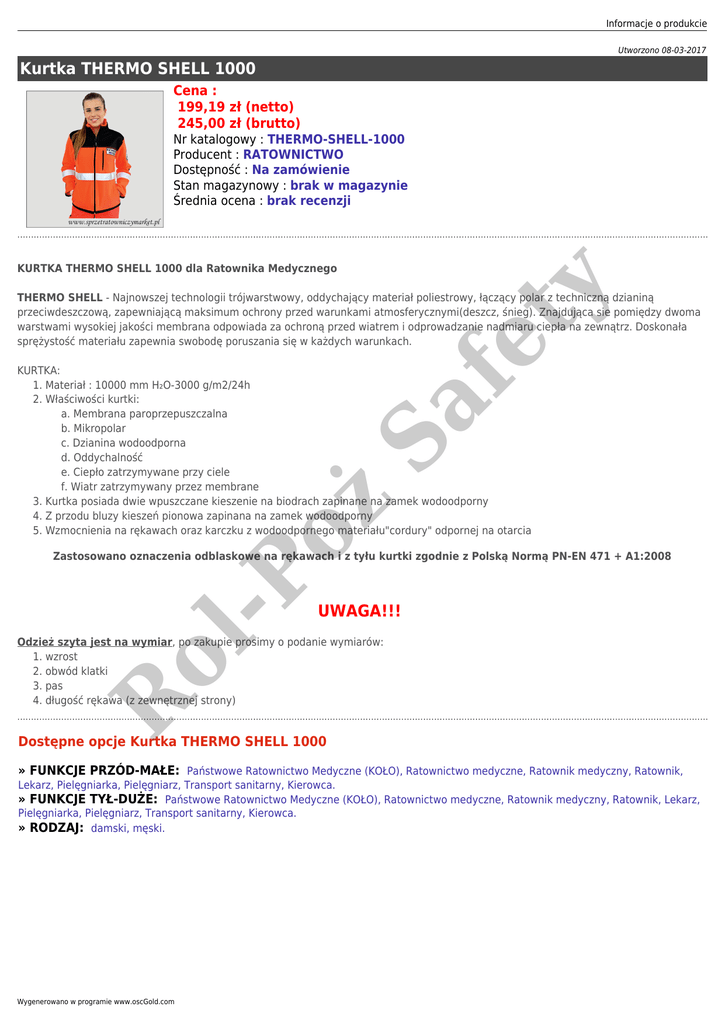 Informacje o produkcie Utworzono 08-03-2017 Kurtka THERMO SHELL 1000 Cena : 199,19 zł (netto) 245,00 zł (brutto) Nr katalogowy : THERMO-SHELL-1000 Producent : RATOWNICTWO Dostępność : Na zamówienie Stan magazynowy : brak w magazynie Średnia ocena : brak recenzji fe ty KURTKA THERMO SHELL 1000 dla Ratownika Medycznego THERMO SHELL - Najnowszej technologii trójwarstwowy, oddychający materiał poliestrowy, łączący polar z techniczną dzianiną przeciwdeszczową, zapewniającą maksimum ochrony przed warunkami atmosferycznymi(deszcz, śnieg). Znajdująca sie pomiędzy dwoma warstwami wysokiej jakości membrana odpowiada za ochroną przed wiatrem i odprowadzanie nadmiaru ciepła na zewnątrz. Doskonała sprężystość materiału zapewnia swobodę poruszania się w każdych warunkach. oż Sa KURTKA: 1. Materiał : 10000 mm H₂O-3000 g/m2/24h 2. Właściwości kurtki: a. Membrana paroprzepuszczalna b. Mikropolar c. Dzianina wodoodporna d. Oddychalność e. Ciepło zatrzymywane przy ciele f. Wiatr zatrzymywany przez membrane 3. Kurtka posiada dwie wpuszczane kieszenie na biodrach zapinane na zamek wodoodporny 4. Z przodu bluzy kieszeń pionowa zapinana na zamek wodoodporny 5. Wzmocnienia na rękawach oraz karczku z wodoodpornego materiału"cordury" odpornej na otarcia -P Zastosowano oznaczenia odblaskowe na rękawach i z tyłu kurtki zgodnie z Polską Normą PN-EN 471 + A1:2008 UWAGA!!! R ol Odzież szyta jest na wymiar, po zakupie prosimy o podanie wymiarów: 1. wzrost 2. obwód klatki 3. pas 4. długość rękawa (z zewnętrznej strony) Dostępne opcje Kurtka THERMO SHELL 1000 » FUNKCJE PRZÓD-MAŁE: Państwowe Ratownictwo Medyczne (KOŁO), Ratownictwo medyczne, Ratownik medyczny, Ratownik, Lekarz, Pielęgniarka, Pielęgniarz, Transport sanitarny, Kierowca. » FUNKCJE TYŁ-DUŻE: Państwowe Ratownictwo Medyczne (KOŁO), Ratownictwo medyczne, Ratownik medyczny, Ratownik, Lekarz, Pielęgniarka, Pielęgniarz, Transport sanitarny, Kierowca. » RODZAJ: damski, męski. Wygenerowano w programie www.oscGold.com