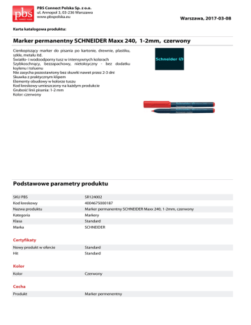 PBS Connect Polska Sp. z o.o. ul. Annopol 3, 03-236 Warszawa www.pbspolska.eu Warszawa, 2017-03-08 Karta katalogowa produktu: Marker permanentny SCHNEIDER Maxx 240, 1-2mm, czerwony Cienkopiszący marker do pisania po kartonie, drewnie, plastiku, szkle, metalu itd. Światło- i wodoodporny tusz w intensywnych kolorach Szybkoschnący, bezzapachowy, nietoksyczny - bez dodatku ksylenu i toluenu Nie zasycha pozostawiony bez skuwki nawet przez 2-3 dni Skuwka z praktycznym klipem Elementy obudowy w kolorze tuszu Kod kreskowy umieszczony na każdym produkcie Grubość linii pisania: 1-2 mm Kolor: czerwony Podstawowe parametry produktu SKU PBS SR124002 Kod kreskowy 4004675000187 Nazwa produktu Marker permanentny SCHNEIDER Maxx 240, 1-2mm, czerwony Kategoria Markery Klasa Standard Marka SCHNEIDER Certyfikaty Nowy produkt w ofercie Standard Hit Standard Kolor Kolor Czerwony Cecha Produkt Marker permenentny PBS Connect Polska Sp. z o.o. ul. Annopol 3, 03-236 Warszawa www.pbspolska.eu Warszawa, 2017-03-08 Karta katalogowa produktu cd. Marker permanentny SCHNEIDER Maxx 240, 1-2mm, czerwony Podstawowe parametry produktu Typ Okrągły Rodzaj Do 72h bez skuwki W ofercie od 2015-01 Wymiary Grubość linii (mm) 1-2 Końcówka (mm) 1-2 Wspólny słownik zamówień CPV 30192125-3 Pisaki Jednostki logistyczne Opakowanie 1 10 szt Opakowanie 2 400 szt Opakowanie 3 27200 szt